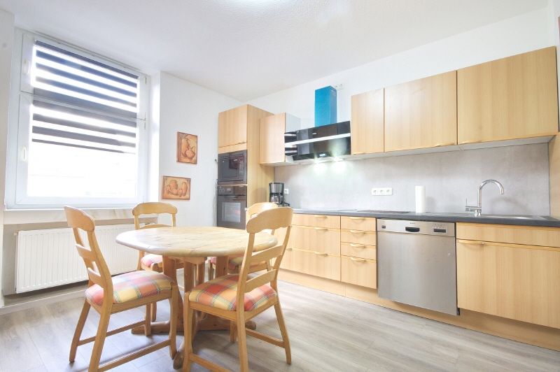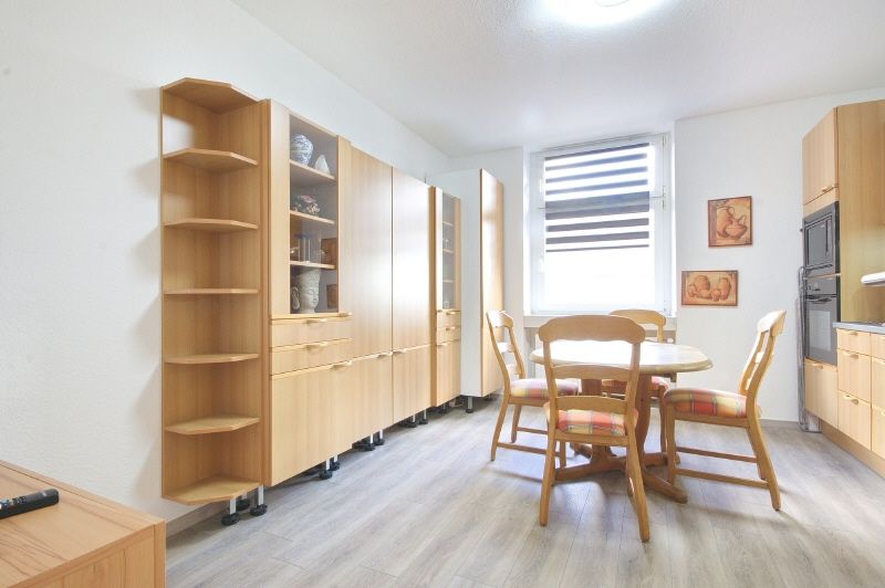 Moderne Ausstattung mit Laminatboden. Wohnküche mit Einbauküchenzeile, Kühlschrank, Ceranherd, Backofen, Mikrowelle, Geschirr, sowie Esstisch für bis zu 4 Personen und DVB-T-TV. Ein Abstellraum mit Waschmaschine und Trockner steht bereit. Zwei Schlafzimmer jeweils mit einem 1,60m breiten Bett. Weiß gefliestes Duschbad. Bettwäsche und Handtücher werden gestellt. Wäschewechsel und 14-tägige Reinigung sind inklusive. Internetzugang vorhanden.
