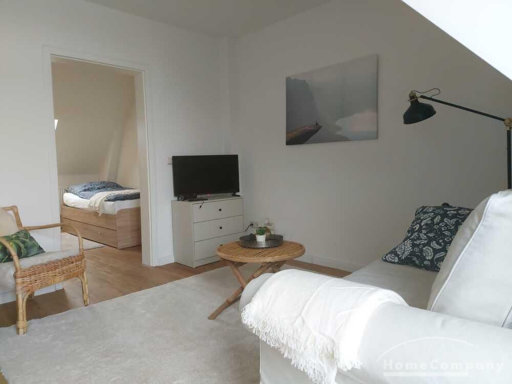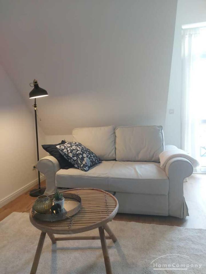 Moderne Wohnung im DG eines Mehrfamilienhauses mit BALKON, Wohnraum mit ausziehbarer Couch, TV, Anrichte, Schlafzimmer mit Bett 1,40 m breit, Kleiderschrank, Küche mit Waschmaschine und Geschirrspüler, DU/WC, WLAN vorh. Parkplatz auf dem Hof
