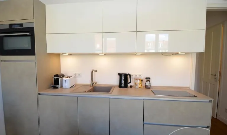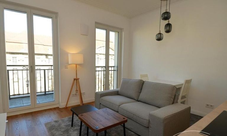 früherer Zeiten. Die moderne Wohnung ist dank der bodentiefen Fenster sehr hell. Sie ist mit hochwertigen Parkettböden und Fußbodenheizung ausgestattet. Im Eingangsbereich befindet sich ein