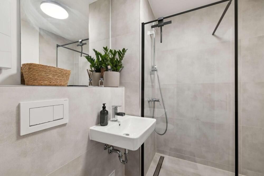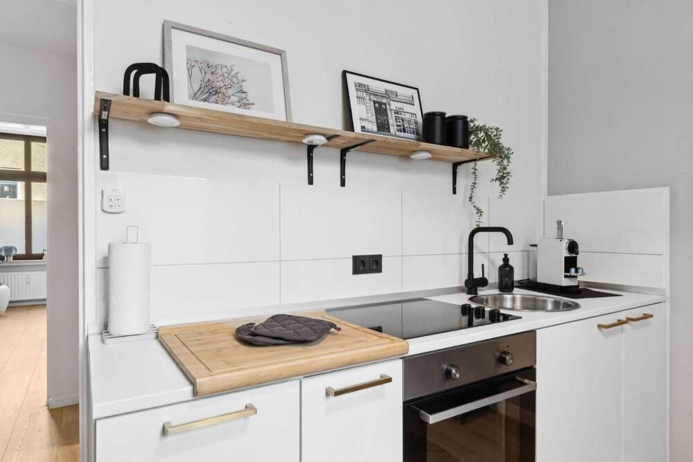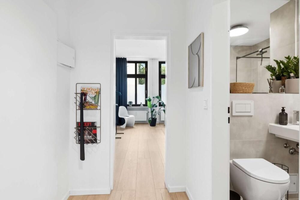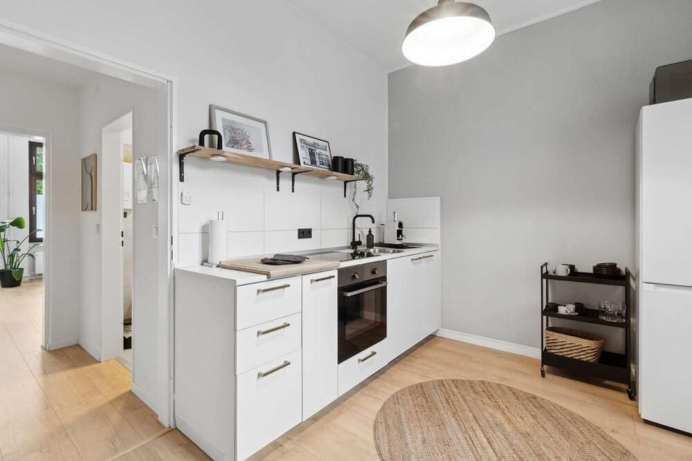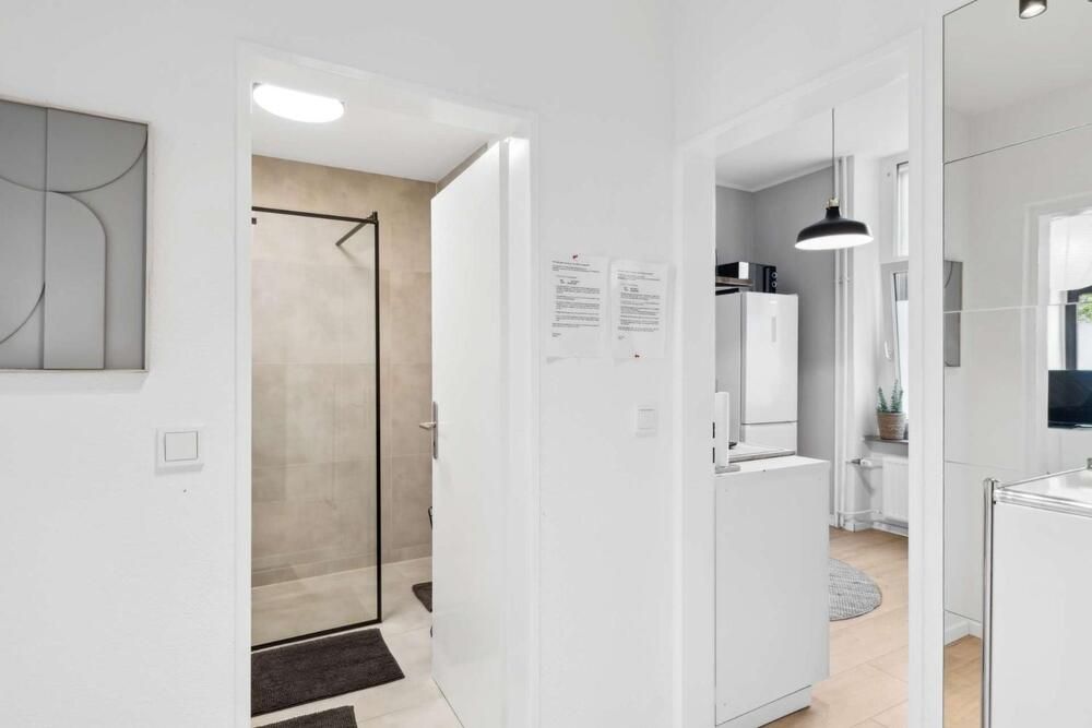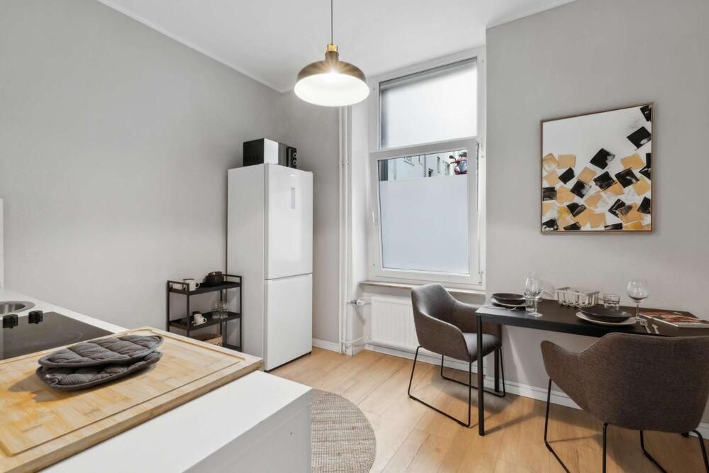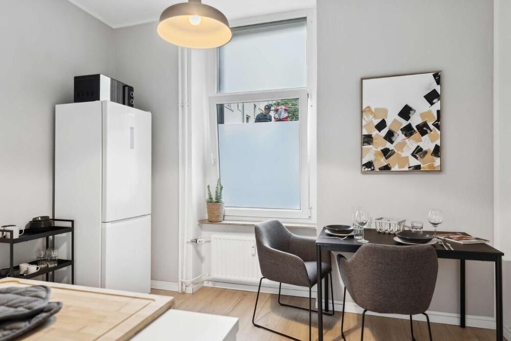 Liebhaber von gepflegten Altbauten werden sich hier wohlfühlen! Diese modern gestaltete Wohnung wurde komplett renoviert und sehr geschmackvoll eingerichtet, der Boden ist mit einem pflegeleichten Vinylboden in Holzoptik ausgelegt. Das Apartment bietet einen Wohn/Schlafraum mit einem Doppelbett (1,60 x 2,00m), einen Kleiderschrank und ein Sideboard mit TV-Gerät. Die moderne Einbauküche lässt keine Wünsche offen: sie bietet ein Ceranfeld mit Backofen, eine Spülmaschine, eine Kühl-Gefrierkombination und einen Essplatz für 2 Personen. Geschirr und Kochutensilien werden hier zur Verfügung gestellt. Ein Highlight ist das neue Badezimmer mit grauen Fliesen, einer schwarzen Duschkabine und einem Hänge-WC. Handtücher und Bettwäsche werden gestellt, eine Waschmaschine und ein Wäschetrockner zur Mitbenutzung stehen in einem Abstellraum bereit. Der Bewohner darf eine Gemeinschafts-Terrasse mitbenutzen. Der Mietpreis beträgt € 1000,00 für eine Person inklusive aller Energie- und Nebenkosten und der Internet – Nutzung (100Mbit Leitung). Der Mietpreis für 2 Personen beträgt € 1150,00. Die Endreinigung zahlt der Mieter. Sie erfolgt nach Aufwand und wird mit € 35,00 pro Stunde abgerechnet.