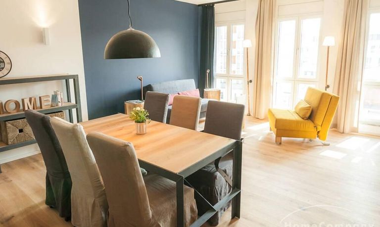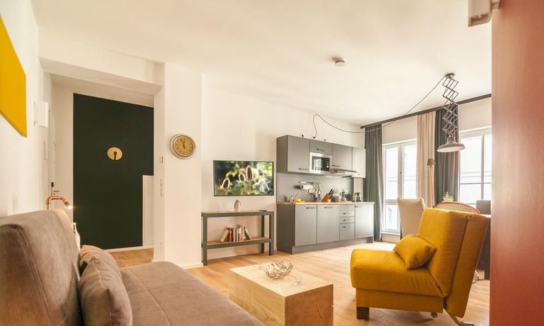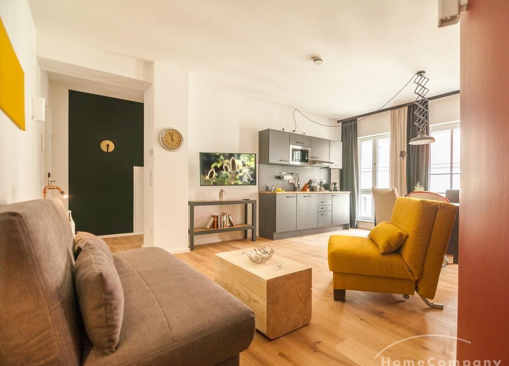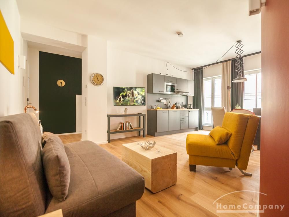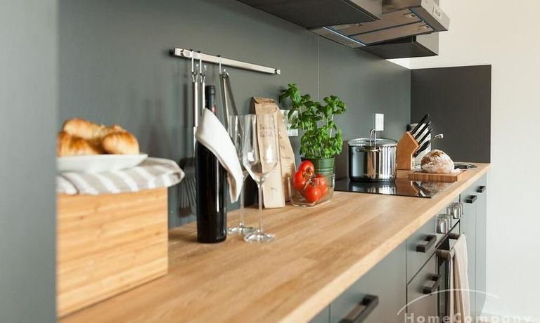 • Jedes Design-Apartment verfügt über eine voll ausgestattete Küchenzeile und Eichenholzböden.