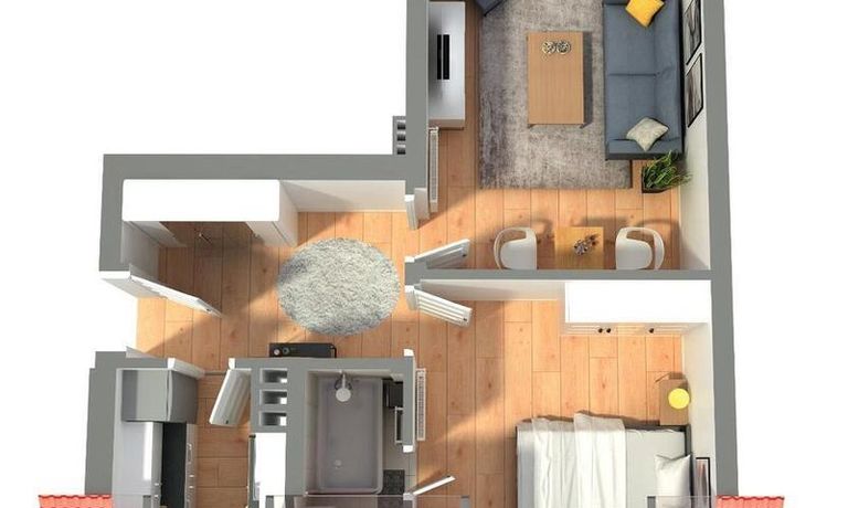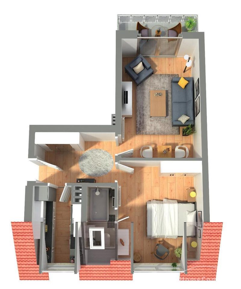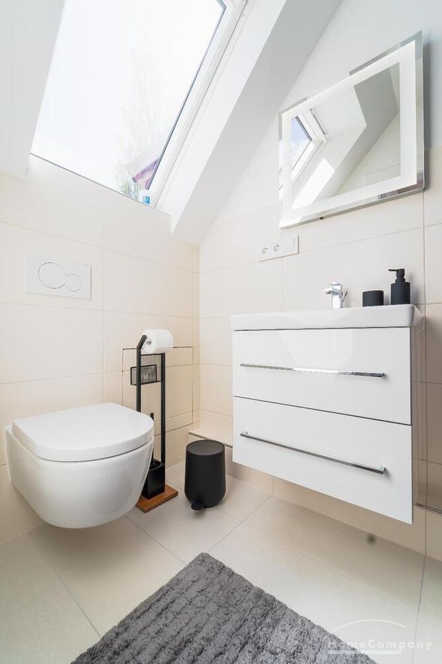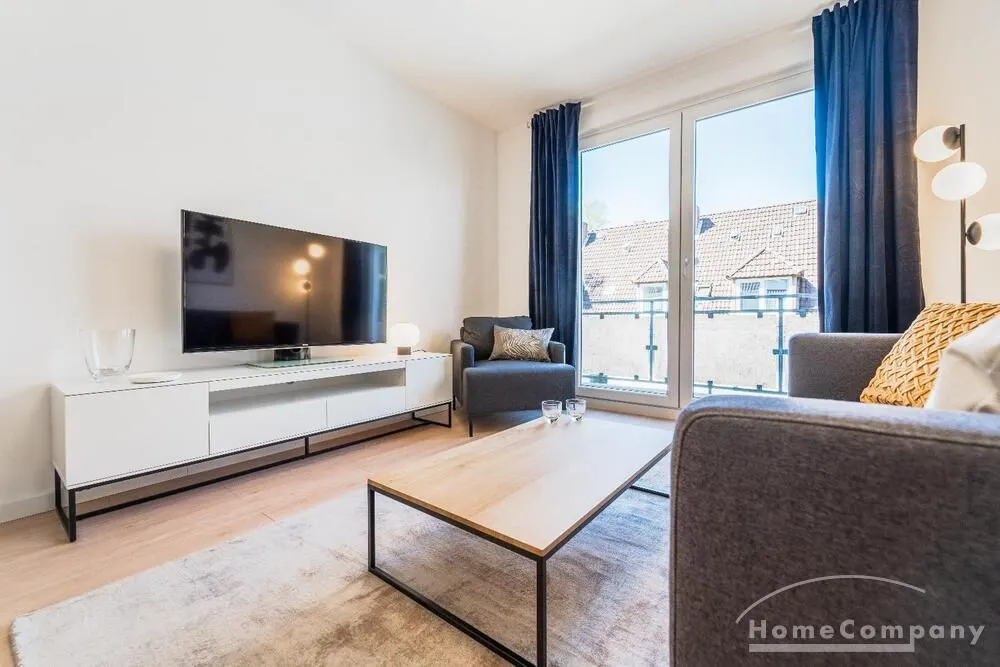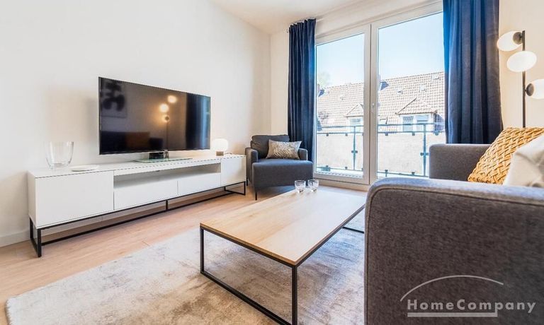 Das Wohnzimmer hat einen zur Südseite ausgerichteten Balkon mit großen bodentiefen Glasflügeltüren. Sofa und Sessel sind in grau gehalten und harmonieren perfekt miteinander. Elemente aus Holz und hochwertigen Textilien bringen behaglichen Wohnkomfort. Wohn- und Esszimmer gehen ineinander über. Im Wohnzimmer sowie wie im Schlafzimmer sind die Lampen dimmbar. Im Wohnzimmer steht ein internetfähiger TV über WLAN zur Verfügung. Weiterhin befinden sich im Wohnzimmer zwei LAN Anschlüsse. Ein weiterer LAN Anschluss ist im Schlafzimmer. In der Küche sind Qualitätsküchengeräte eingebaut. Die große Tiefkühlkombination erleichtert durch den großen Gefrierteil die Einkaufsplanung. In die Küche ist eine Wasch- Trocknermaschine integriert. Zusätzlich kann ein Trockenraum im Haus genutzt werden. Der Flur bietet viel Stauraum und wirkt durch die Spiegel mit der Wandbeleuchtung sehr großzügig. Die Wohnungseingangstür verfügt über einen Querbalken mit einem zweiten Schloss. Das Schlafzimmer ist mit einem 1,60 Bett eingerichtet und direkt an das „En Suite“ Badezimmer angeschlossen. Das gesamte Badezimmer ist mit hochwertigen “Villeroy und Boch“ Objekten sowie Villeroy und Boch“ Wand- und Bodenfließen ausgestattet. Eine Handtuchheizung gibt nach dem Duschen ein wohlig warmes Gefühl. Schnelles 100 Mbit Internet ist im Mietpreis enthalten. Der Garten der Eigentümergemeinschaft kann genutzt werden. Im Haus befindet sich ein Fahrradkeller.
