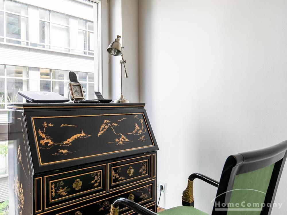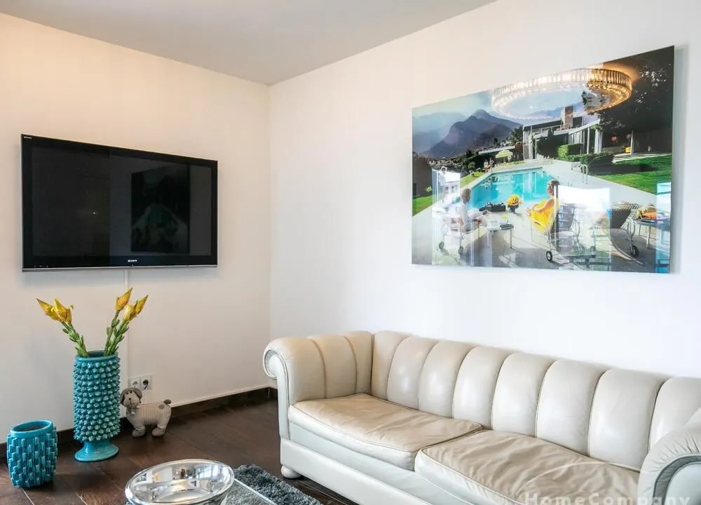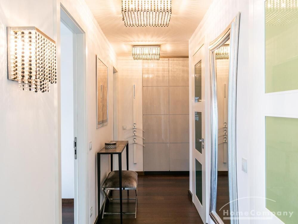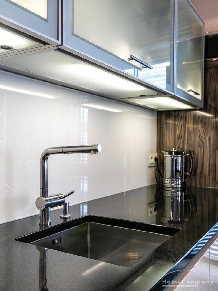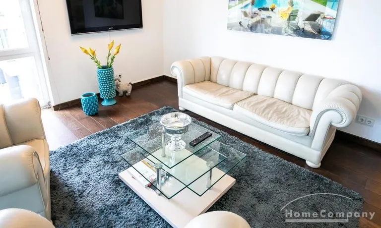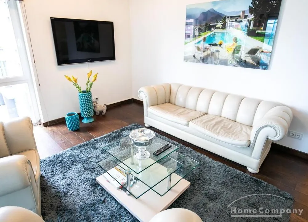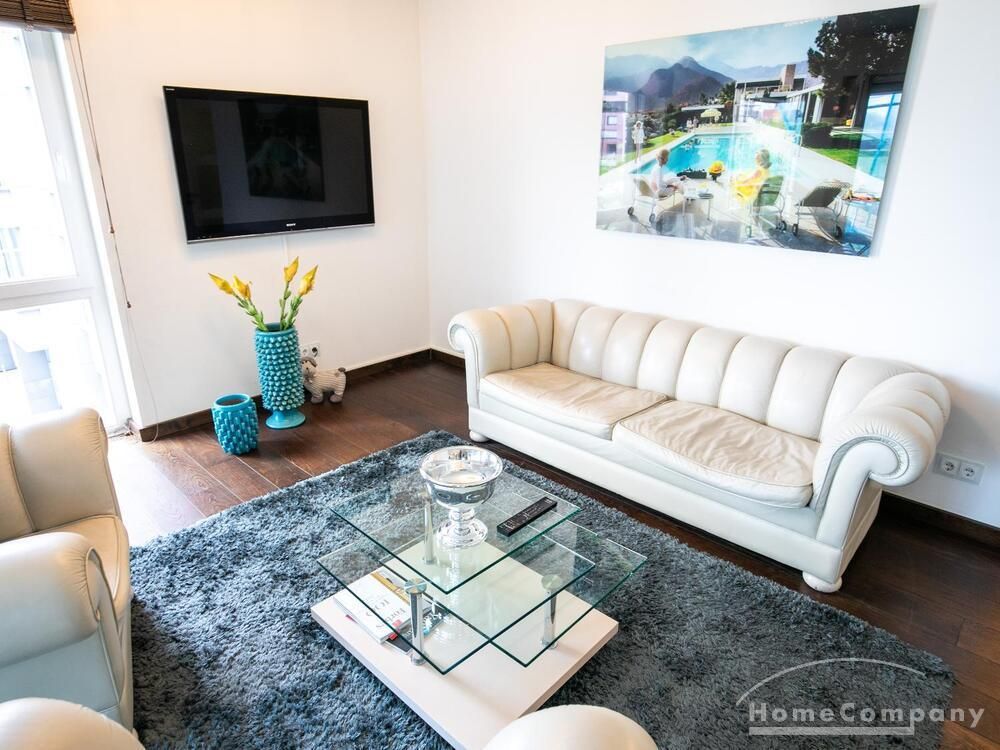 Ein Fahrradstellplatz im Keller kann genutzt werden. Das Wohnzimmer besitzt große Glasfronten zum Balkon und ist vollständig ausgestattet. Der Raum ist mit einer weißen Ledercouchgarnitur (Sofa und Sessel), einem Couchtisch, einem großen Flat-TV und einer MP3-Docking Station ausgestattet. Die hochwertige, offene Küche hat einem Esstresen und 3 Barhocker. Im Schlafzimmer befindet sich ein großes Doppelbett (180×200 cm) und ein Kleiderschrank. Das Arbeitszimmer ist mit einem Sekretär, einem dazu passenden Stuhl und einem weiteren Kleiderschrank möbliert. Das Badezimmer verfügt über eine Badewanne, eine separate Dusche, WC und Fußboden- und Handtuchheizung. Für mehr Tageslicht wurde ein Glasfenster oberhalb der Badewanne eingebaut. Die Waschmaschine befindet sich in der Abstellkammer. Die möblierte Wohnung ist für maximal 2 Personen geeignet. Ein Internetanschluss (WLAN) kann genutzt werden.