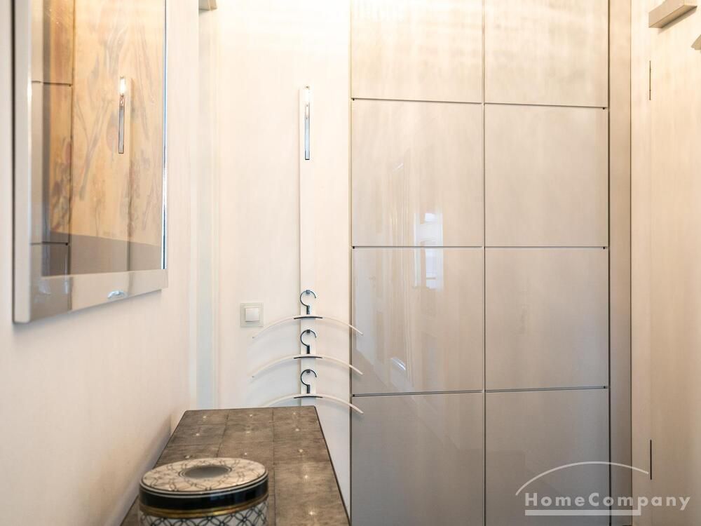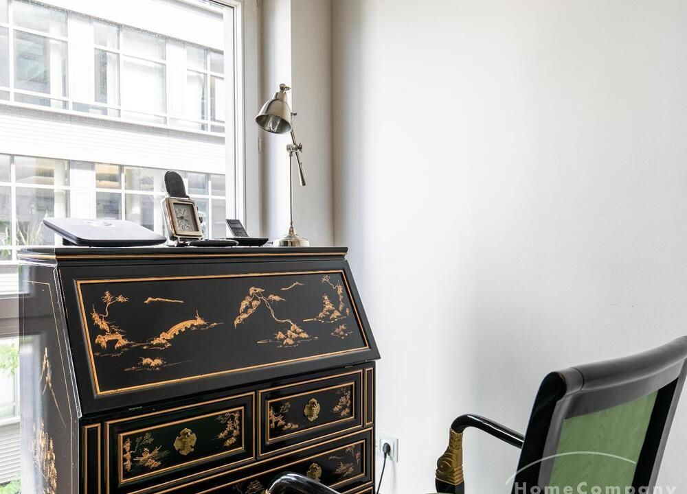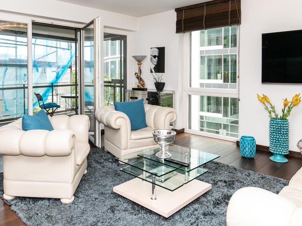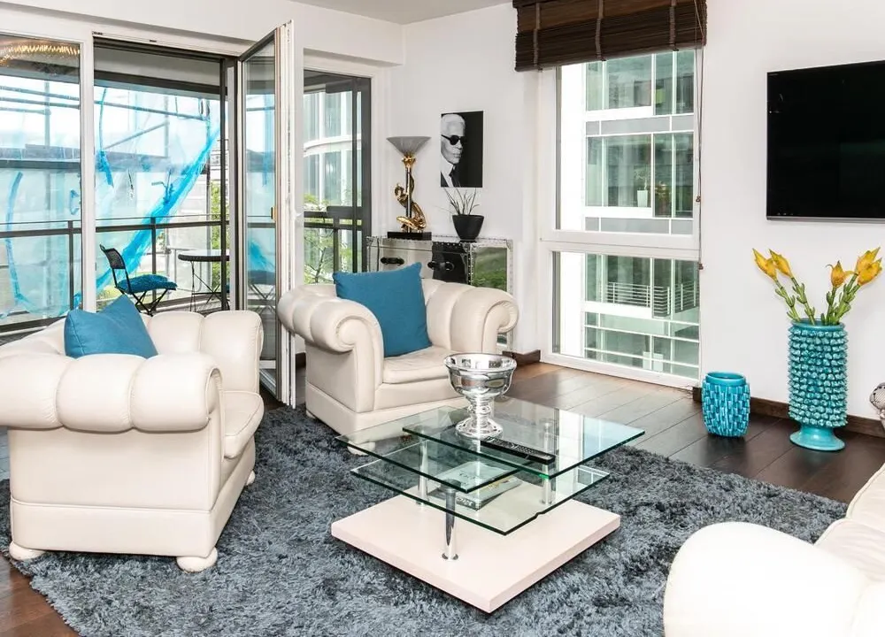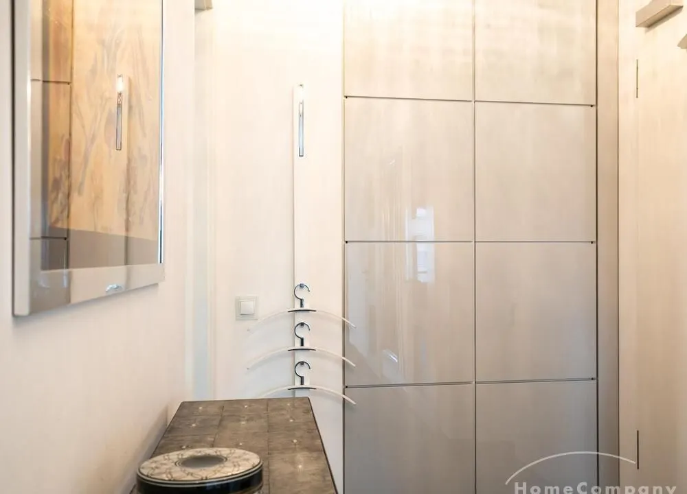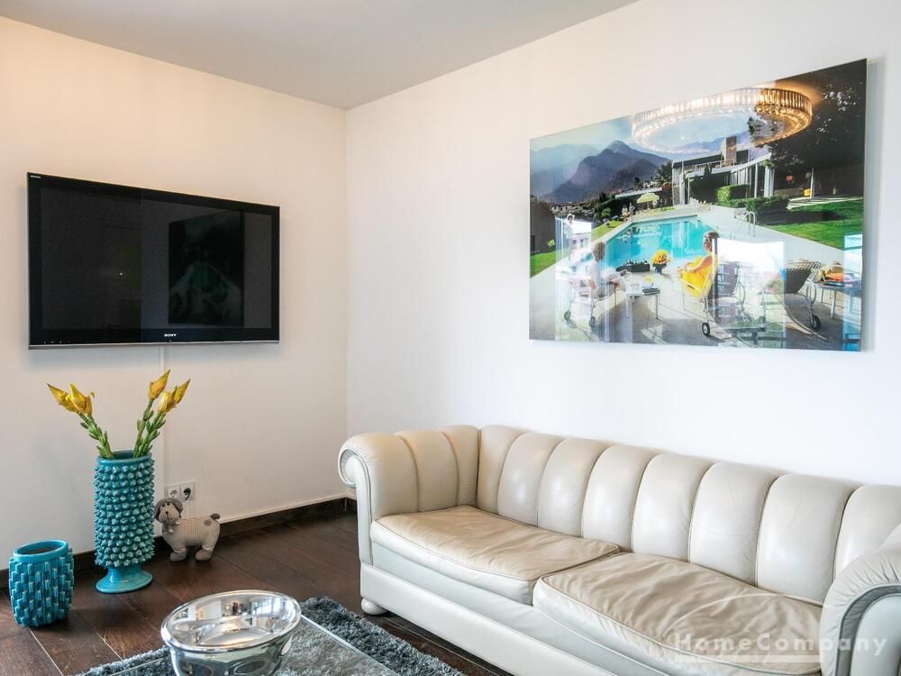 Ein Fahrradstellplatz im Keller kann genutzt werden. Das Wohnzimmer besitzt große Glasfronten zum Balkon und ist vollständig ausgestattet. Der Raum ist mit einer weißen Ledercouchgarnitur (Sofa und Sessel), einem Couchtisch, einem großen Flat-TV und einer MP3-Docking Station ausgestattet. Die hochwertige, offene Küche hat einem Esstresen und 3 Barhocker. Im Schlafzimmer befindet sich ein großes Doppelbett (180×200 cm) und ein Kleiderschrank. Das Arbeitszimmer ist mit einem Sekretär, einem dazu passenden Stuhl und einem weiteren Kleiderschrank möbliert. Das Badezimmer verfügt über eine Badewanne, eine separate Dusche, WC und Fußboden- und Handtuchheizung. Für mehr Tageslicht wurde ein Glasfenster oberhalb der Badewanne eingebaut. Die Waschmaschine befindet sich in der Abstellkammer. Die möblierte Wohnung ist für maximal 2 Personen geeignet. Ein Internetanschluss (WLAN) kann genutzt werden.