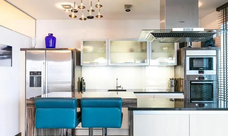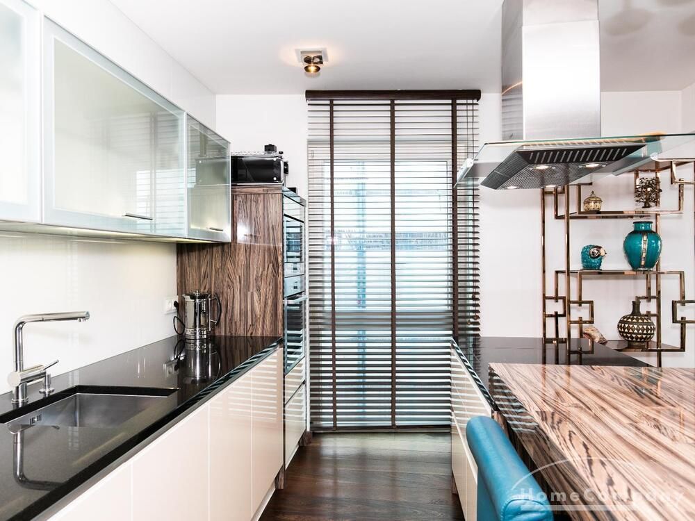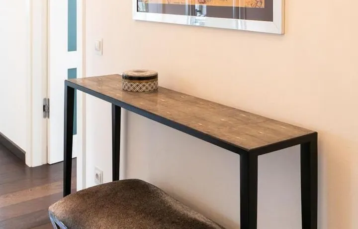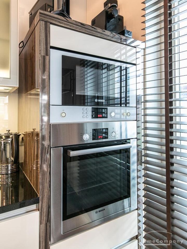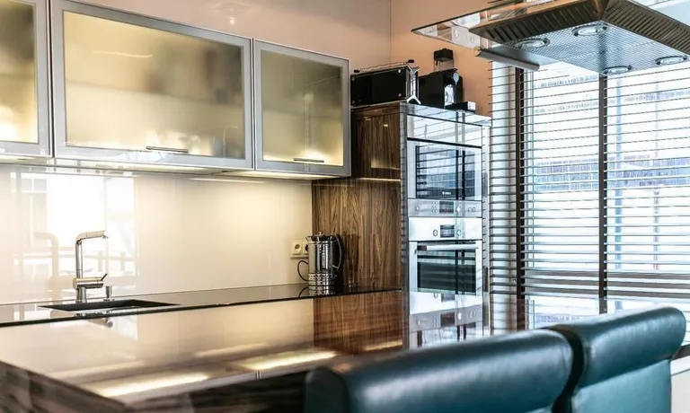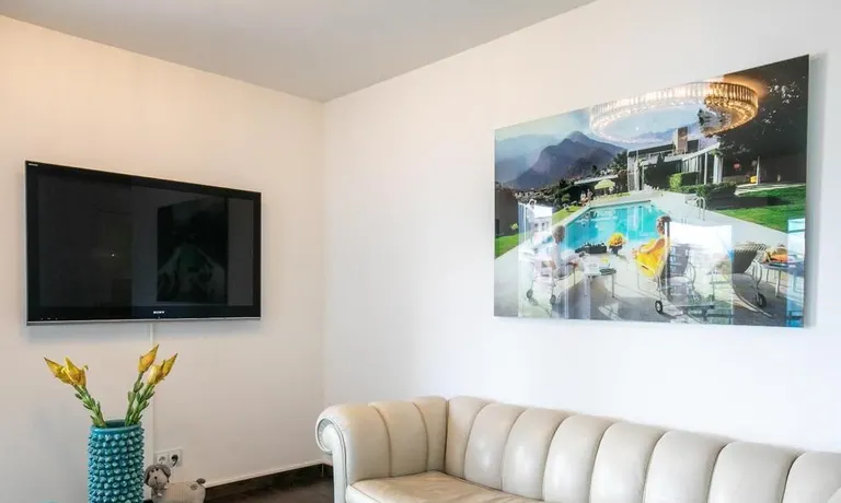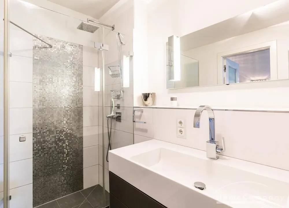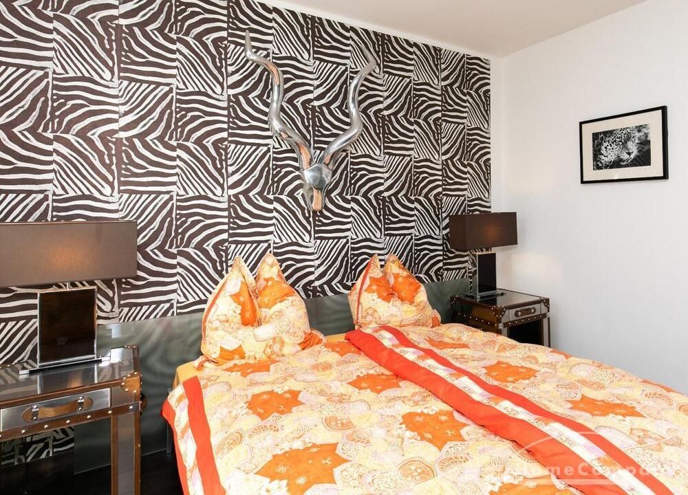 Ein Fahrradstellplatz im Keller kann genutzt werden. Das Wohnzimmer besitzt große Glasfronten zum Balkon und ist vollständig ausgestattet. Der Raum ist mit einer weißen Ledercouchgarnitur (Sofa und Sessel), einem Couchtisch, einem großen Flat-TV und einer MP3-Docking Station ausgestattet. Die hochwertige, offene Küche hat einem Esstresen und 3 Barhocker. Im Schlafzimmer befindet sich ein großes Doppelbett (180×200 cm) und ein Kleiderschrank. Das Arbeitszimmer ist mit einem Sekretär, einem dazu passenden Stuhl und einem weiteren Kleiderschrank möbliert. Das Badezimmer verfügt über eine Badewanne, eine separate Dusche, WC und Fußboden- und Handtuchheizung. Für mehr Tageslicht wurde ein Glasfenster oberhalb der Badewanne eingebaut. Die Waschmaschine befindet sich in der Abstellkammer. Die möblierte Wohnung ist für maximal 2 Personen geeignet. Ein Internetanschluss (WLAN) kann genutzt werden.