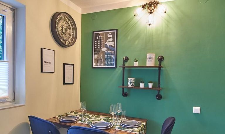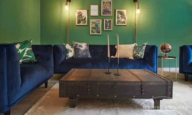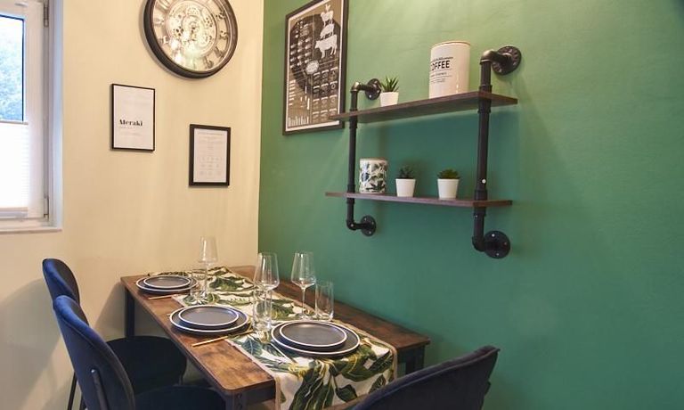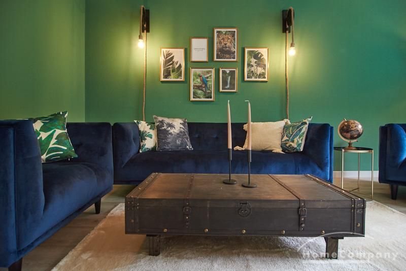Im Wohnzimmer steht ein sehr komfortabler Sofabereich in Marineblau. Der Esstisch aus Holz- und schwarzen Metallelementen lädt zum plaudern oder zum gemeinsamen Essen in entspannter Atmosphäre ein. Angrenzend an das Wohnzimmer liegt der Balkon.