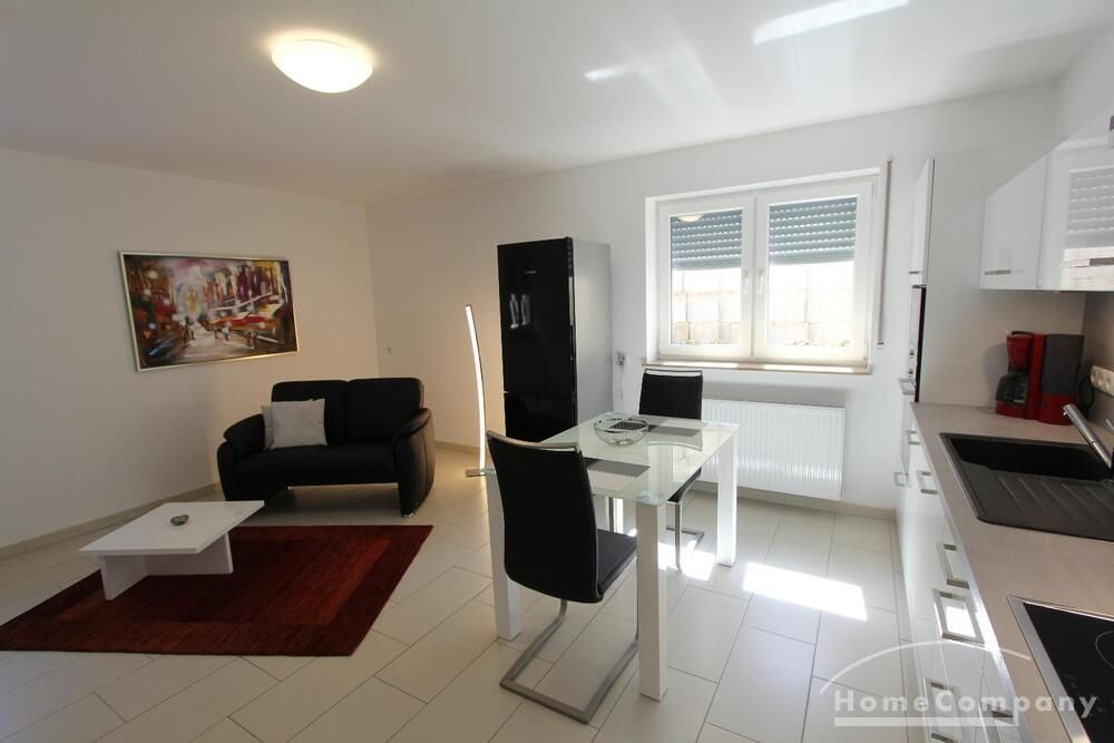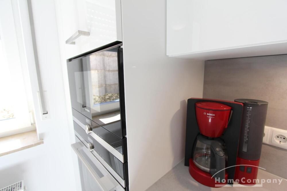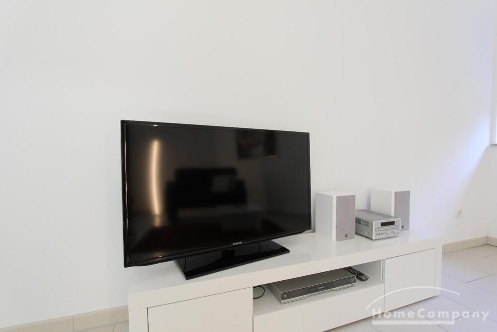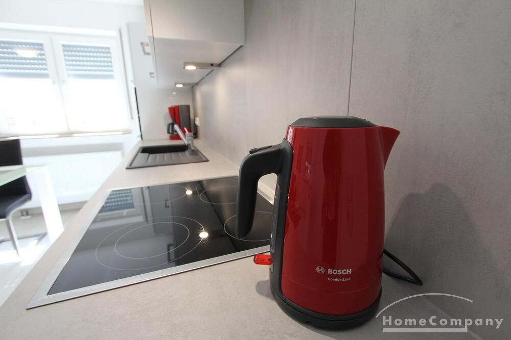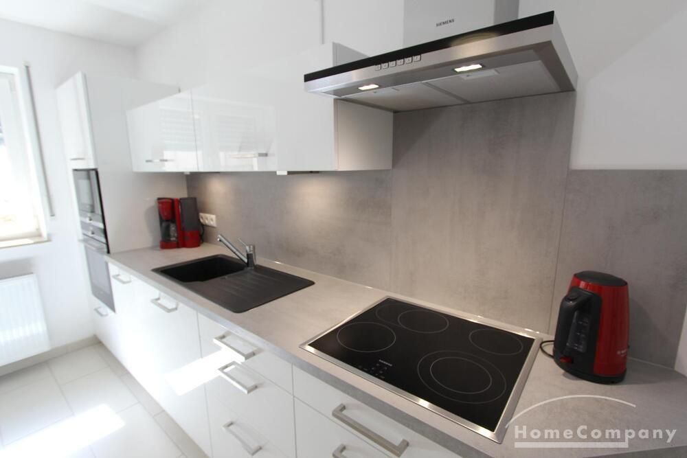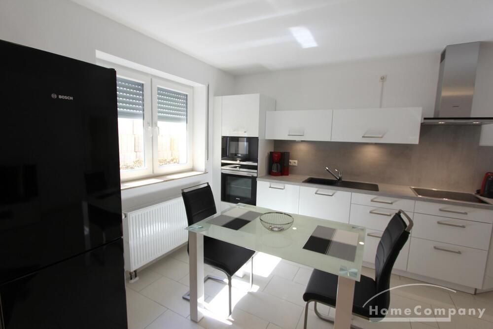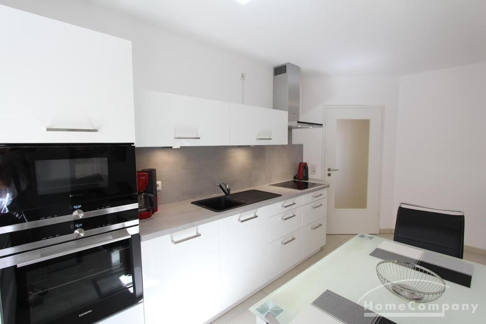 Das Herzstück der Wohnung ist die Wohnküche mit einem gemütlichen Ledersofa, Flachbildfernseher und einer voll ausgestatteten, integrierten Einbauküche (weiße Lack-Front) mit Glas-Esstisch.