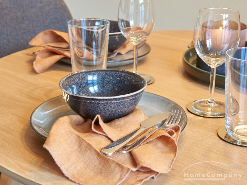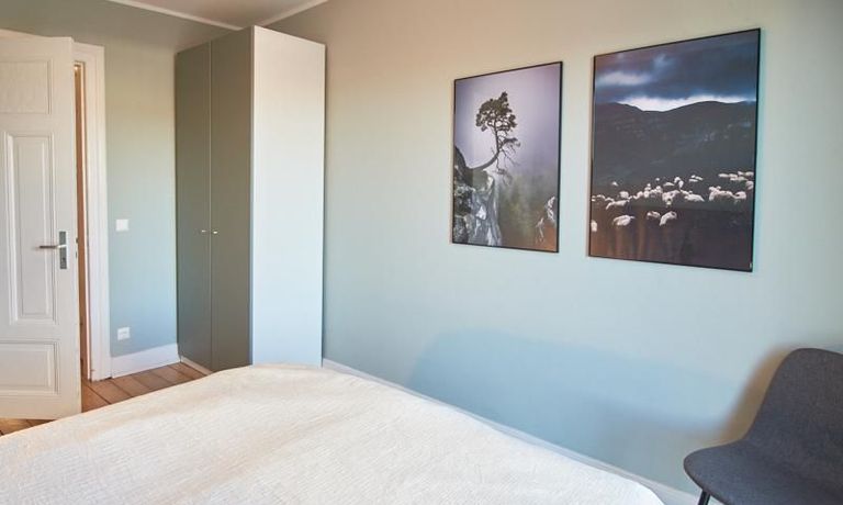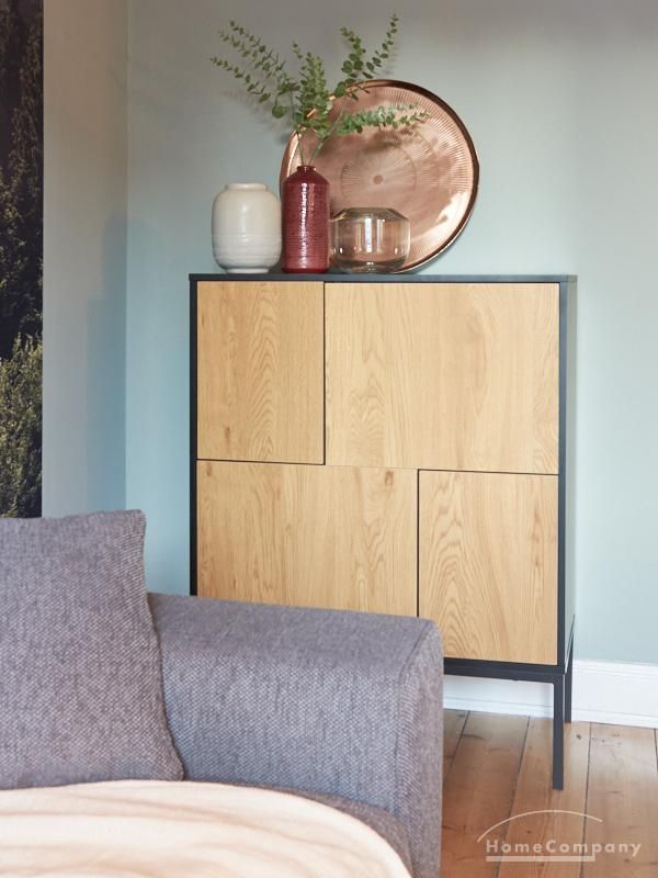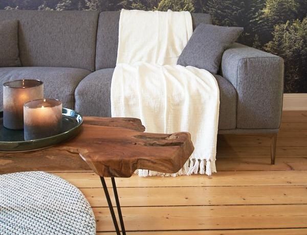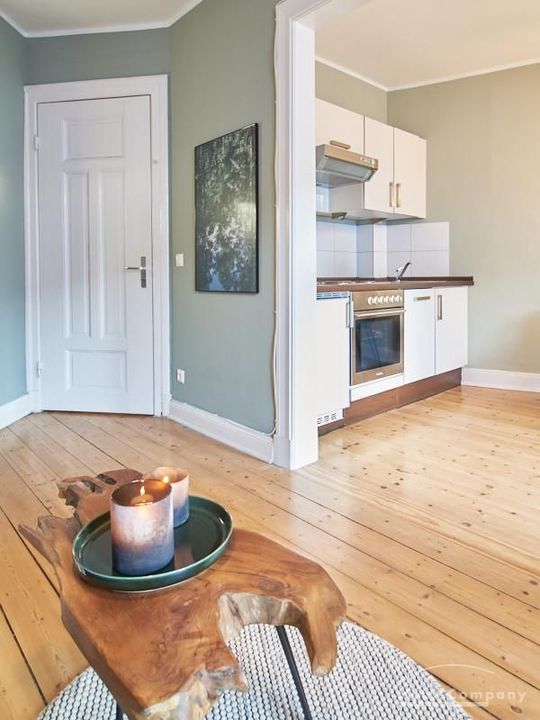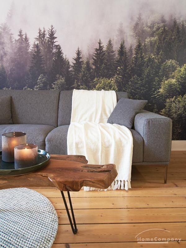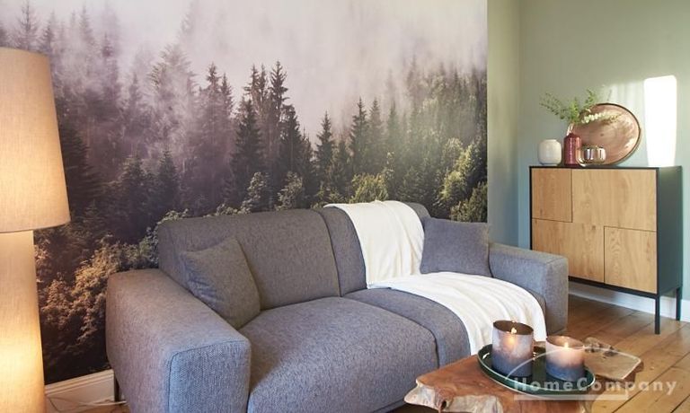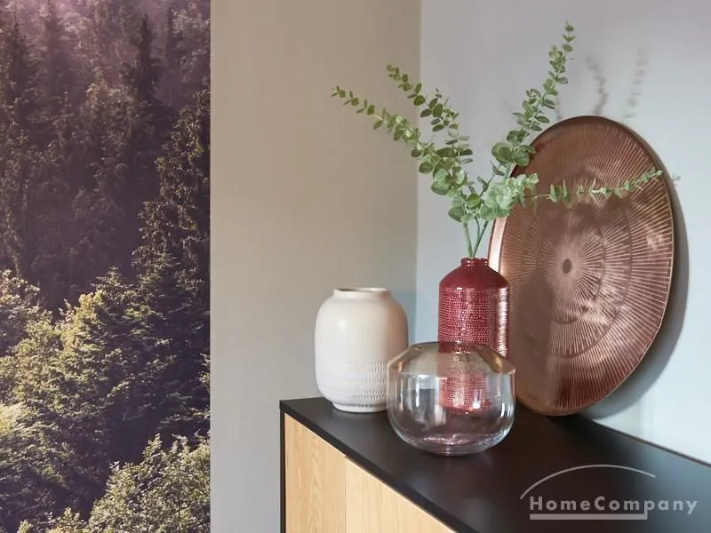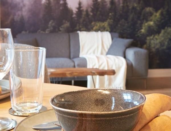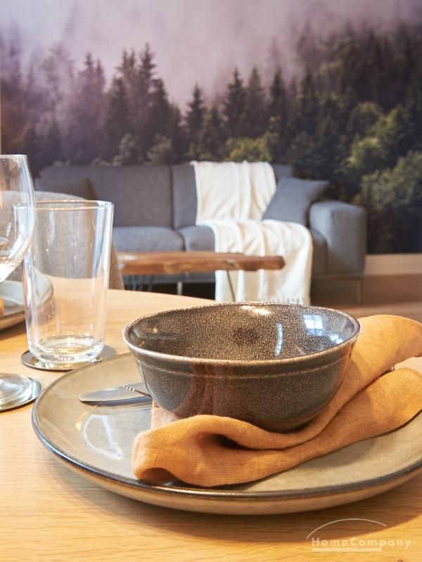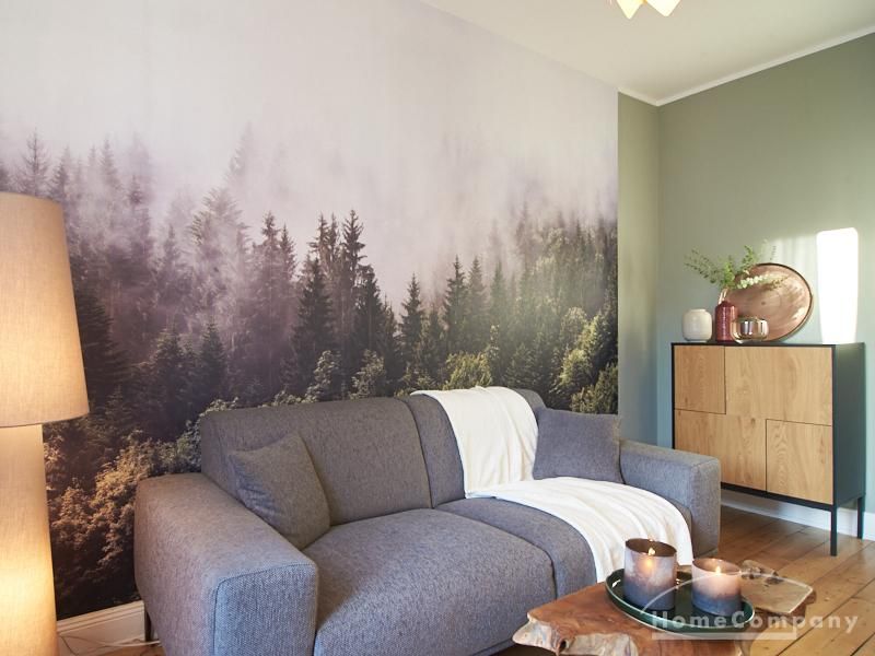 Der Einrichtungsstil „Cozy Nature“ beruht auf der Verwendung natürlicher Materialien wie Leder, Massivholz und Leinen. Diese Elemente verleihen Wärme, Ruhe und Behaglichkeit und bilden gleichzeitig einen spannenden Kontrast zu modernen und maskulinen Möbeln mit schwarzen Akzenten. Ein besonderes Highlight ist die Fototapete im Wohnbereich. Rauchige Grün- und Blautöne ergeben ein harmonisches Farbkonzept an den Wänden, welches das Natur-Thema weiterführt. Zitate aus der Natur, wie Fotografien oder die Tapete mit Waldmotiv runden das Design ab und verleihen ein einzigartiges Wohngefühl. Im Schlafzimmer steht ein 1,60 m breites Boxspringbett und ein großer Kleiderschrank zur Verfügung. Die helle, offene Küche mit Essbereich geht in den Wohnbereich über.