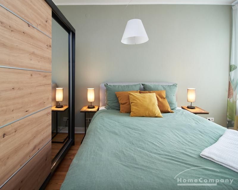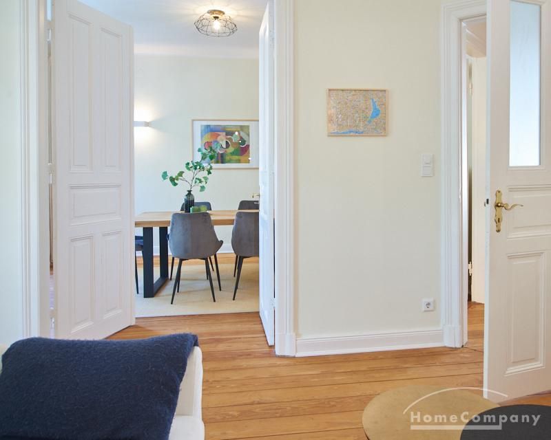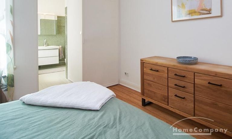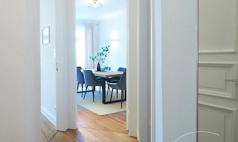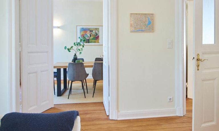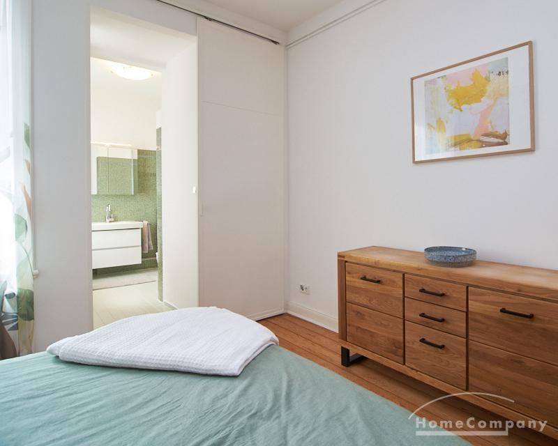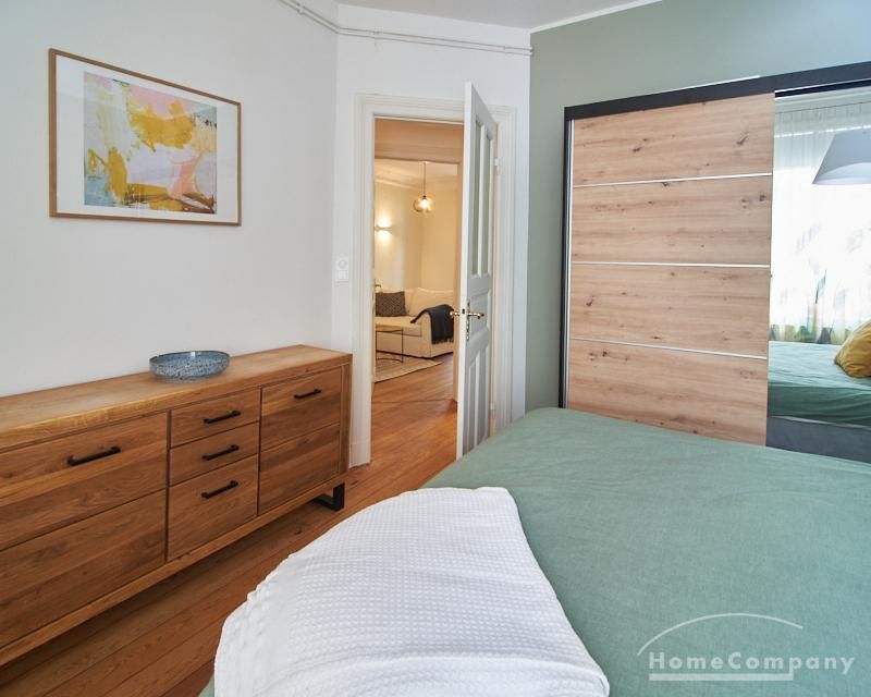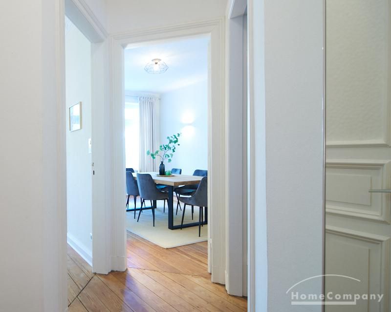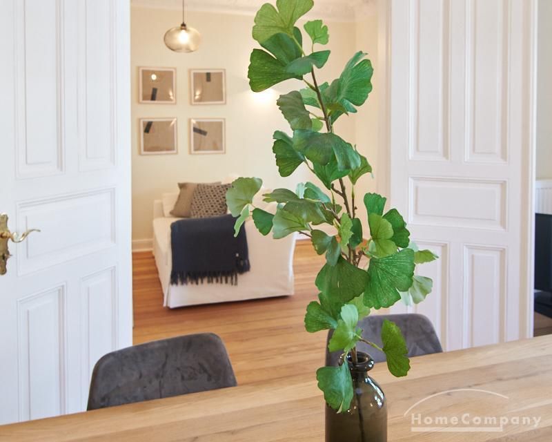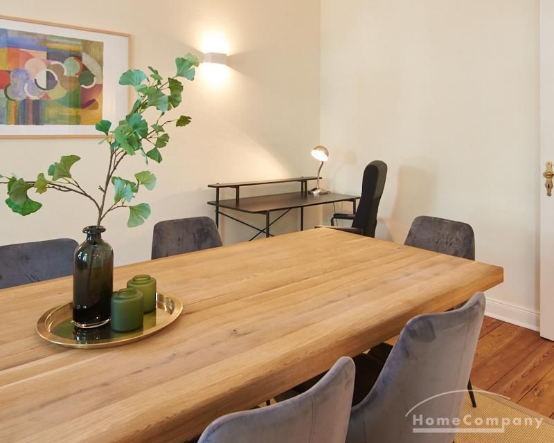Sehr schöne, sorgfältig modernisierte Altbauwohnung mit geöltem Dielenboden. Wohnzimmer und Esszimmer sind durch eine Flügeltür miteinander verbunden. Im Wohnzimmer steht ein komfortabler Sofabereich sowie ein 32 Zoll TV zur Verfügung. Ein mit einem Notebooktisch ausgestatteter Platz für das Homeoffice und 100 Mbit (download), 10 Mbit (upload) schnelles Internet ist vorhanden. Die separate weiße Einbauküche ist mit einem Gas-Kochfeld ausgestattet. Im Schlafzimmer steht ein 1,60 m breites Bett zur Verfügung. Direkt angrenzend, durch eine Schiebetür erreichbar, befindet sich das in dunkelgrünen Mosaikfliesen gestaltete Badezimmer. Zusätzlich steht ein Gäste-WC zur Verfügung, welches über den Flur erreichbar ist. Ein Fahrradstellplatz kann genutzt werden.