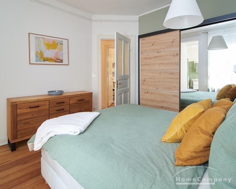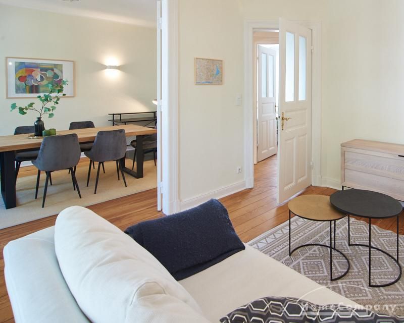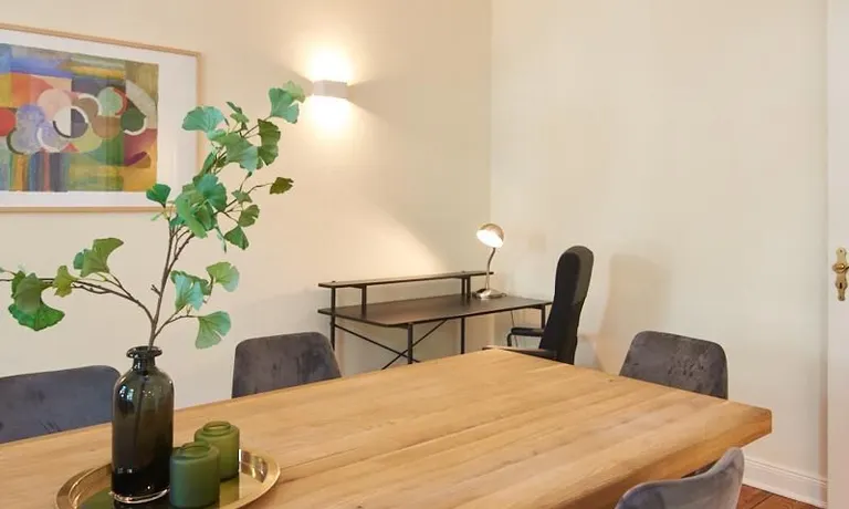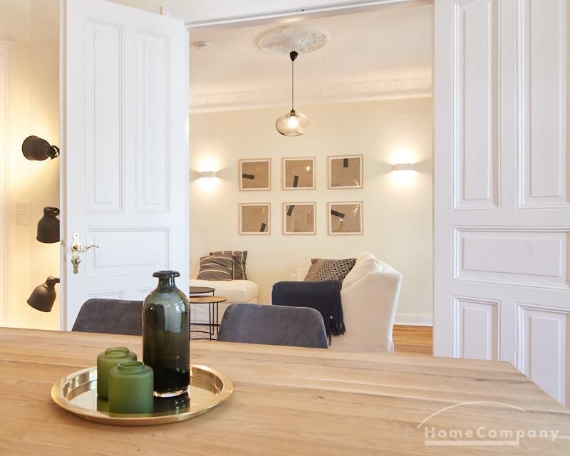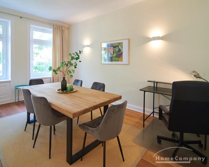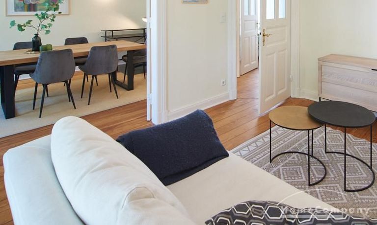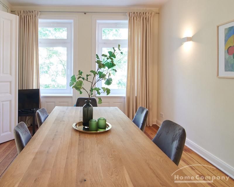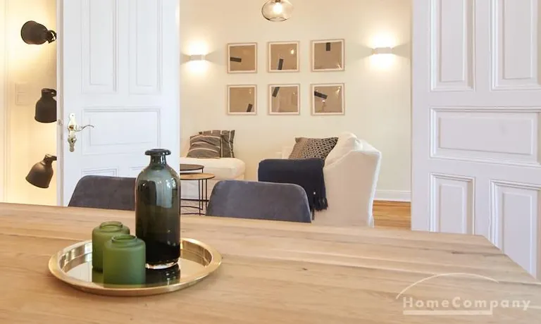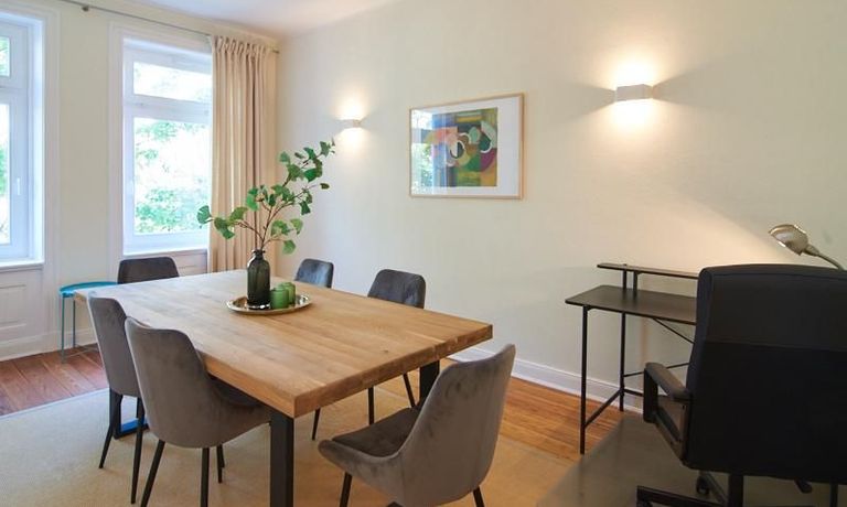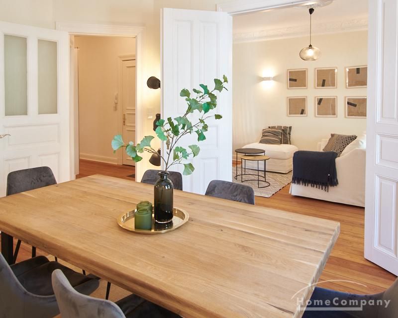Sehr schöne, sorgfältig modernisierte Altbauwohnung mit geöltem Dielenboden. Wohnzimmer und Esszimmer sind durch eine Flügeltür miteinander verbunden. Im Wohnzimmer steht ein komfortabler Sofabereich sowie ein 32 Zoll TV zur Verfügung. Ein mit einem Notebooktisch ausgestatteter Platz für das Homeoffice und 100 Mbit (download), 10 Mbit (upload) schnelles Internet ist vorhanden. Die separate weiße Einbauküche ist mit einem Gas-Kochfeld ausgestattet. Im Schlafzimmer steht ein 1,60 m breites Bett zur Verfügung. Direkt angrenzend, durch eine Schiebetür erreichbar, befindet sich das in dunkelgrünen Mosaikfliesen gestaltete Badezimmer. Zusätzlich steht ein Gäste-WC zur Verfügung, welches über den Flur erreichbar ist. Ein Fahrradstellplatz kann genutzt werden.