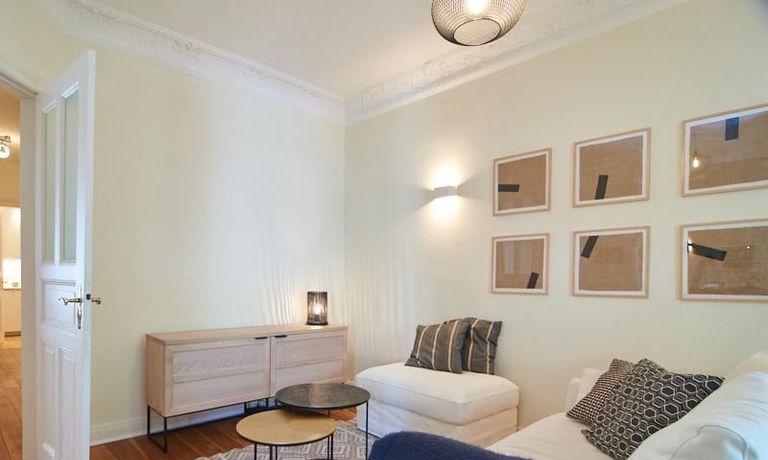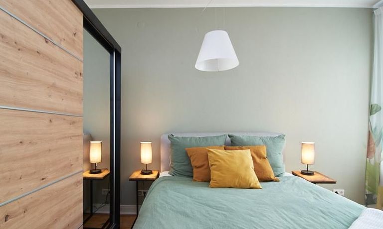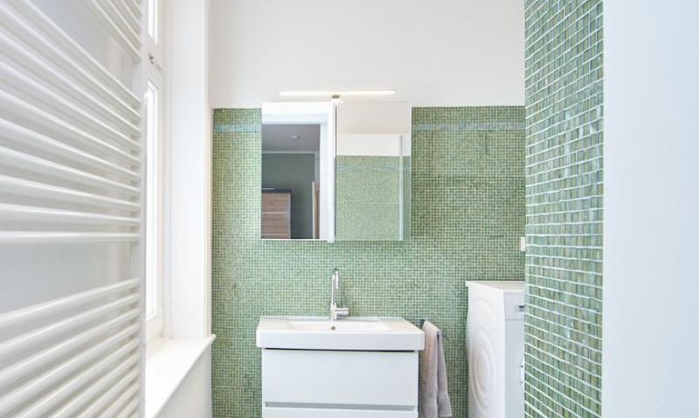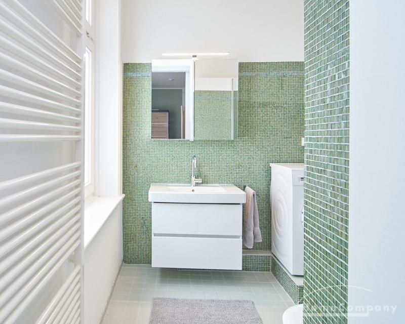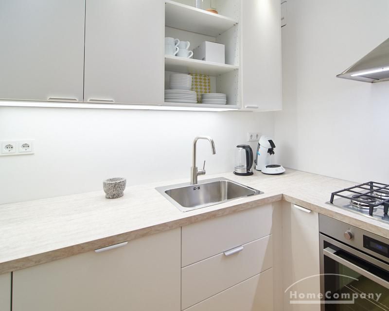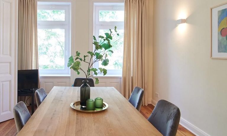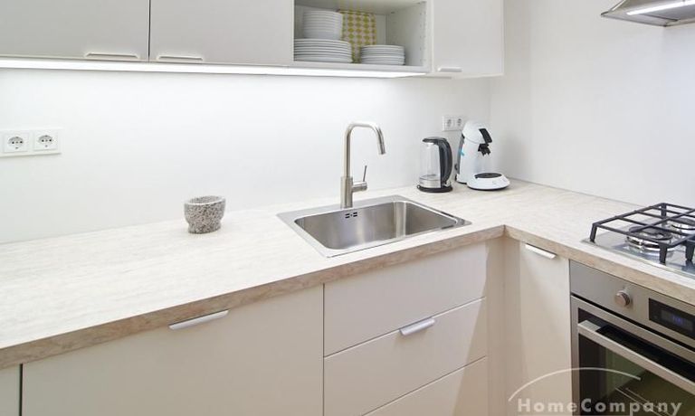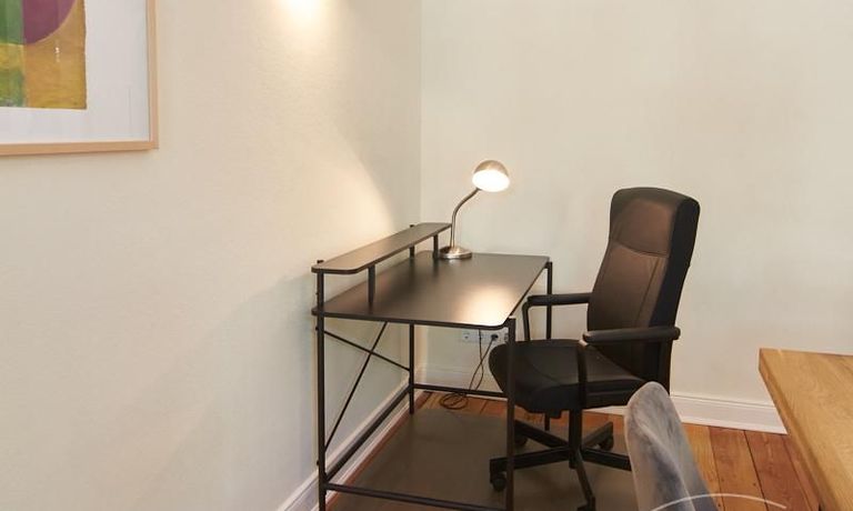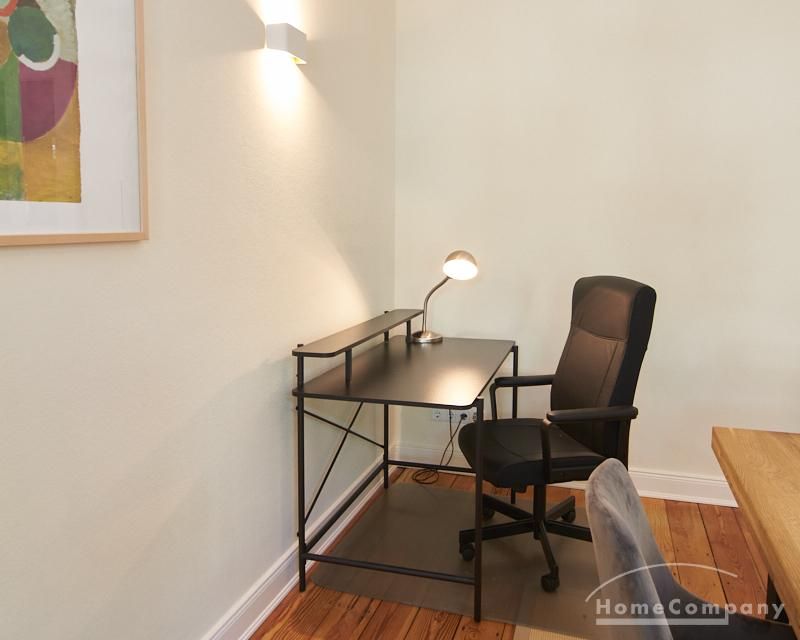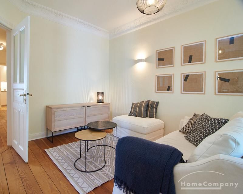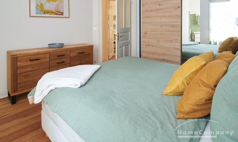 Sehr schöne, sorgfältig modernisierte Altbauwohnung mit geöltem Dielenboden. Wohnzimmer und Esszimmer sind durch eine Flügeltür miteinander verbunden. Im Wohnzimmer steht ein komfortabler Sofabereich sowie ein 32 Zoll TV zur Verfügung. Ein mit einem Notebooktisch ausgestatteter Platz für das Homeoffice und 100 Mbit (download), 10 Mbit (upload) schnelles Internet ist vorhanden. Die separate weiße Einbauküche ist mit einem Gas-Kochfeld ausgestattet. Im Schlafzimmer steht ein 1,60 m breites Bett zur Verfügung. Direkt angrenzend, durch eine Schiebetür erreichbar, befindet sich das in dunkelgrünen Mosaikfliesen gestaltete Badezimmer. Zusätzlich steht ein Gäste-WC zur Verfügung, welches über den Flur erreichbar ist. Ein Fahrradstellplatz kann genutzt werden.