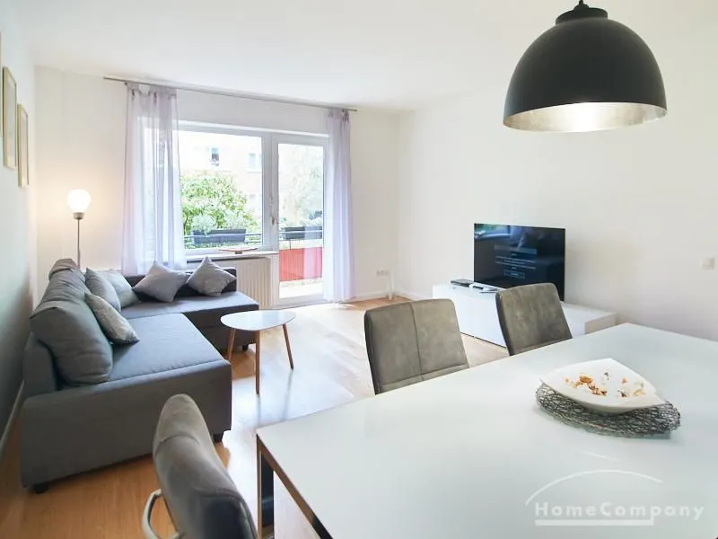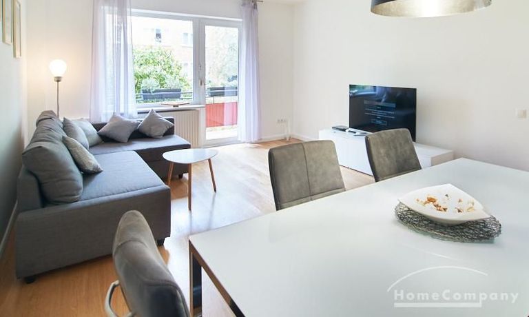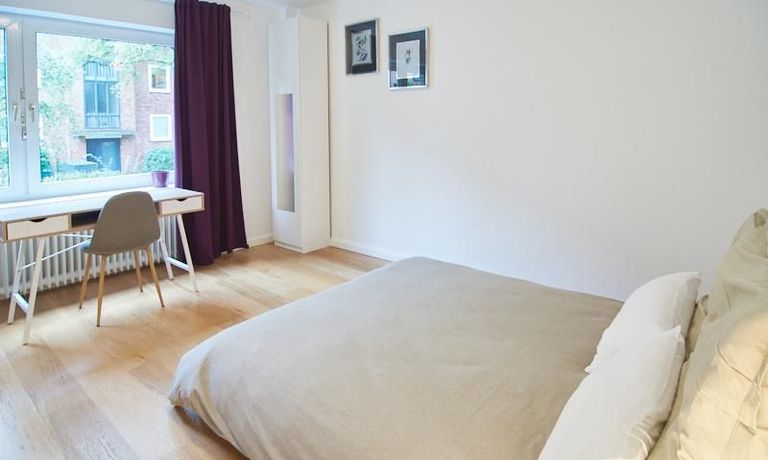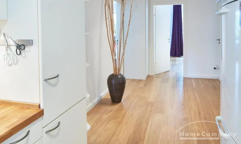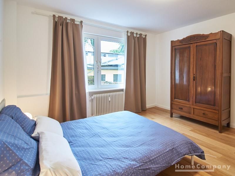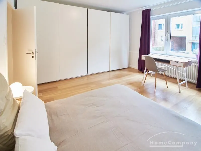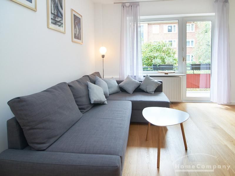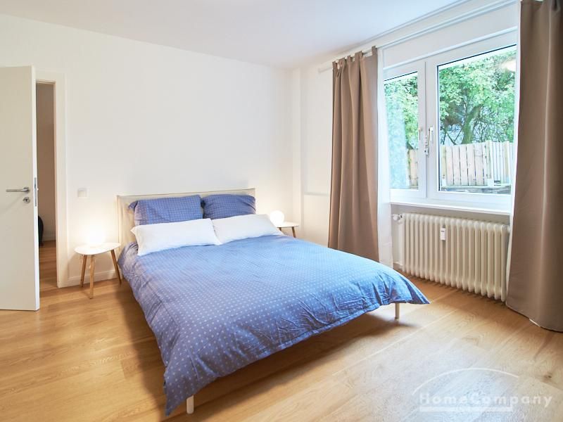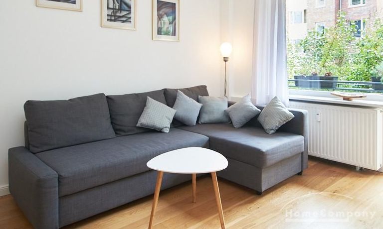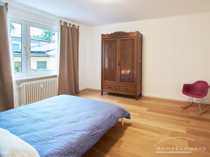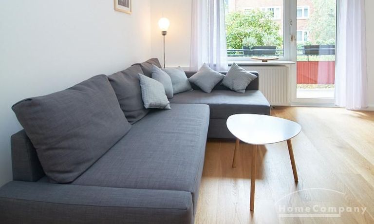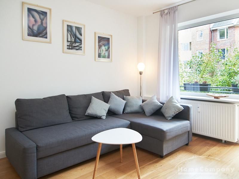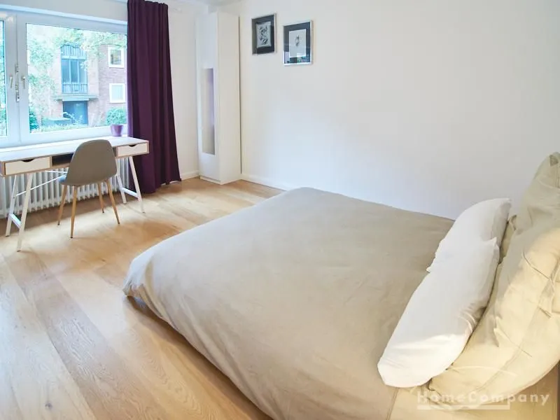Die gepflegte Wohnung mit 2 Schlafzimmern, zwei in weiß gehaltenen Bädern, Wohn- Esszimmer, Küche, Balkon und Abstellraum befindet sich im beliebten Hamburg Eimsbüttel. In beiden Schlafzimmern befindet sich ein 1,60 m großes Bett; in einem der Schlafzimmer ist ein 4 m breiter Kleiderschrank, in dem anderen ein Bücherregal mit Fronttür. Der großzügige Wohnbereich mit zwei großen Fenstern bietet Platz zum gemütlichen Beisammensein und ist zusätzlich mit einem Esstisch eingerichtet. Die Einbauküche mit einem großen Kühl- und Gefrierkombigerät und Geschirrspülmaschine ist komplett ausgestattet. Eines der Bäder ist ein Vollbad, das zweite ist ein Duschbad mit halbrunder Duschkabine, Handtuchheizung, Waschmaschine, Wäschetrockner und großen Fenster zum Innenhof. Der Südbalkon ist mit einem Tisch und zwei Stühlen eingerichtet und auf dem begrünten Gemeinschafts-Innenhof befindet sich ein Gartenset mit Sofa, zwei Sesseln und einem Tisch sowie Kinderspielgeräten. Im Haus gibt es einen Trockenraum und einen Fahrradkeller.