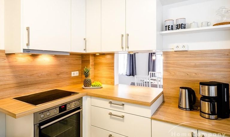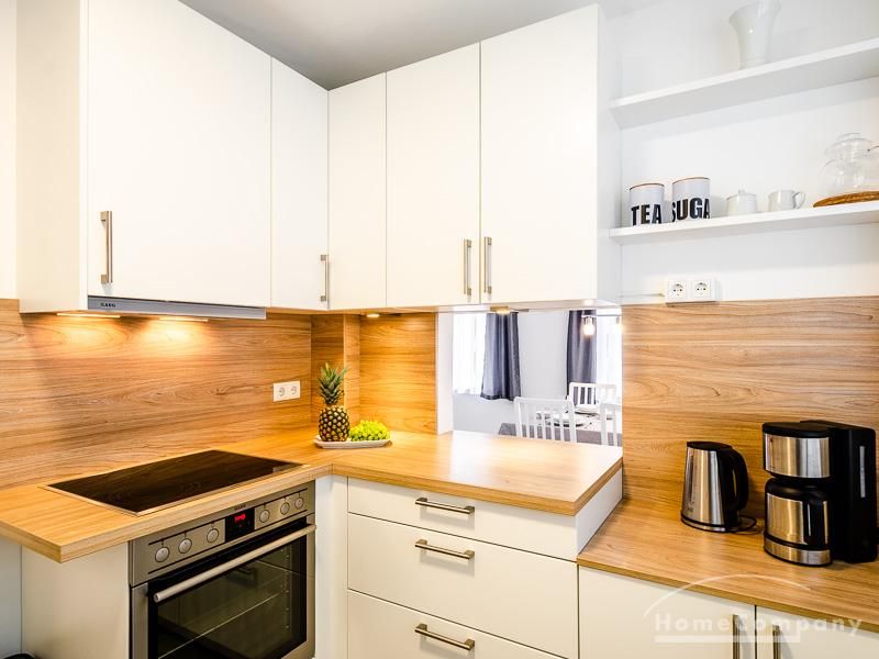 Die neue moderne Einbauküche ist mit einem Herd mit Dunstabzugshaube, einem Kühlschrank, einem Geschirrspüler, Kaffeemaschine und Wasserkocher ausgestattet.