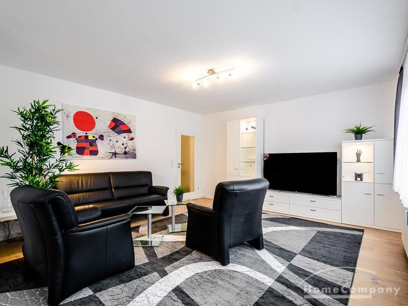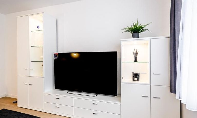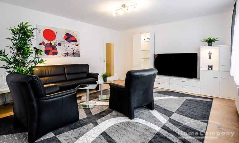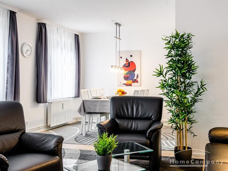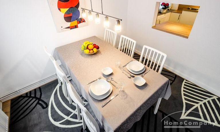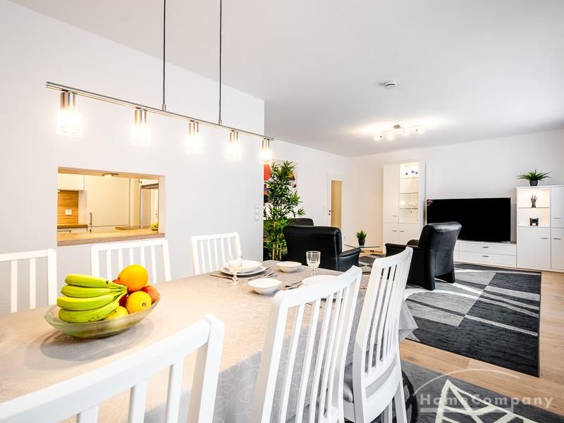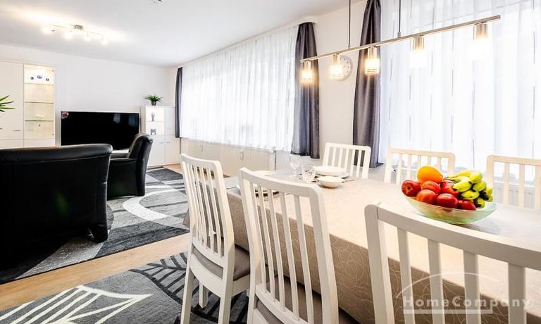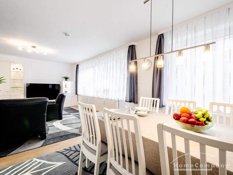Die Wohnung hat 3 Zimmer und ist ca. 80 m² groß. Das Wohnzimmer ist mit einem 4K UHD Fernseher 65 Zoll, Esstisch mit 6 Stühlen, Sitzgruppe und Wohnzimmerschrank ausgestattet. Vom Essbereich gibt es eine Durchreiche zur Küche.