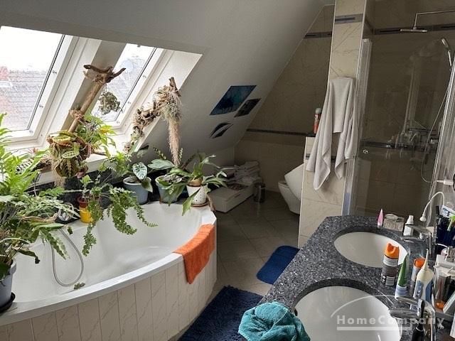 Das Badezimmer ist großzügig gestaltet und verfügt sowohl über eine Dusche als auch eine Badewanne.