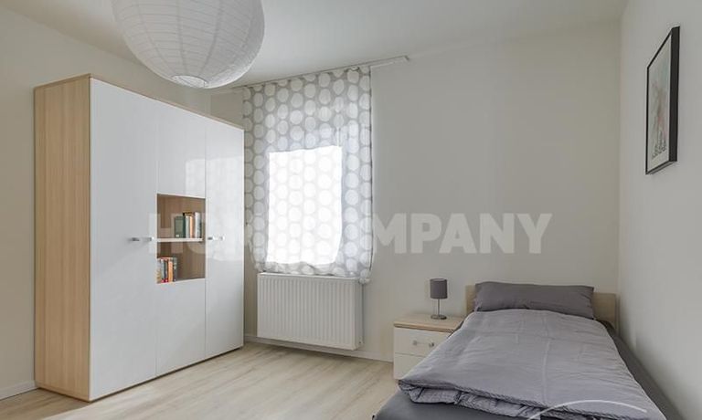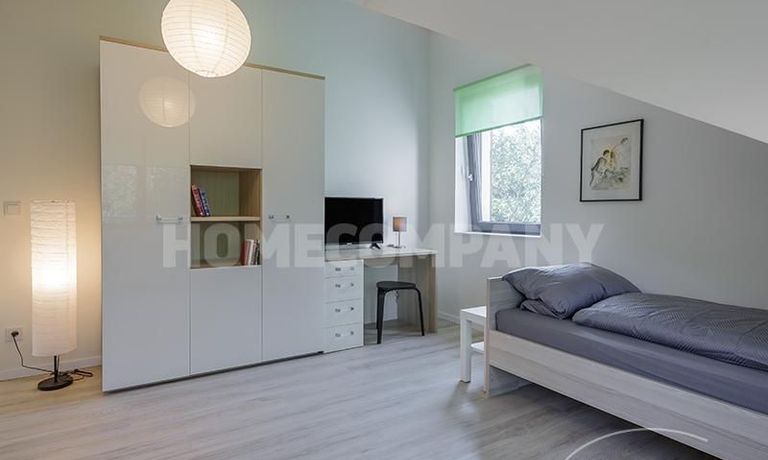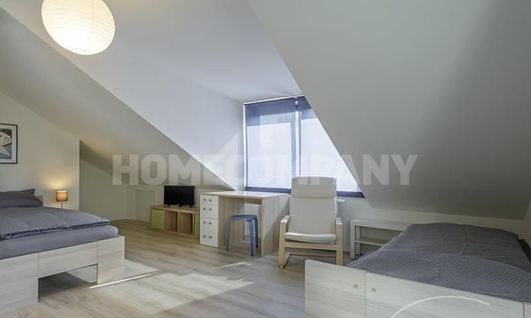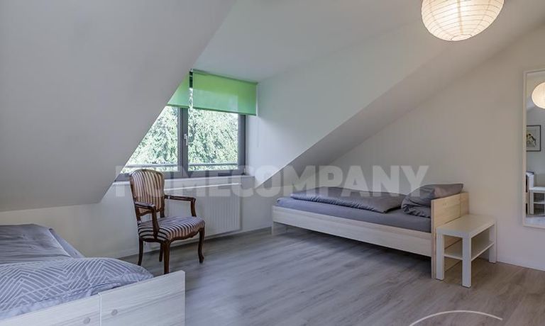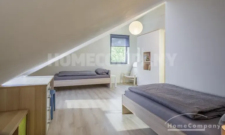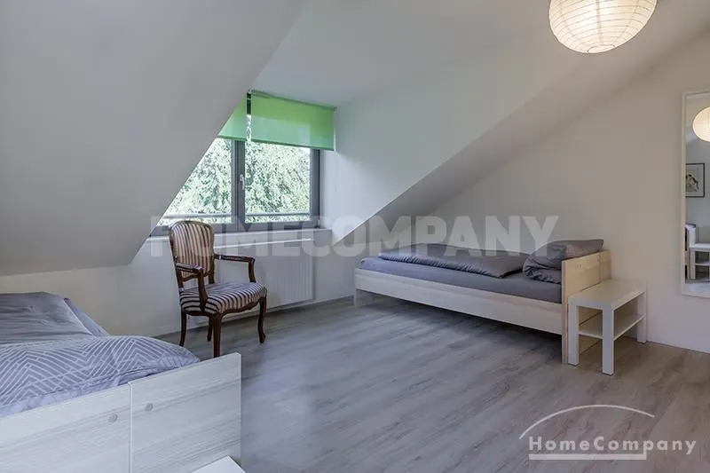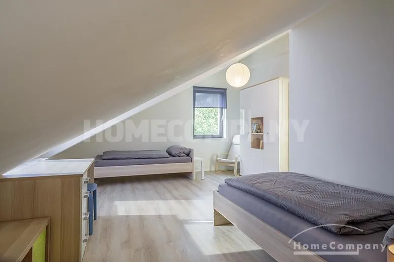 Im 1. OG befinden sich 3 separate Zimmer, sowie ein Badezimmer: ein Schlafzimmer mit Einzelbett, Schrank und Schreibtisch, ein Schlafzimmer mit Doppelbett, Schrank und Balkon, sowie ein Gästezimmer mit Schlafcouch. Das Badezimmer mit Tageslicht ist modern grau gefliest und verfügt über eine Badewanne.