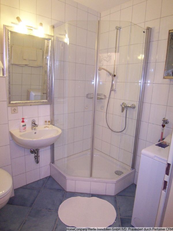 Dusche, WC, Waschmaschine, Spiegel, Hängeschränkchen, Badevorleger,
