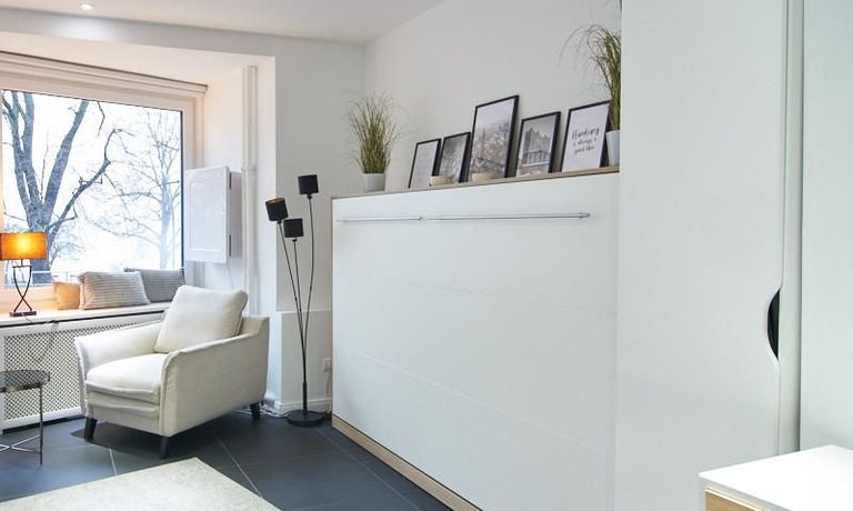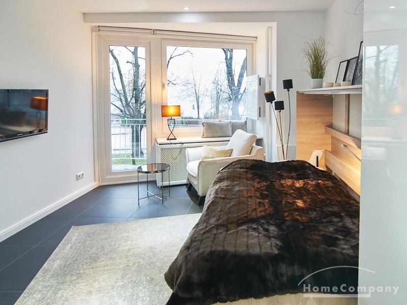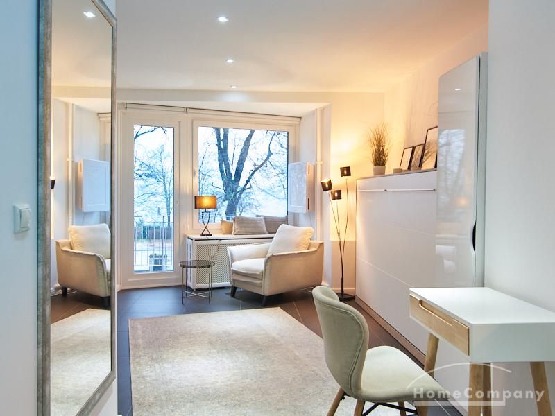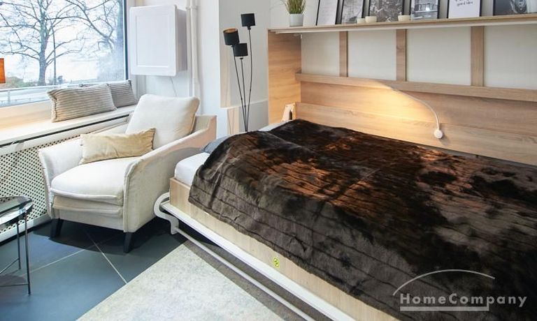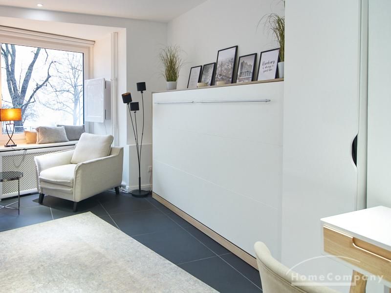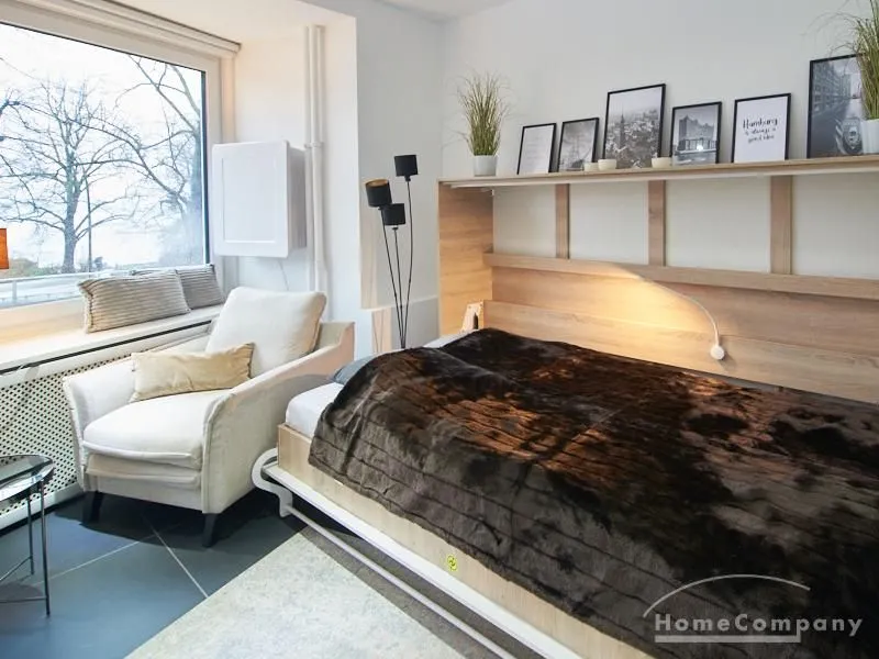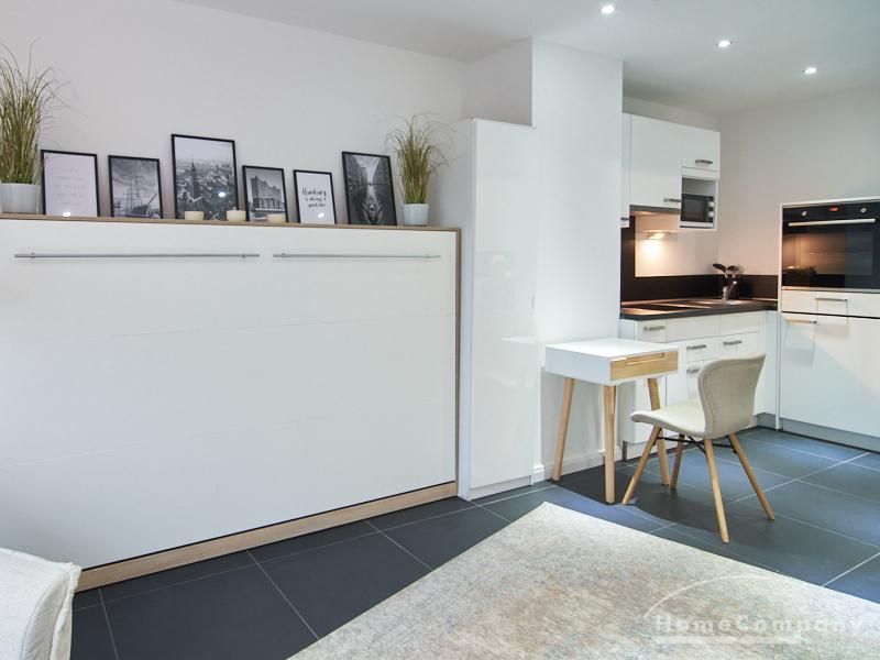 Perfekt ausgestattetes Apartment direkt an der Alster. Das Apartment wurde in 2022 komplett modernisiert und möbliert. Durch die kluge Gestaltung des Grundrisses wird eine optimale Raumnutzung erreicht. Die sehr gut ausgestattete Einbauküche öffnet sich zum Wohn- Schlafbereich. Hier steht ein komfortables, 1,20 breites Schrankbett zur Verfügung, welches bei Bedarf zu einem Sideboard zusammengeklappt werden kann.