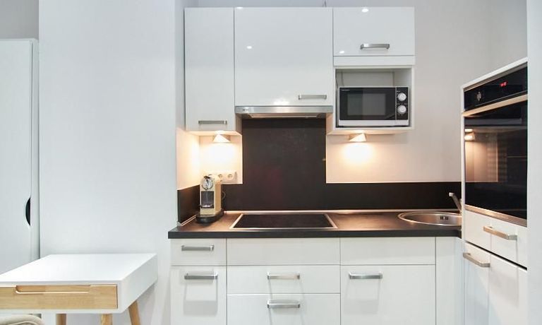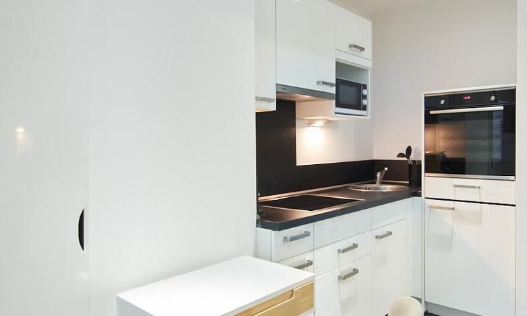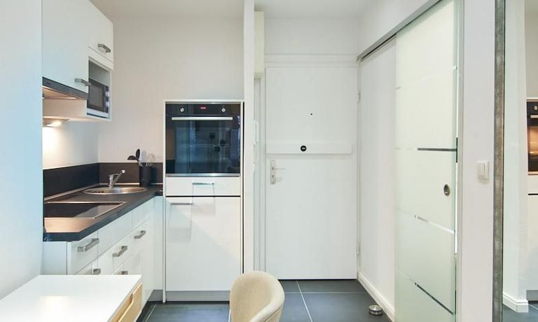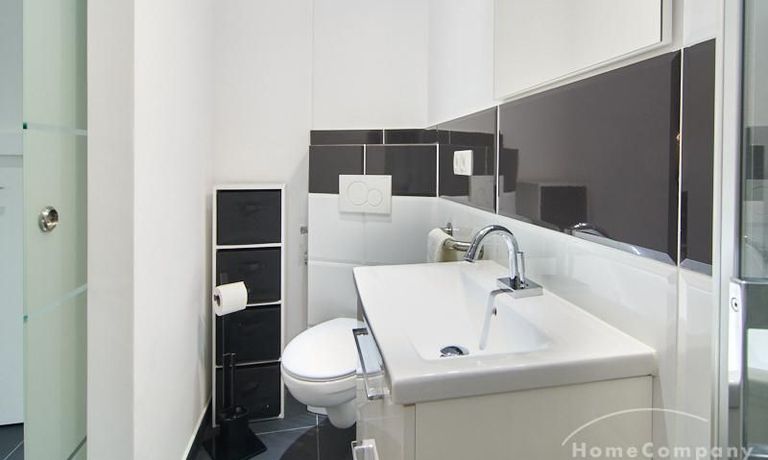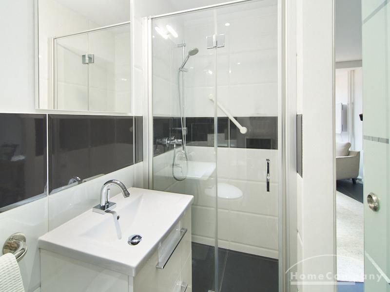 Im Küchenbereich stehen eine Spülmaschine sowie ein Waschtrockner zur Verfügung. Ein Minikühlschrank ist ebenfalls integriert. Das moderne Duschbad mit bodengleicher Dusche ist über eine Glas-Schiebetür erreichbar.