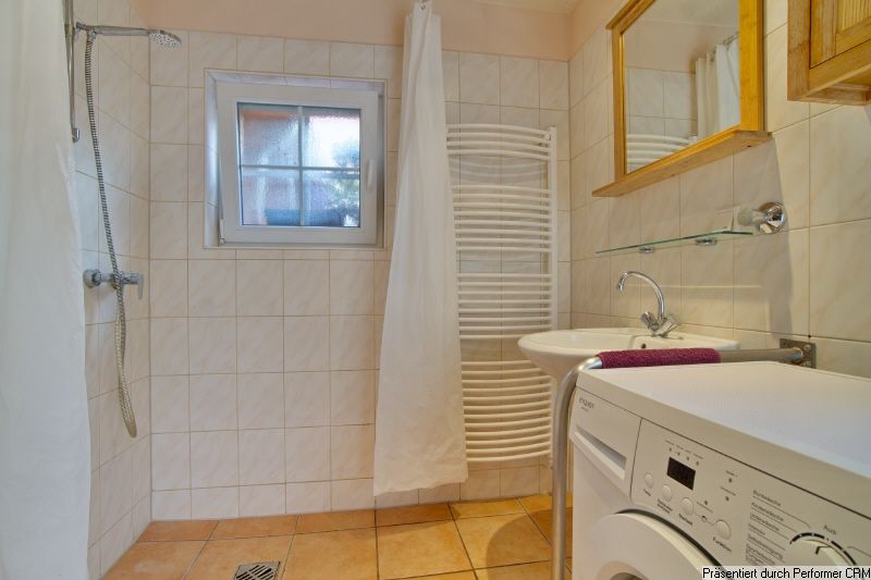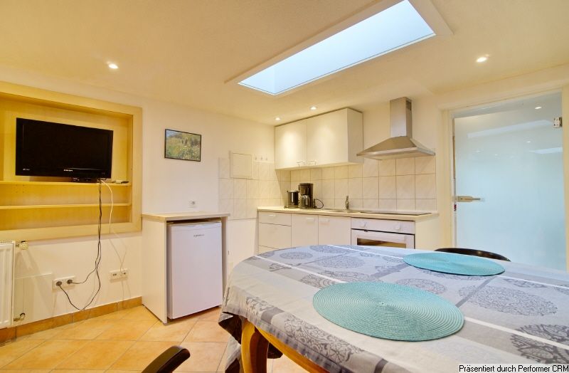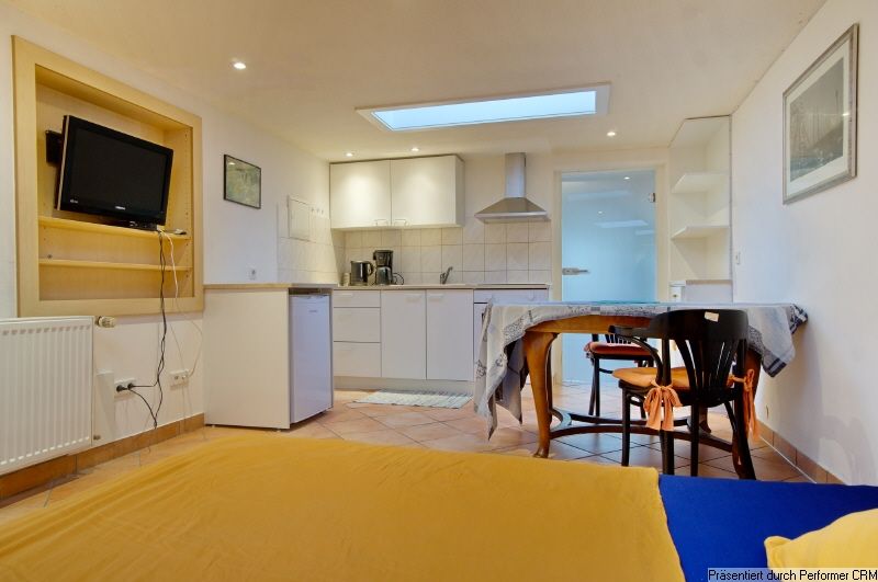 Das Zimmer hat einen Fliesenboden, komplette Möblierung und Internetzugang über W-Lan ist vorhanden. Behindertengerechte Ausstattung/ebenerdiges Wohnen. 1,40 Meter breites Bett, Schiebetüren-Kleiderschrank und ein TV-Gerät im Schlafbereich. Auf der anderen Seite des Raums steht die Küchenzeile mit Induktions-Doppelkochfeld, Backofen, Kaffeemaschine und einer Grundausstattung Geschirr und Kochutensilien. Ein Kühlschrank mit Eisfach ist vorhanden. Das Duschbad hat ein Fenster, Handtuchheizung und Haltegriffe, im Bad ist auch die Waschmaschine untergebracht. Ausgang zur Terrasse mit Blick in den Garten.