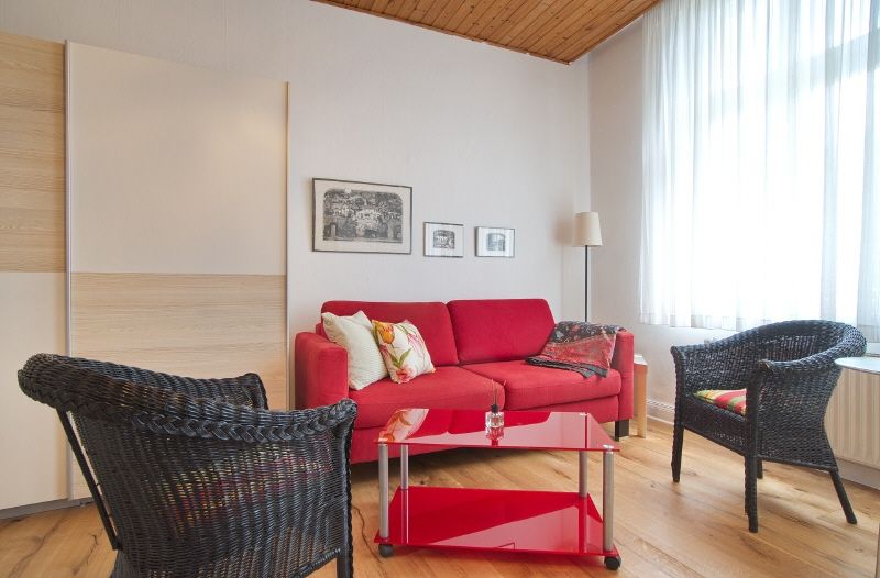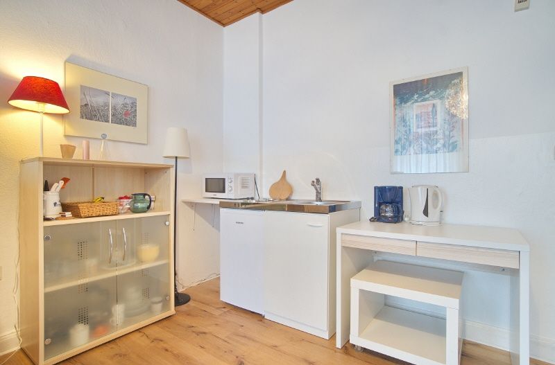 Das Zimmer ist vollständig eingerichtet und ausgestattet, es hat einen Parkettboden und große Fenster mit Rollos. Im Wohnbereich stehen Sofa, Couchtisch und zwei Sessel bereit, im Schlafbereich ein 1,40 Meter breites Bett. Das TV-Gerät ist internetfähig. Der Schwebetüren-Kleiderschrank und eine Garderobe bieten viel Stauraum für Kleidung. In einer Ecke des Zimmers steht eine Singleküche mit Doppelkochfeld, Microwelle und Kühlschrank mit Eisfach, weiterhin gibt es Geschirr, Kochutensilien, Kaffeemaschine etc. Auch Bettzeug und Bettwäsche sind vorhanden. Im Keller des Hauses stehen eine Waschmaschine und ein Wäscheständer für das Zimmer bereit.