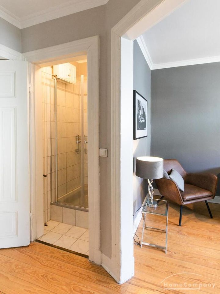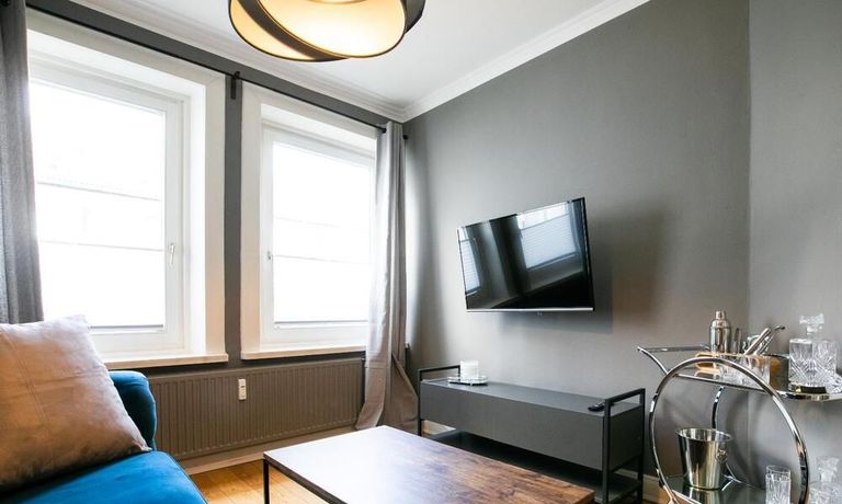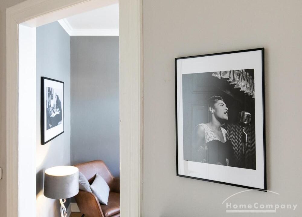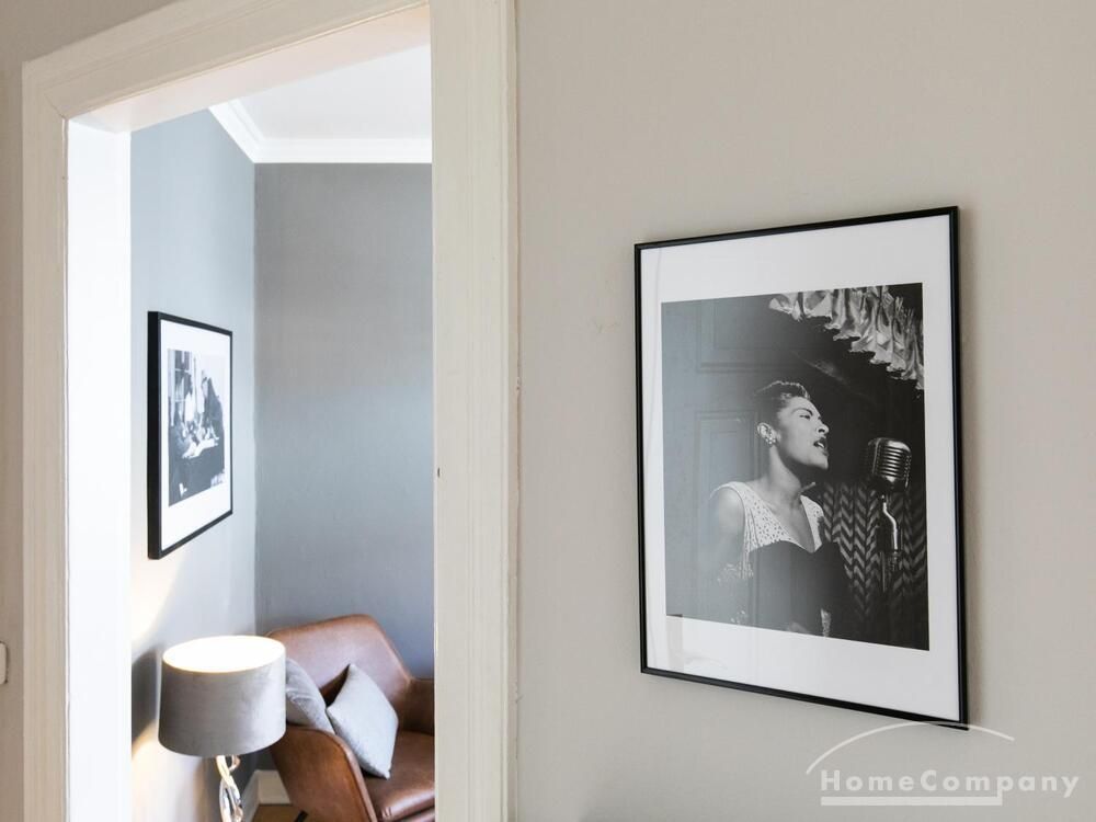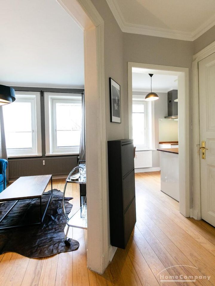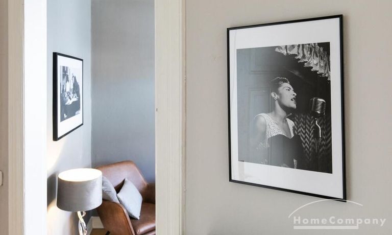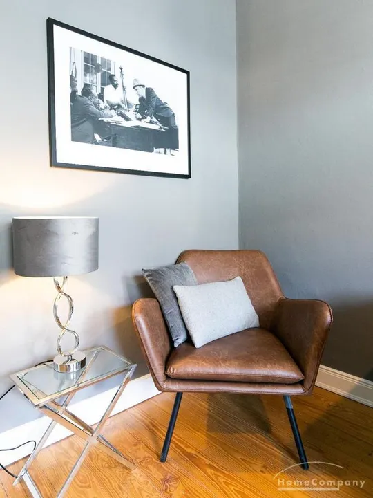 Die Wohnung liegt in einem ruhigen schön gestalteten Hinterhof. Die Einrichtung ist in warmen Grau- und Brauntönen gehalten, die mit Naturmaterialien kombiniert sind.