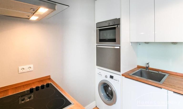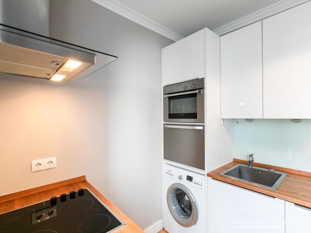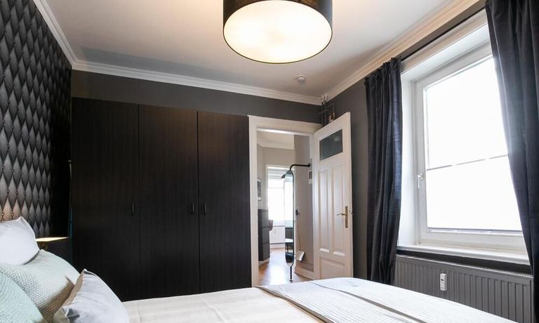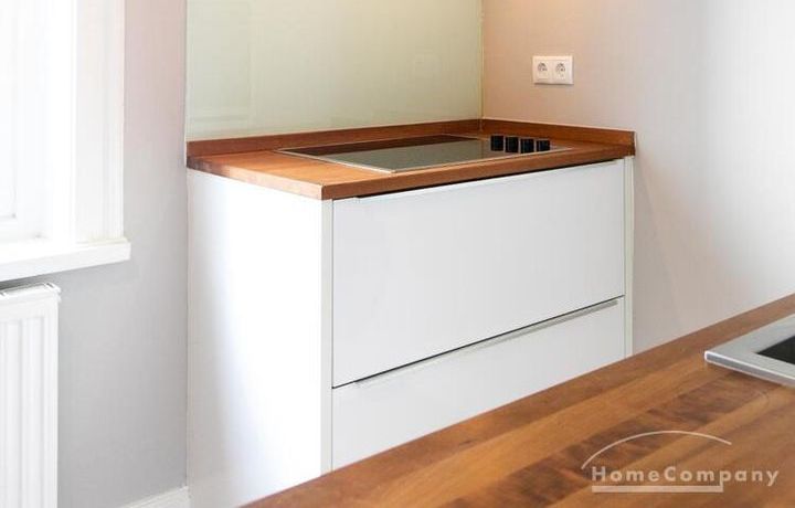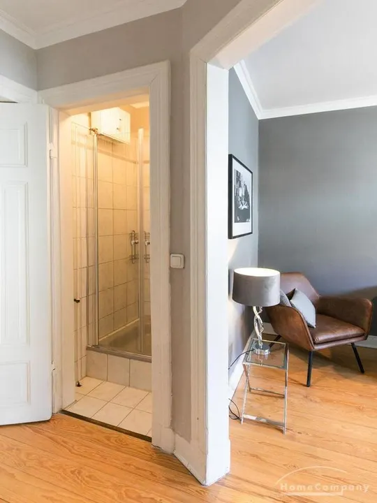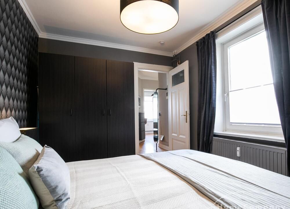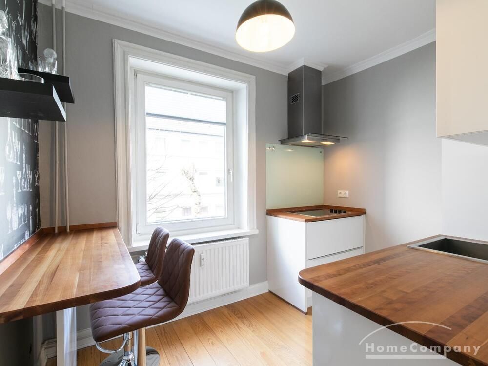 Die Wohnung liegt in einem ruhigen schön gestalteten Hinterhof. Die Einrichtung ist in warmen Grau- und Brauntönen gehalten, die mit Naturmaterialien kombiniert sind.
