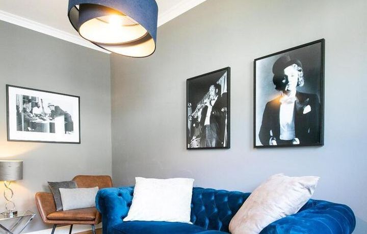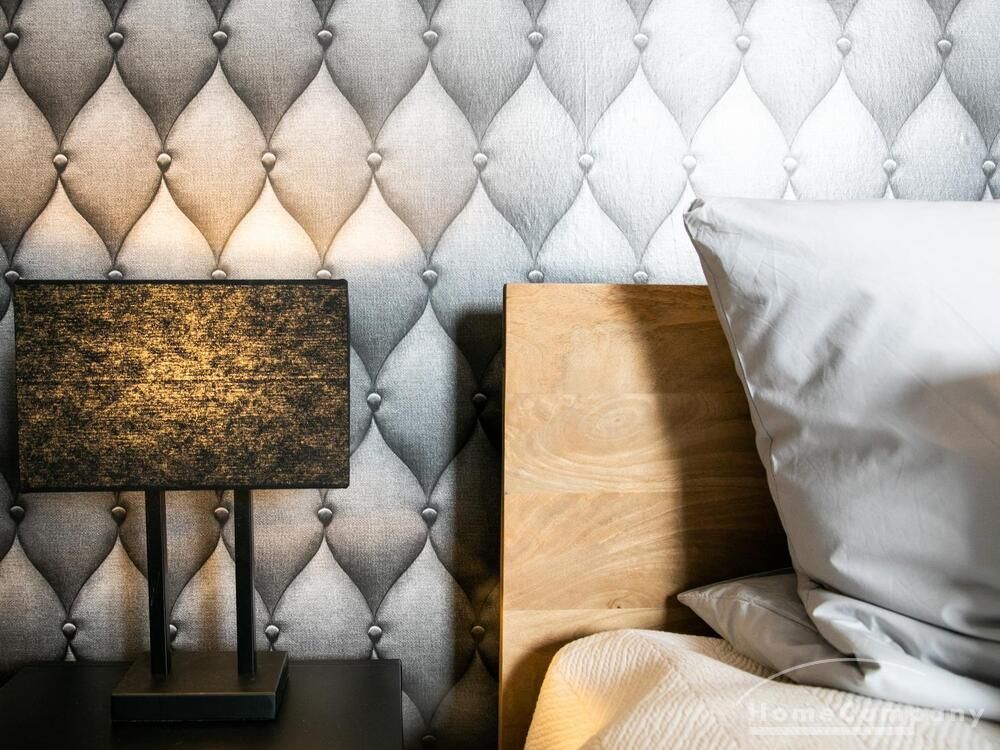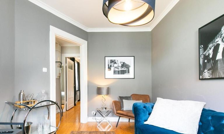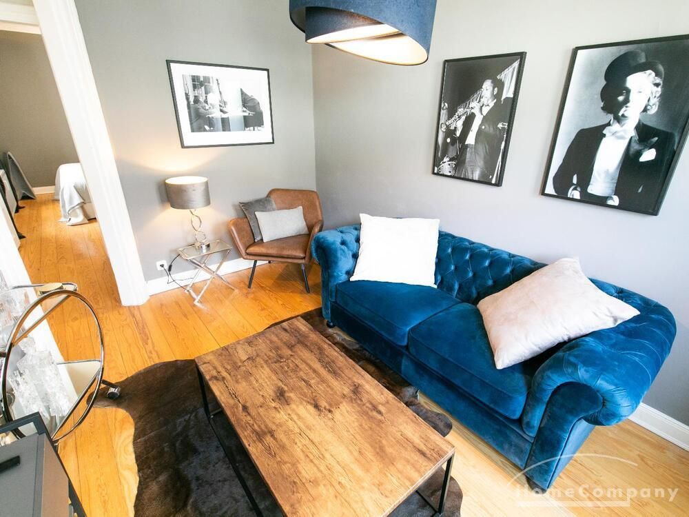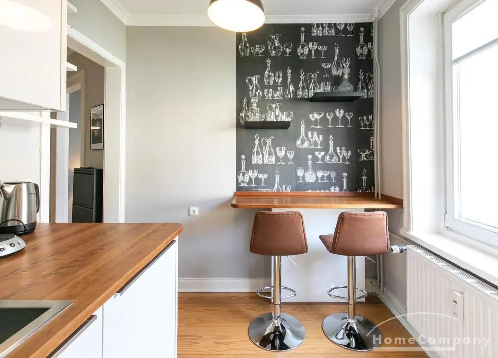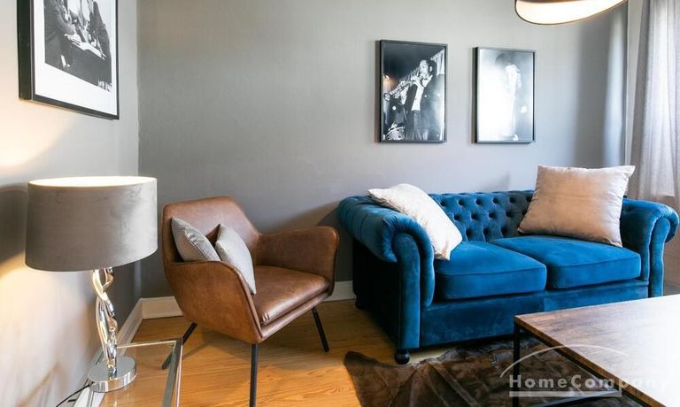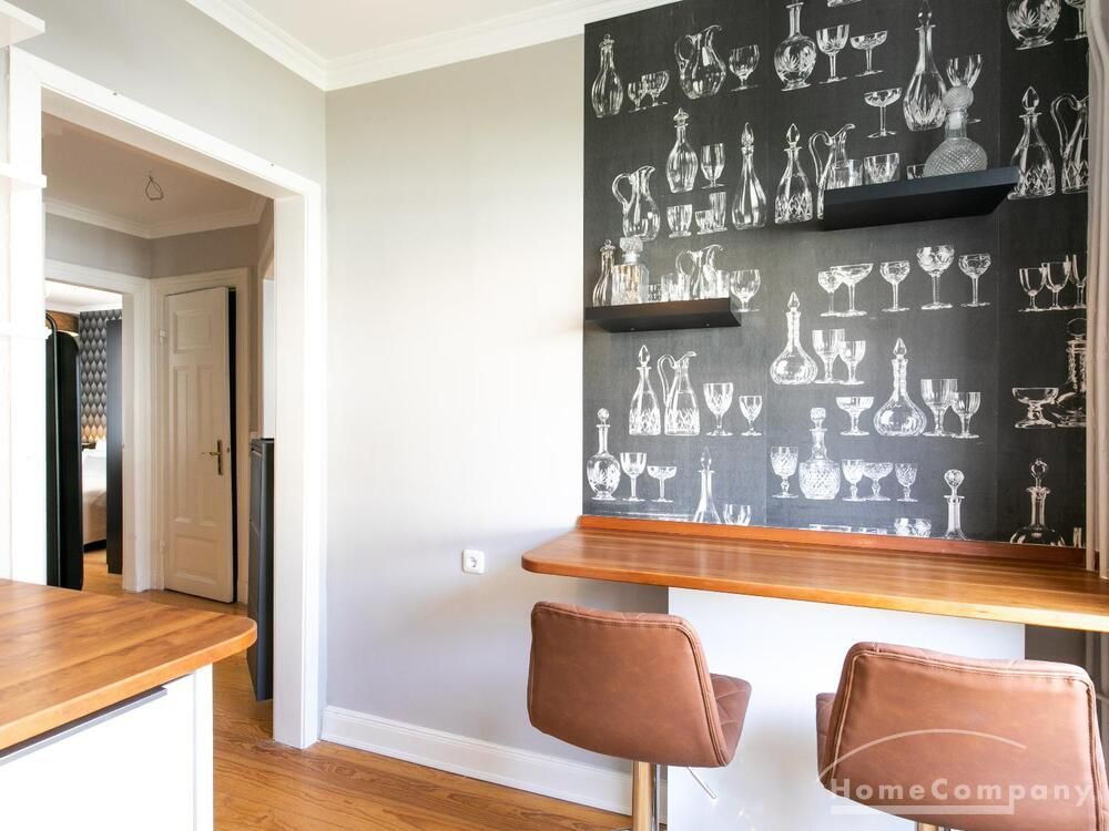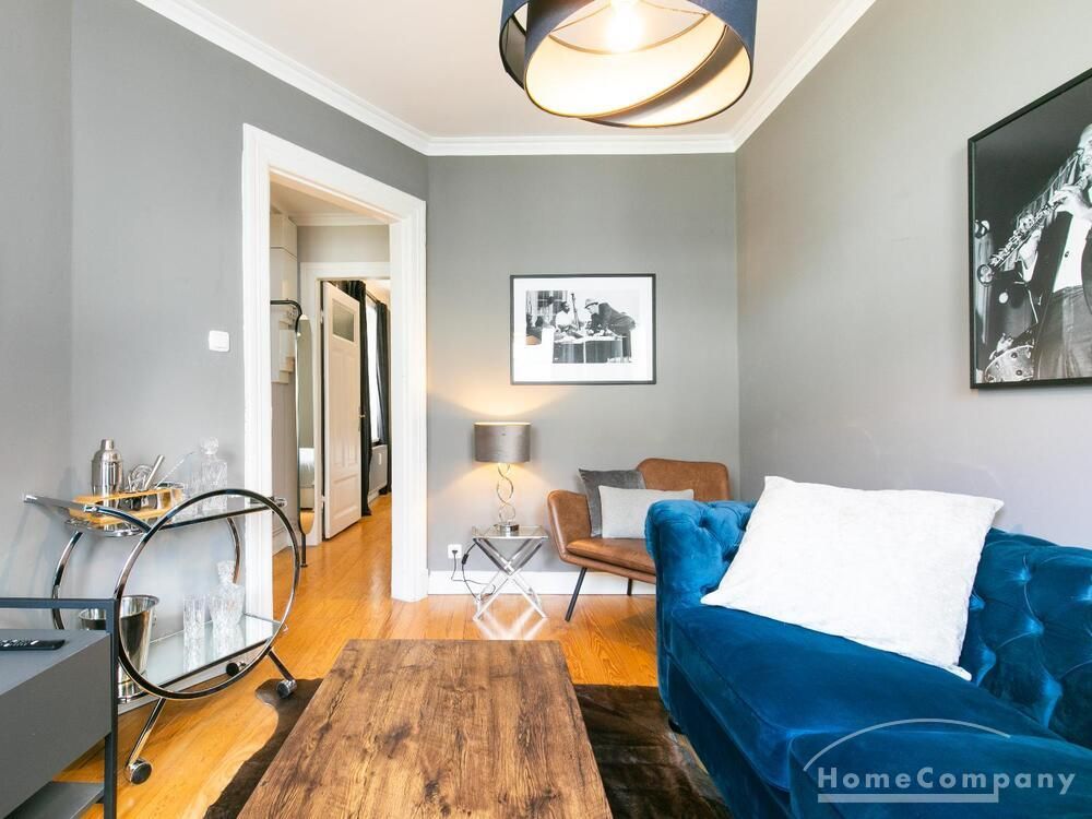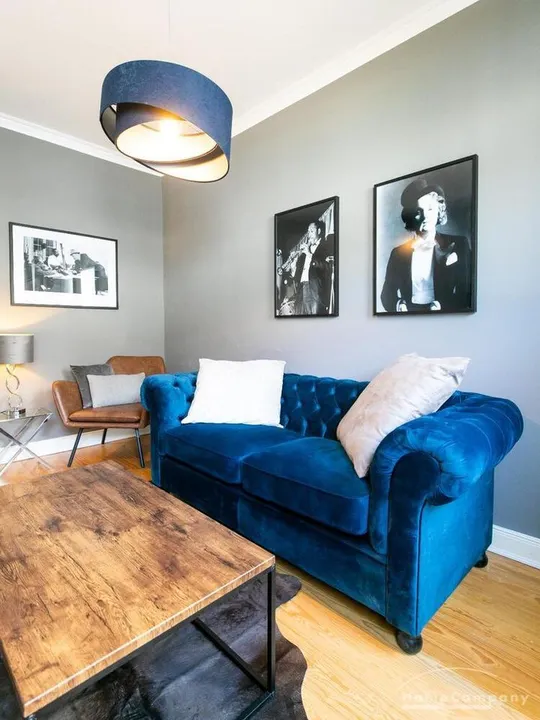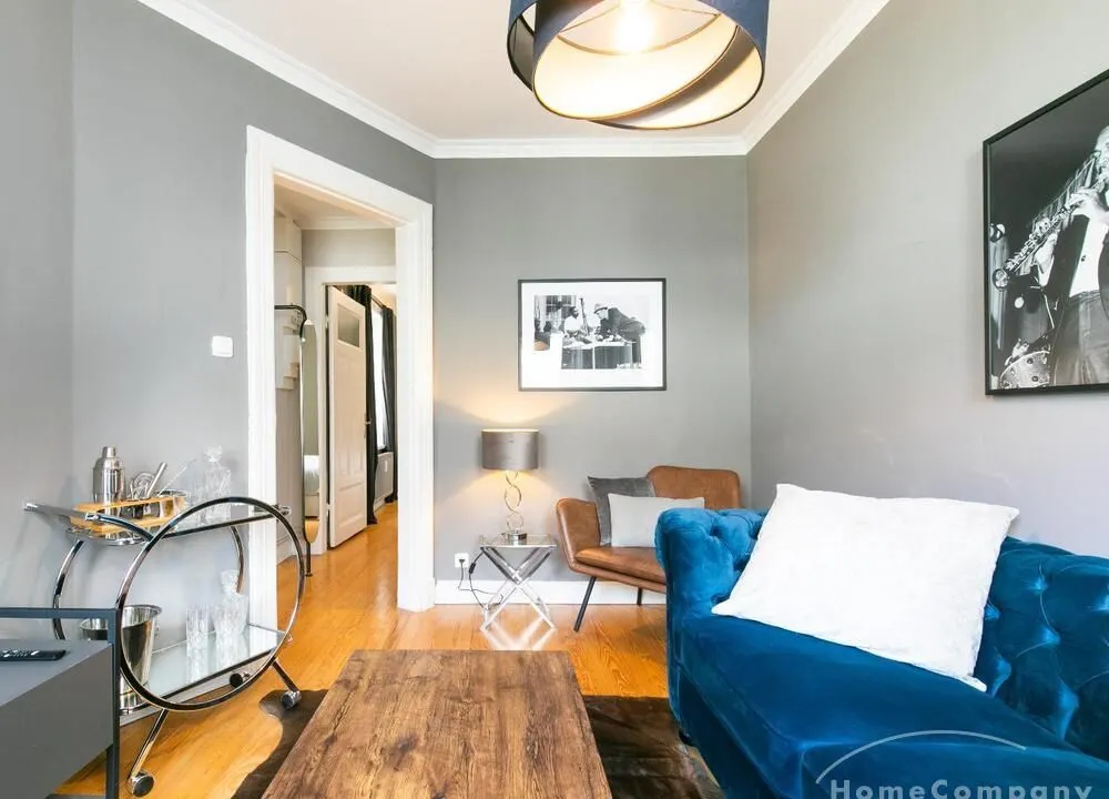 Das Herzstück des Wohnzimmers ist das klassische Chesterfield Sofa mit einem Bezug aus dunkelblauem Samt. Akzente in Silber verleihen den Räumen besondere Eleganz. Ein silberner Barwagen ist mit Karaffen und Whiskygläsern dekoriert. Dieses Motiv wird mit dem Motiv der Tapete in der Küche weitergeführt. Ein Frühstückstresen mit Barhockern steht zur Verfügung. Das Schlafzimmer verfügt über ein 1,60 m breites Holzbett und einen großen Kleiderschrank mit viel Stauraum. Das separate WC ist mit grauen Metrofliesen gestaltet.
