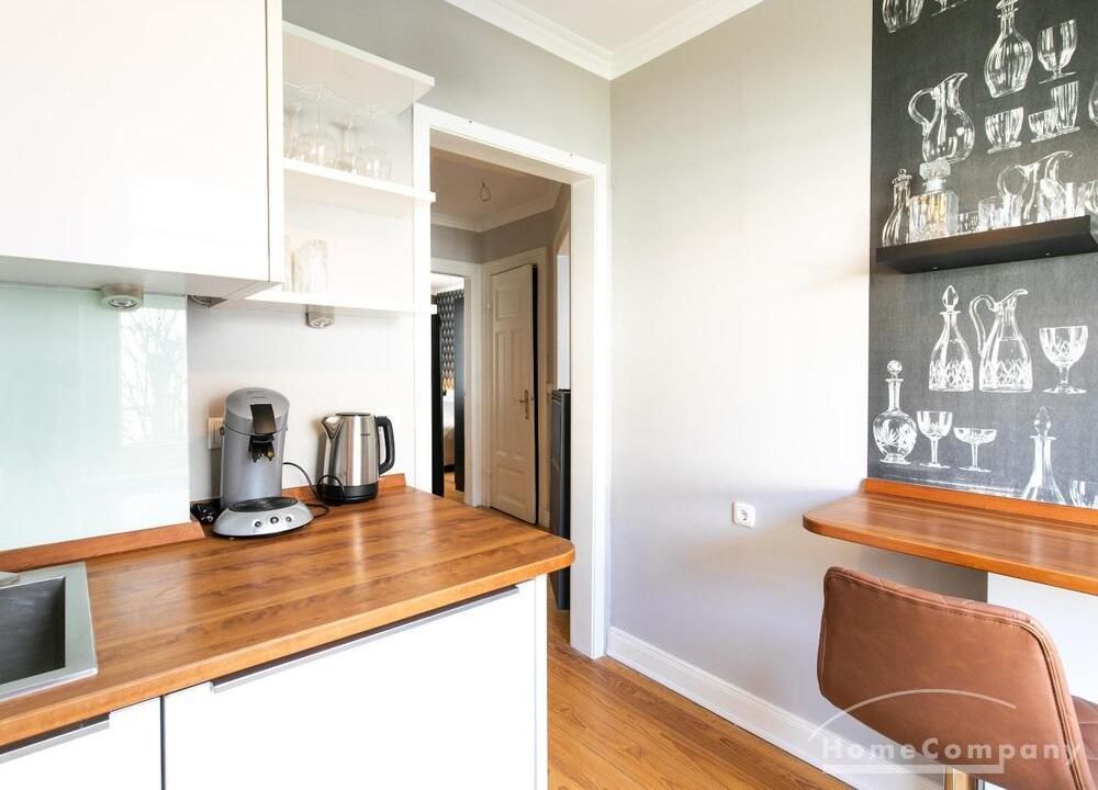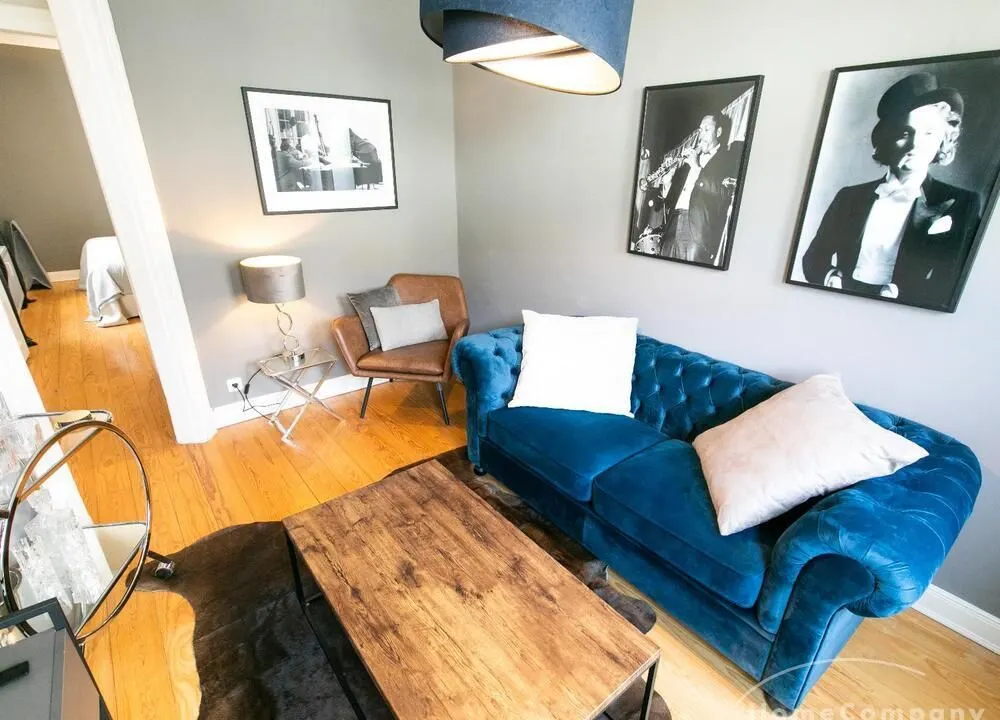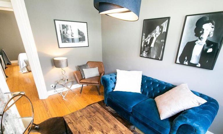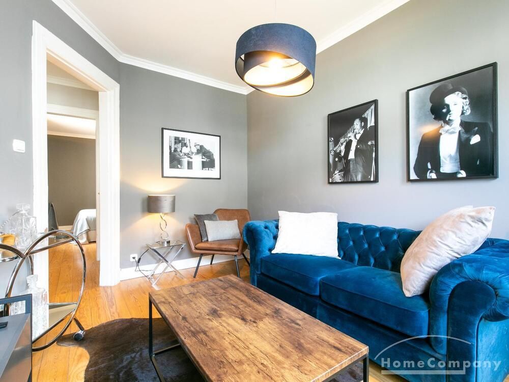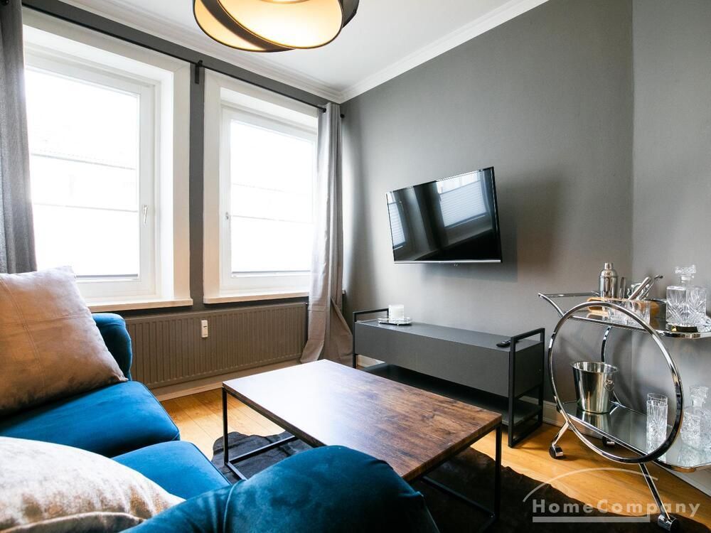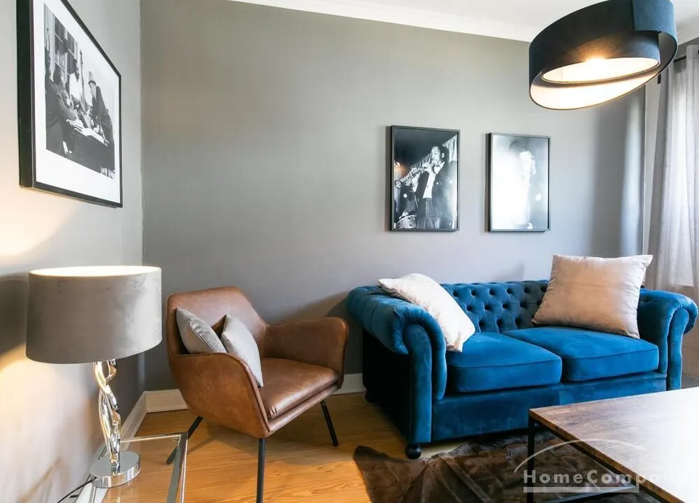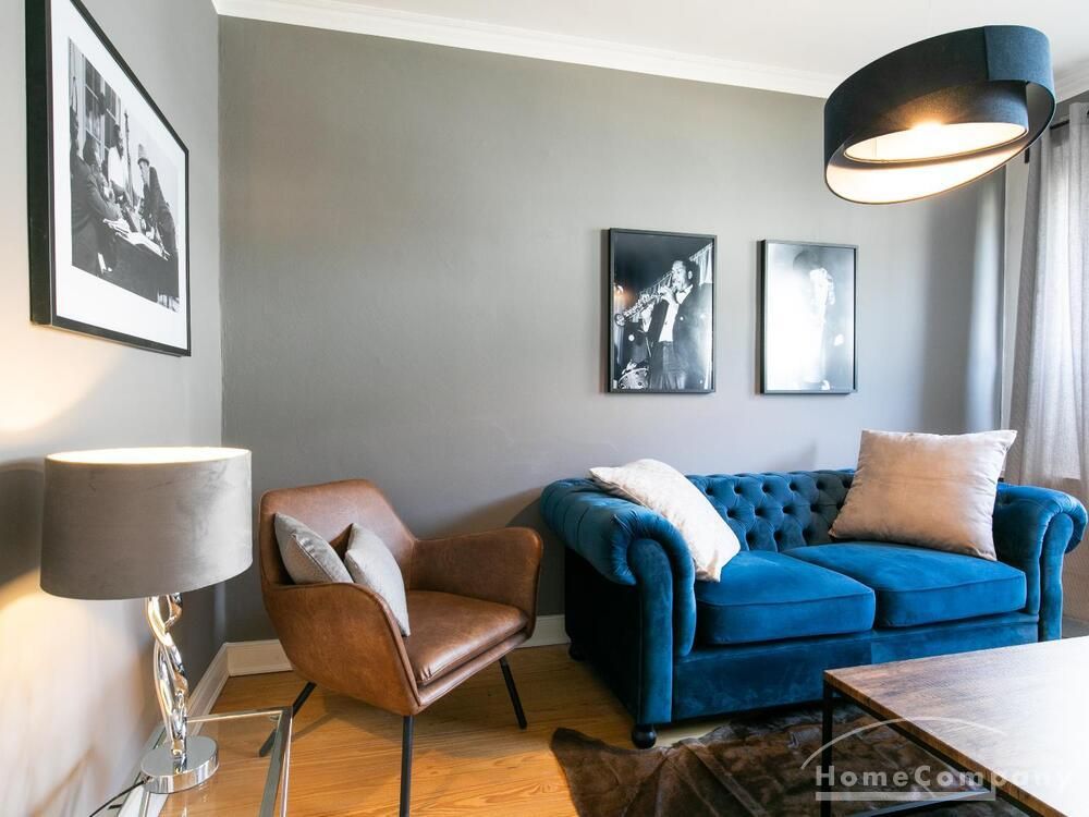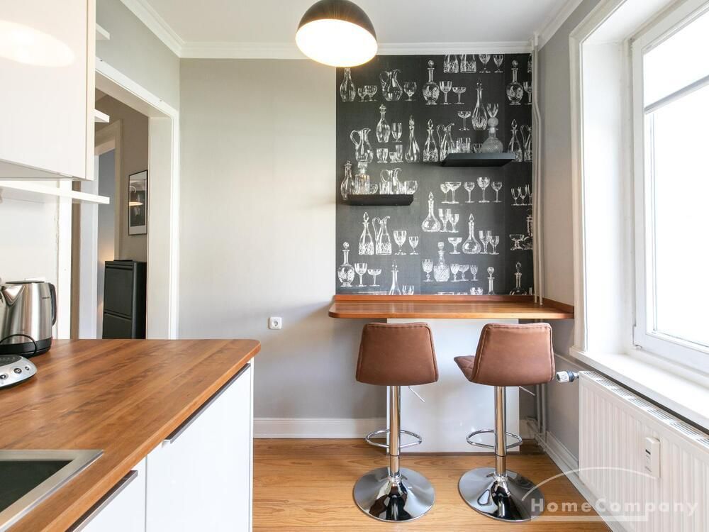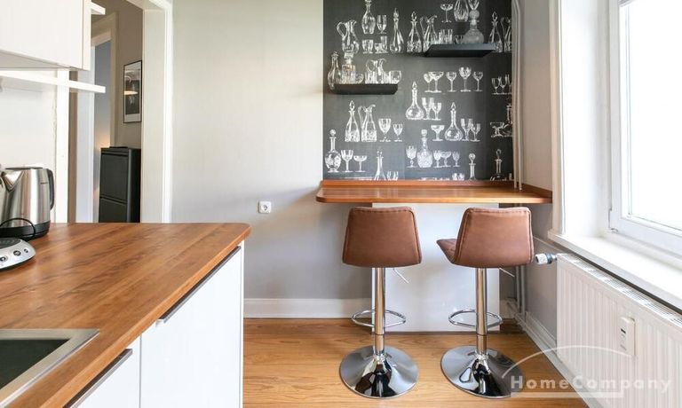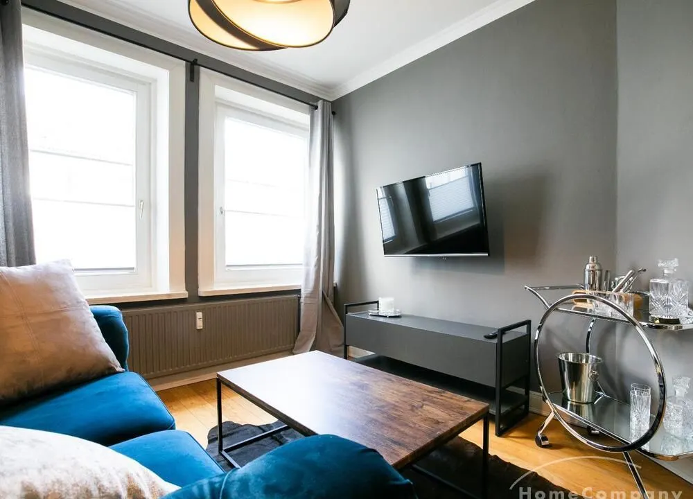 Das Herzstück des Wohnzimmers ist das klassische Chesterfield Sofa mit einem Bezug aus dunkelblauem Samt. Akzente in Silber verleihen den Räumen besondere Eleganz. Ein silberner Barwagen ist mit Karaffen und Whiskygläsern dekoriert. Dieses Motiv wird mit dem Motiv der Tapete in der Küche weitergeführt. Ein Frühstückstresen mit Barhockern steht zur Verfügung. Das Schlafzimmer verfügt über ein 1,60 m breites Holzbett und einen großen Kleiderschrank mit viel Stauraum. Das separate WC ist mit grauen Metrofliesen gestaltet.