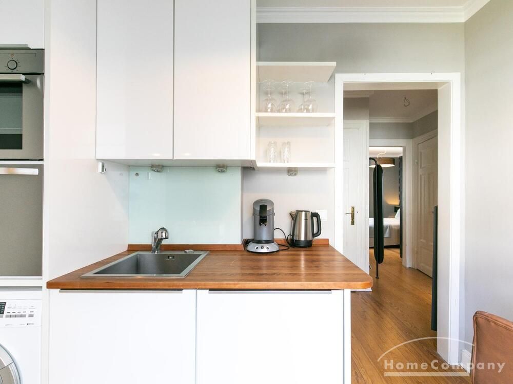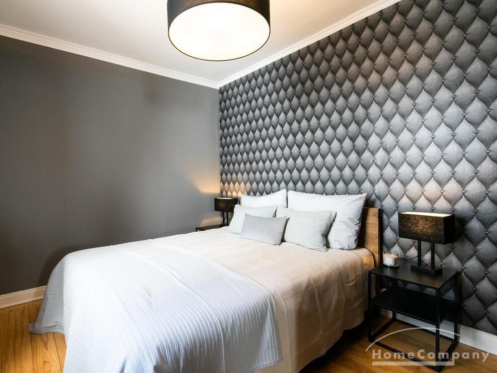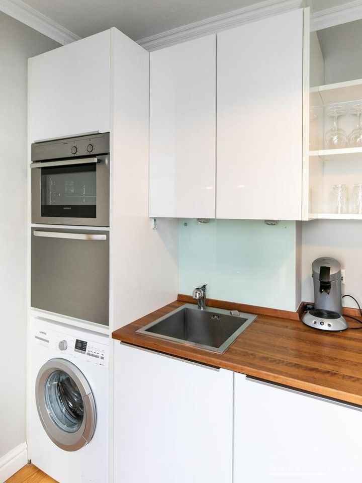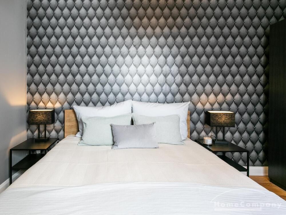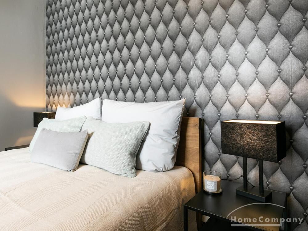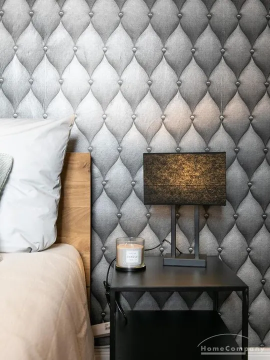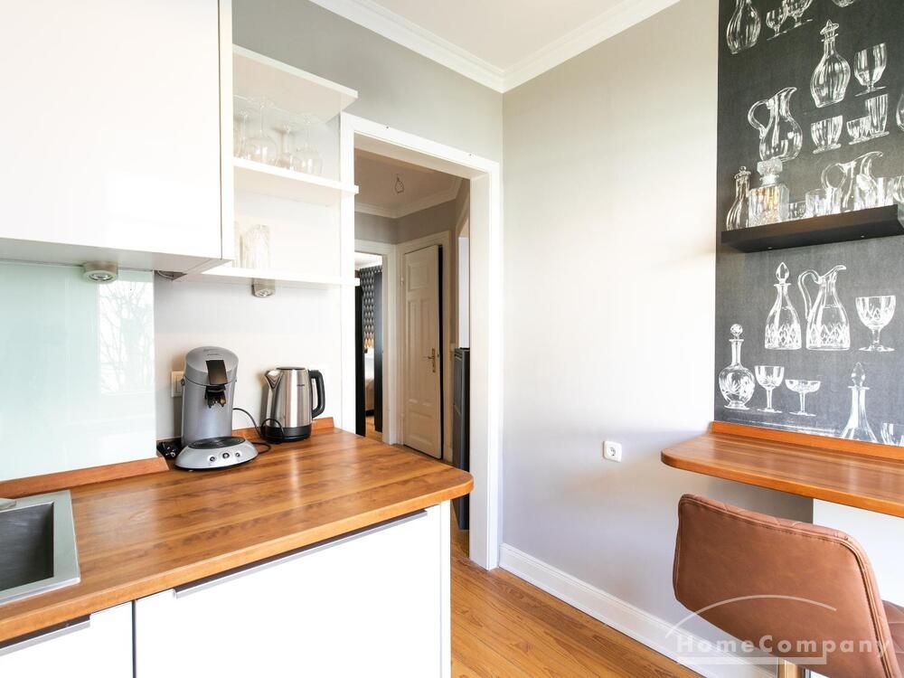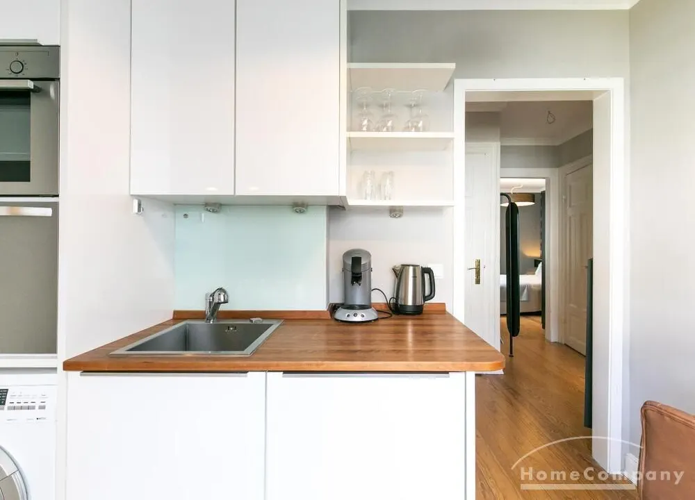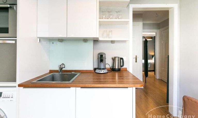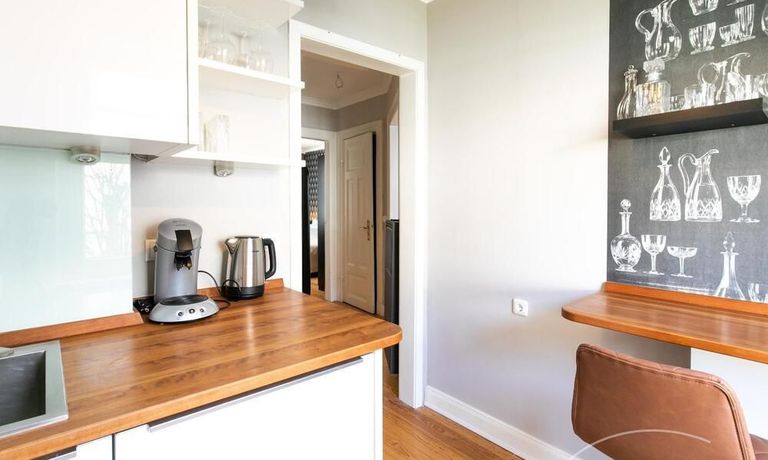 Das Herzstück des Wohnzimmers ist das klassische Chesterfield Sofa mit einem Bezug aus dunkelblauem Samt. Akzente in Silber verleihen den Räumen besondere Eleganz. Ein silberner Barwagen ist mit Karaffen und Whiskygläsern dekoriert. Dieses Motiv wird mit dem Motiv der Tapete in der Küche weitergeführt. Ein Frühstückstresen mit Barhockern steht zur Verfügung. Das Schlafzimmer verfügt über ein 1,60 m breites Holzbett und einen großen Kleiderschrank mit viel Stauraum. Das separate WC ist mit grauen Metrofliesen gestaltet.