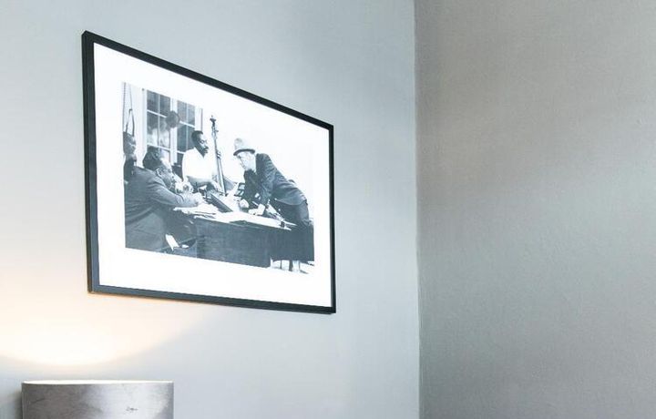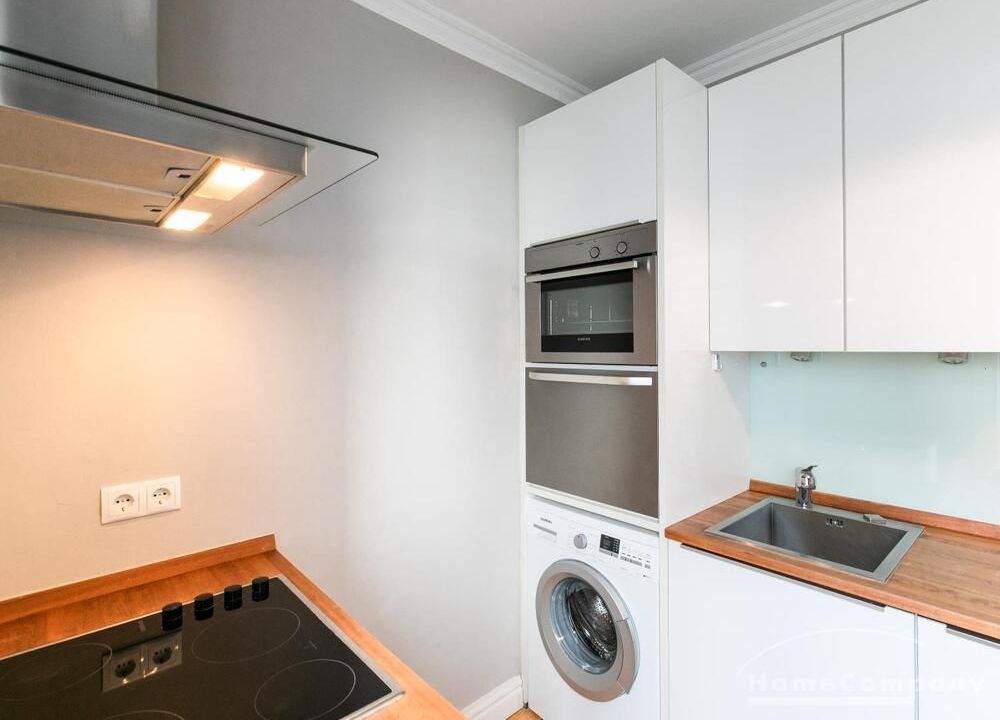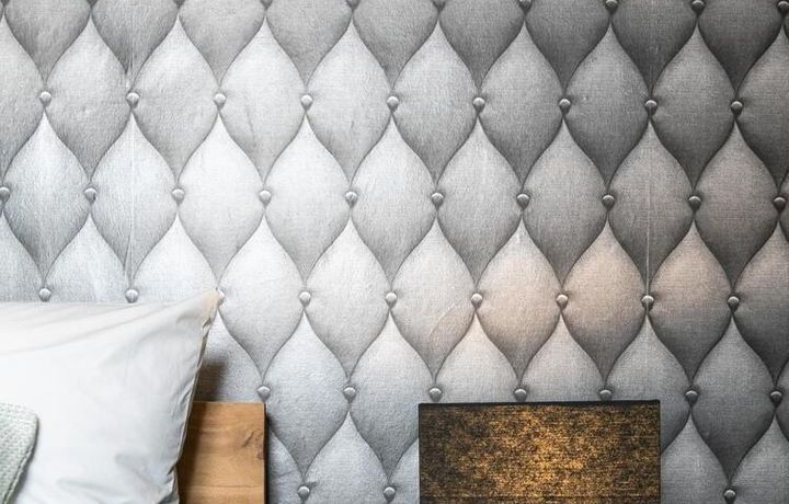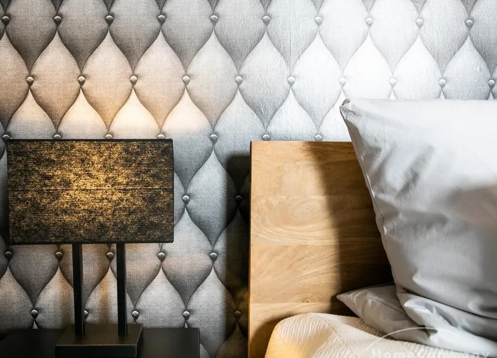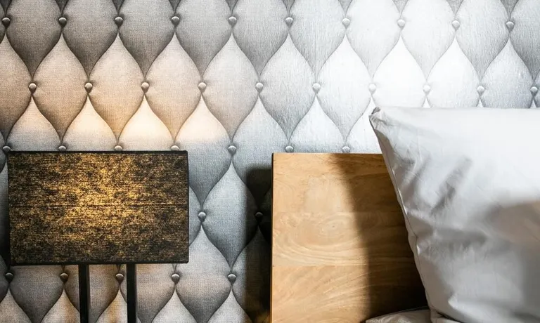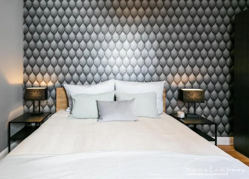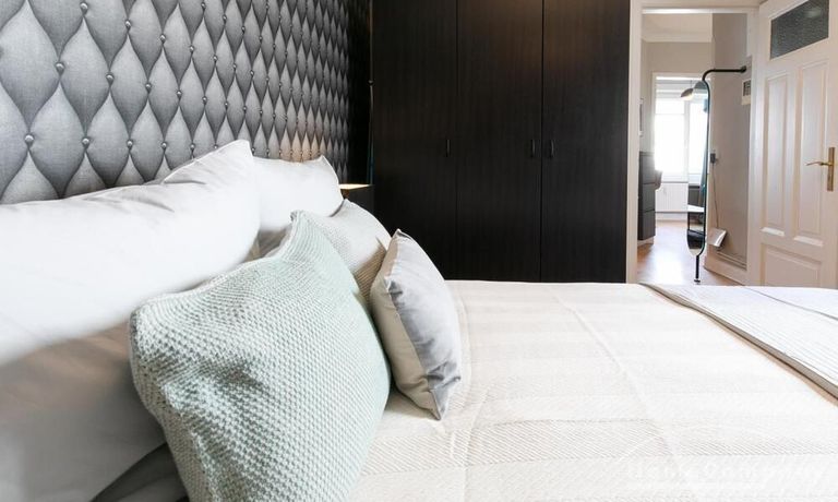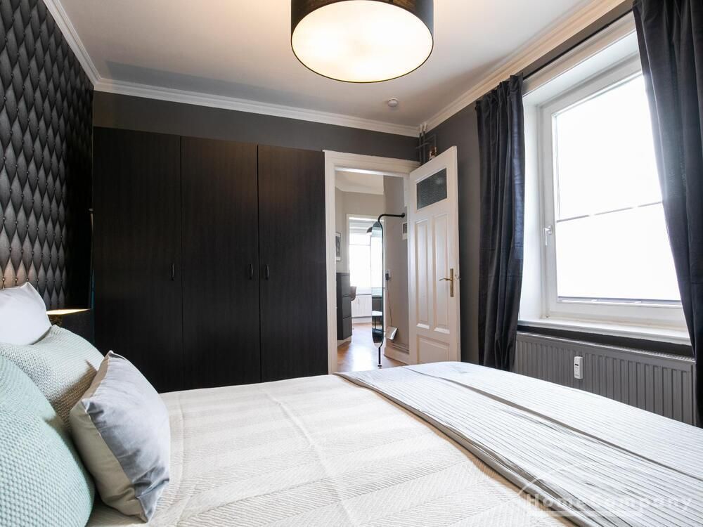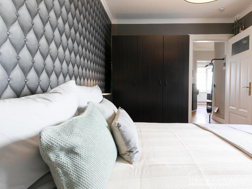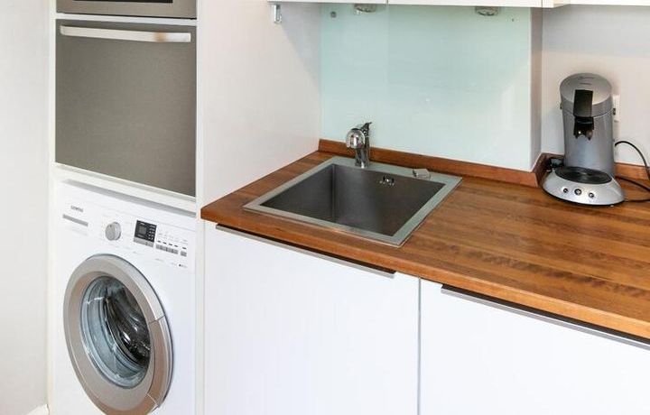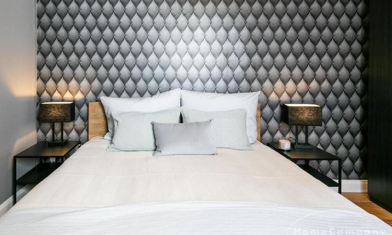 Das Herzstück des Wohnzimmers ist das klassische Chesterfield Sofa mit einem Bezug aus dunkelblauem Samt. Akzente in Silber verleihen den Räumen besondere Eleganz. Ein silberner Barwagen ist mit Karaffen und Whiskygläsern dekoriert. Dieses Motiv wird mit dem Motiv der Tapete in der Küche weitergeführt. Ein Frühstückstresen mit Barhockern steht zur Verfügung. Das Schlafzimmer verfügt über ein 1,60 m breites Holzbett und einen großen Kleiderschrank mit viel Stauraum. Das separate WC ist mit grauen Metrofliesen gestaltet.