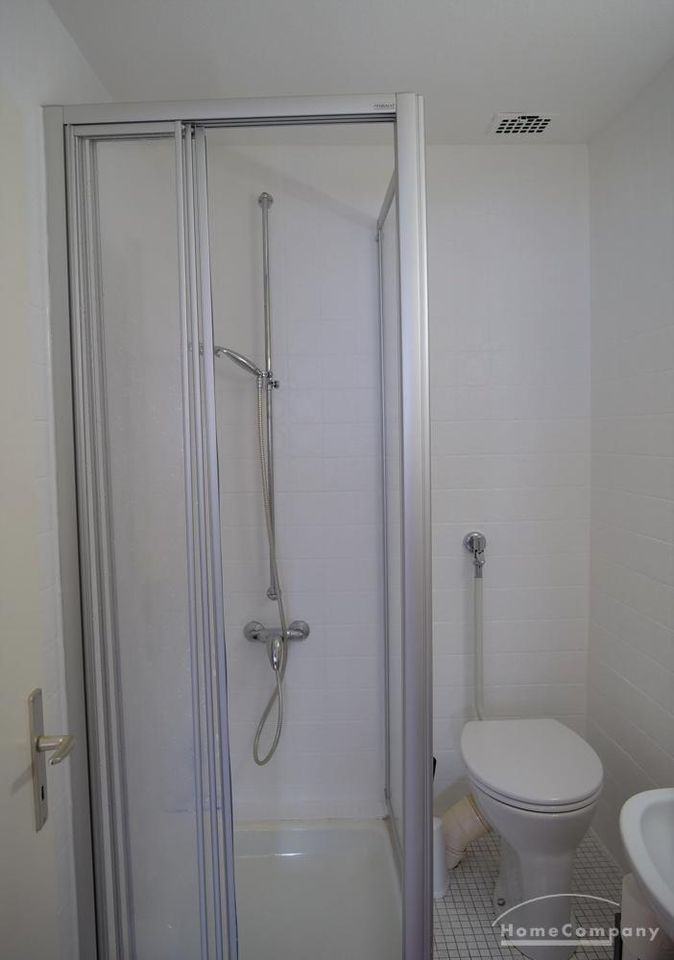+ Bad mit Dusche, Toilette und Waschbecken;