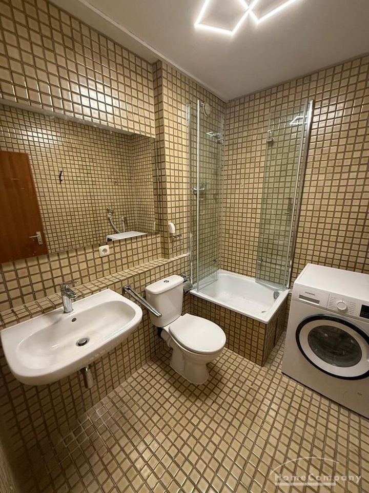 Helles Bad mit Duschkabine und Waschmaschine.