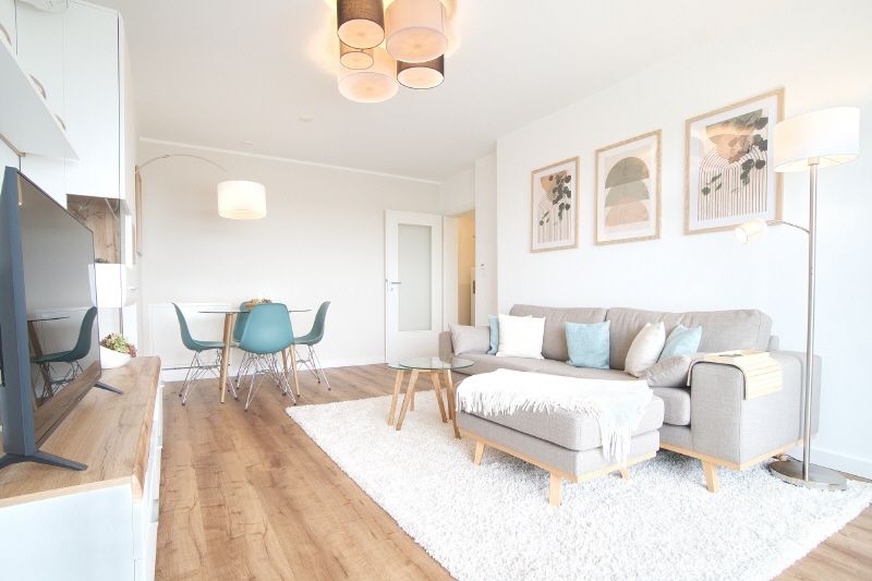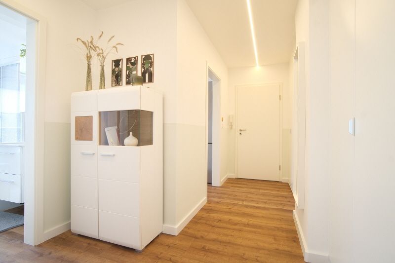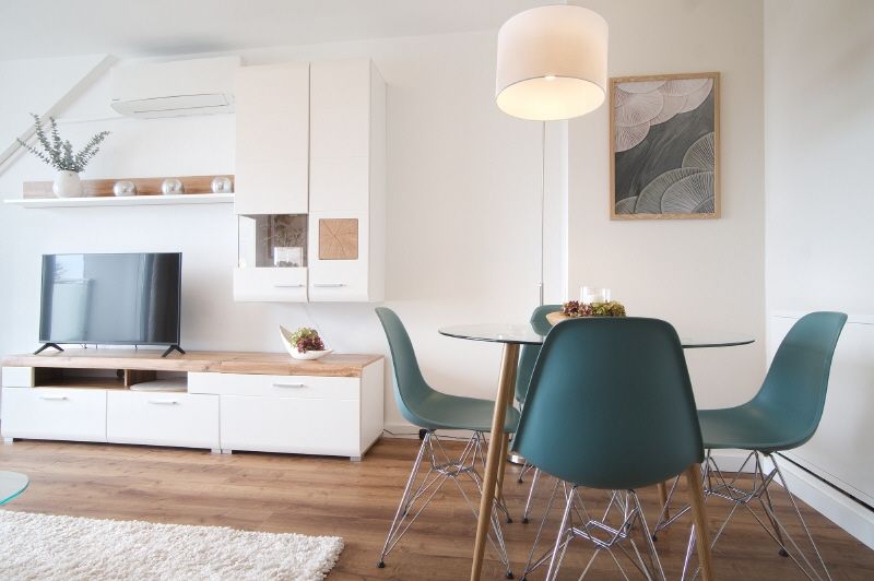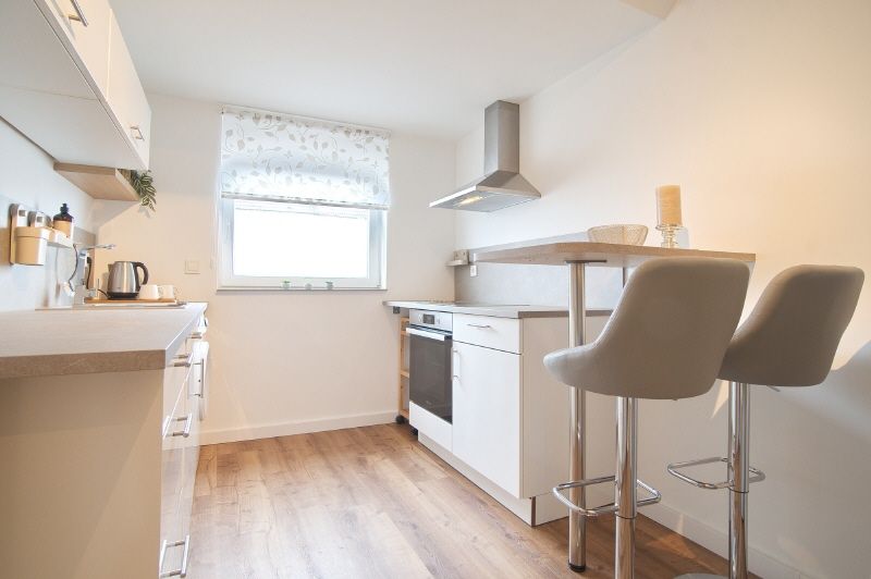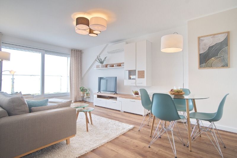 Gehobene und vollständige Ausstattung. Highlights sind z.B. der schöne, helle Wohnraum mit möbliertem Balkon mit elektrischer Markise, das neue Badezimmer und die moderne Küche – komplett ausgestattet – mit Hochtisch und Hochstühlen und einer Einbauküche inklusive Spülmaschine. Die Wohnung hat eine Fußbodenheizung und eine Klimaanlage. Das Wohnzimmer mit Sofa, internetfähigem Kabel-TV und einem Esstisch mit vier Stühlen möbliert. Im Schlafzimmer steht ein Boxspring-Doppelbett bereit. Diele mit Garderobe und Kleiderschrank. Internetzugang ist mit 250 Mbit möglich. Die Wohnung verfügt über eine eigene Waschmaschine, ein Trockner und ein Trockenraum im Keller des Hauses können genutzt werden.