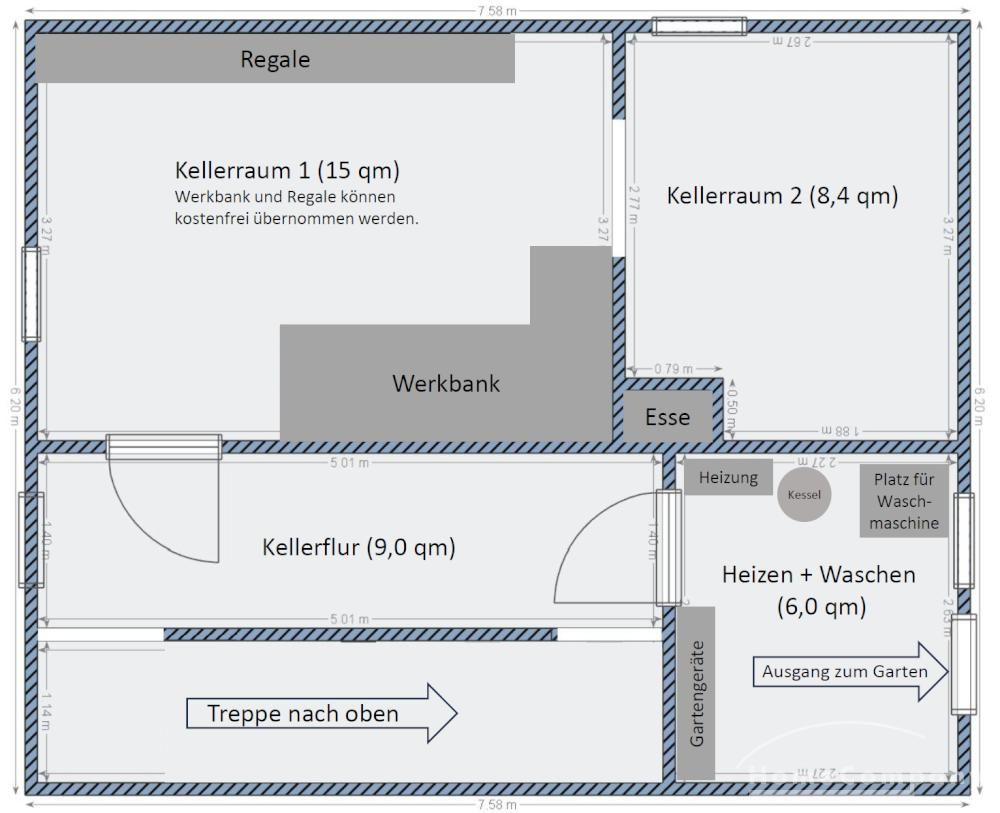Der Nutzfläche im Keller beträgt ca. 38 m², die Gartengeräte, die Werkbank und die Regale im Keller können kostenfrei übernommen werden