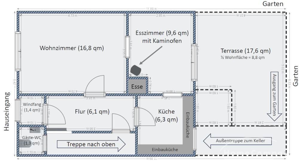 Im Erdgeschoss befindet sich die Küche inklusive Einbauküche sowie das Wohn- und Esszimmer. Vom Esszimmer aus ist die Terrasse begehbar.