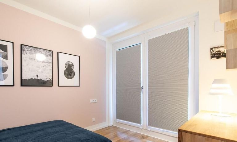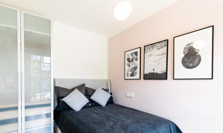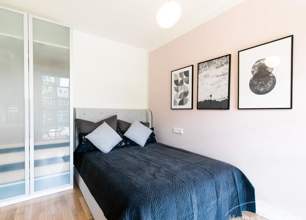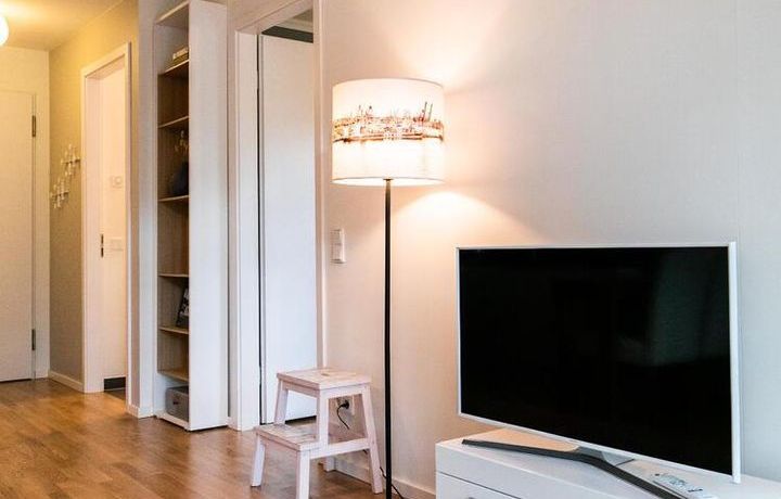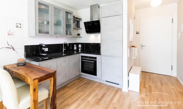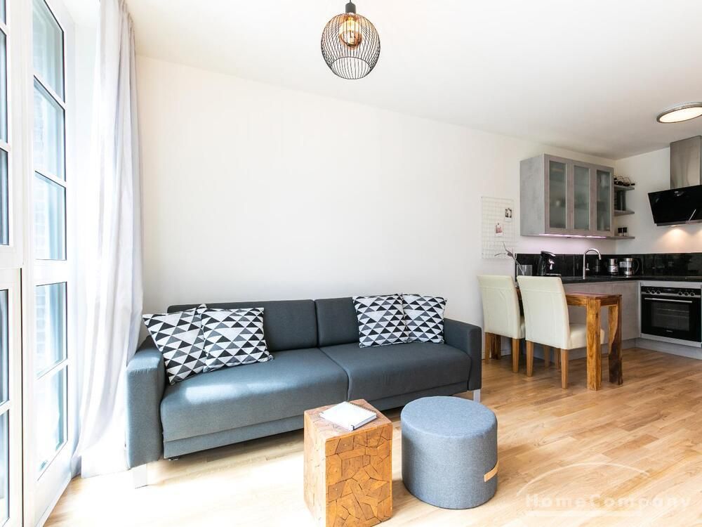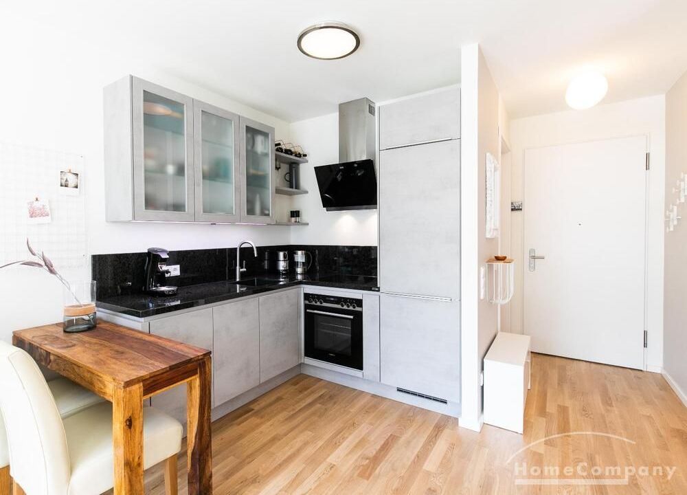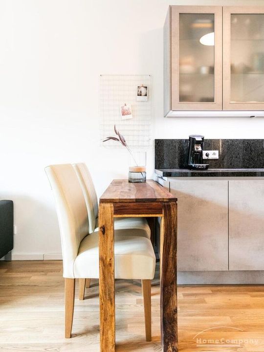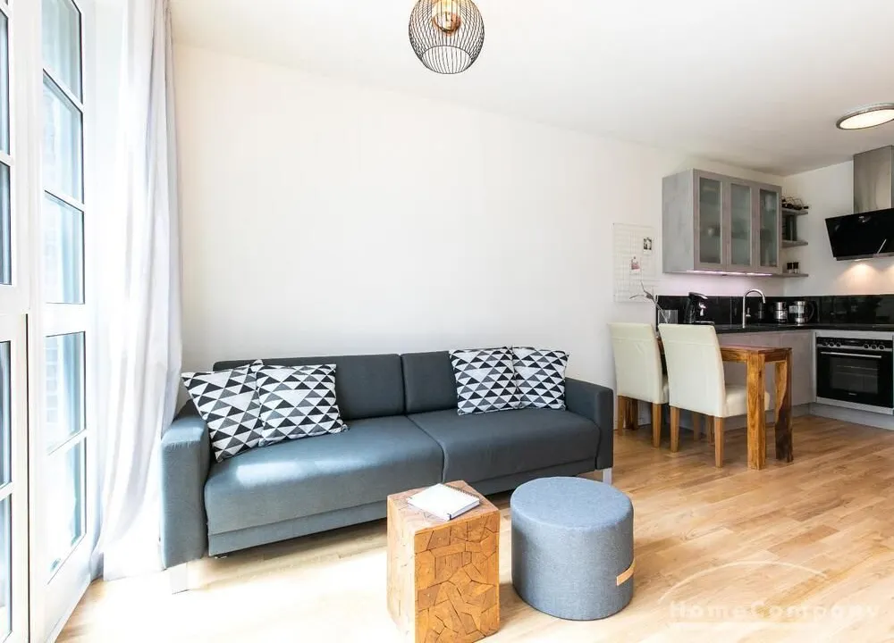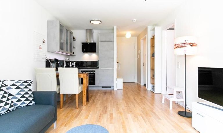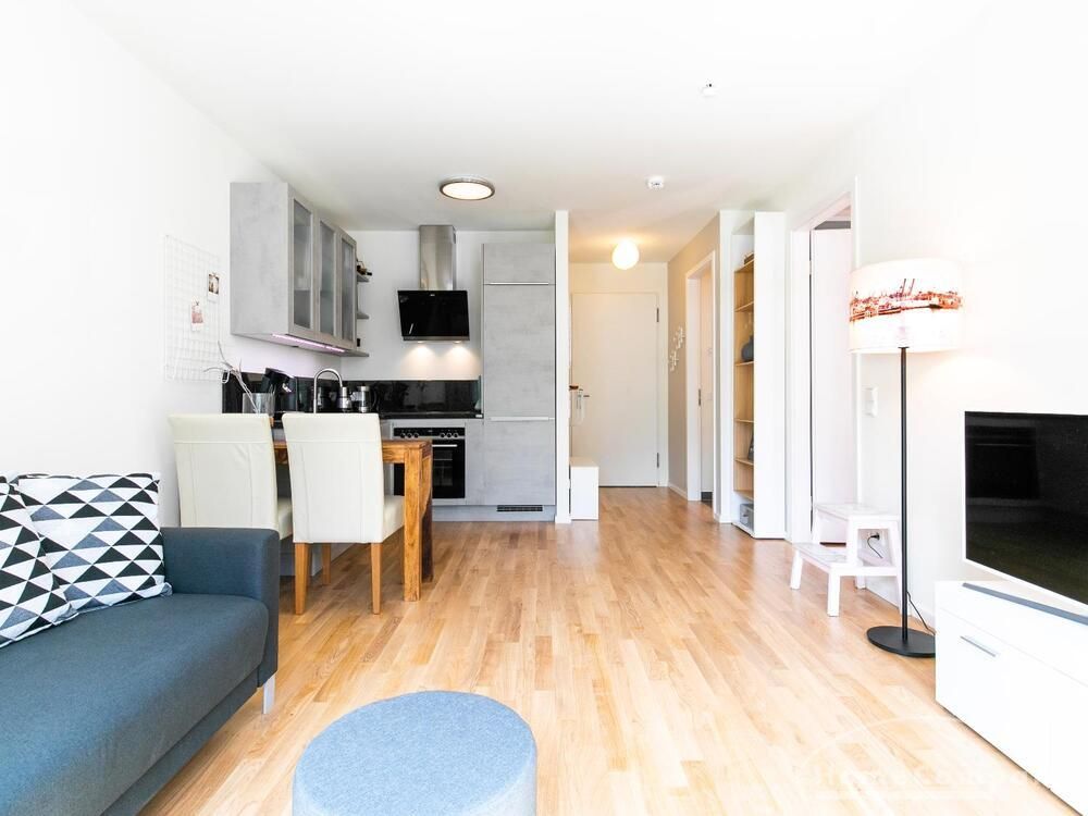 Die Küche ist zum Wohnraum hin offen. Zwischen dem Wohnbereich und der Küche steht ein komfortabler Esstisch. Das Schlafzimmer ist mit einem 1,40 m breiten Bett ausgestattet. Eine Abstellkammer bietet in der Wohnung zusätzlichen Stauraum.