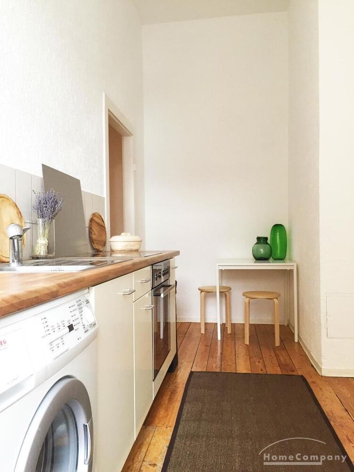 Die Wohnung verfügt über ein gefliestes Tageslichtbad mit Badewanne, eine moderne Einbauküche inkl. Waschmaschine, einen großen Esstisch im Wohnzimmer, originalen Holzdielenboden, einen großen Flur und einen großen und geräumigen Wandschrank.