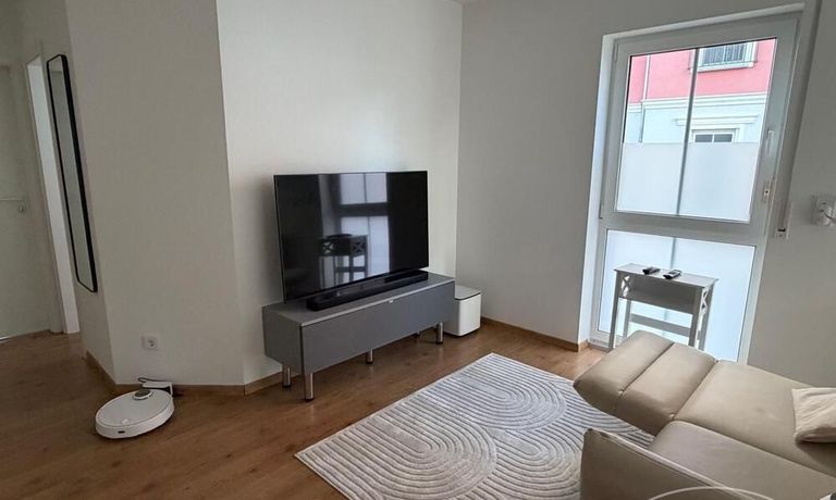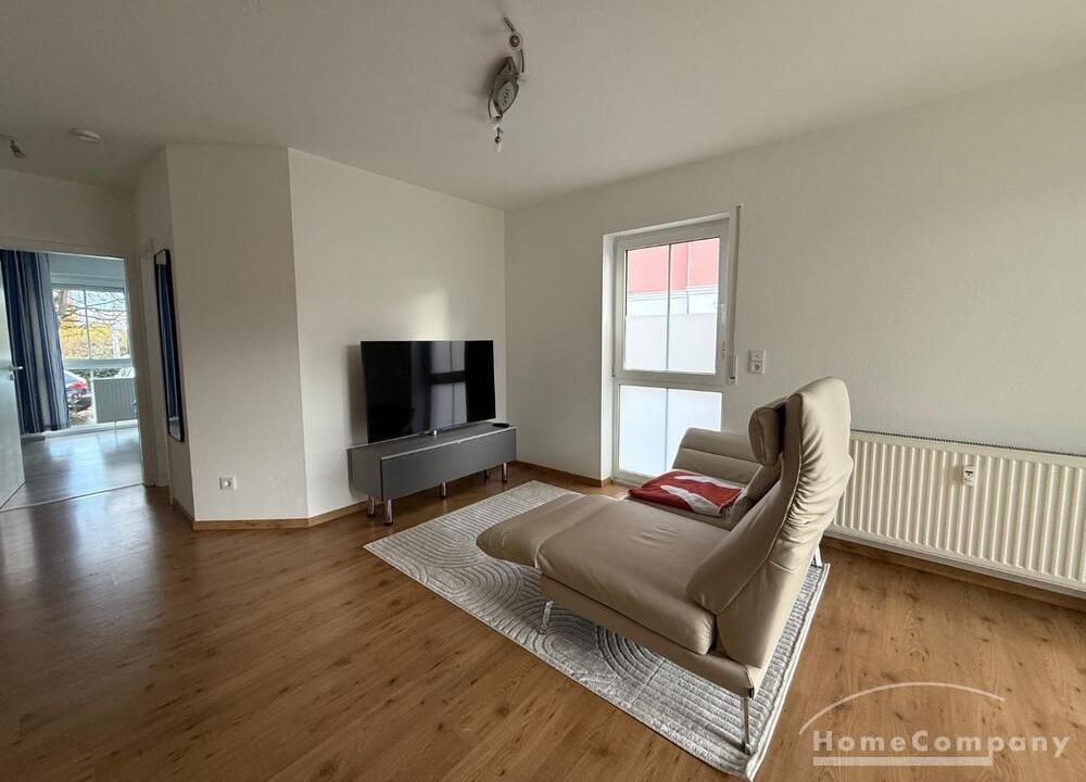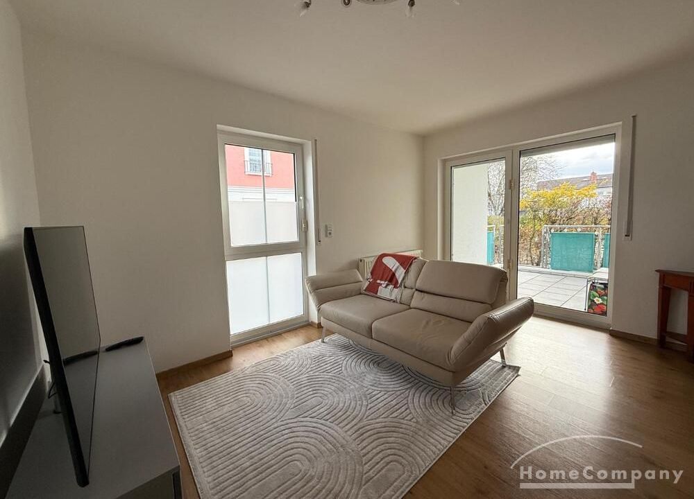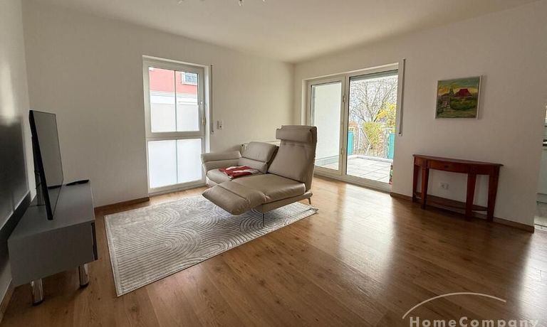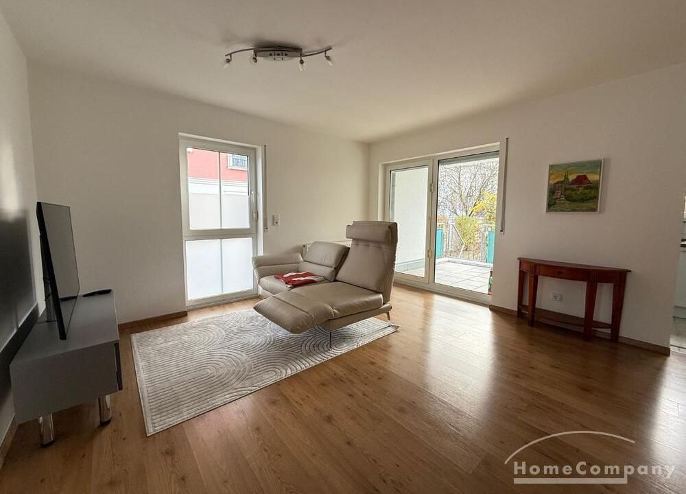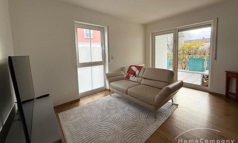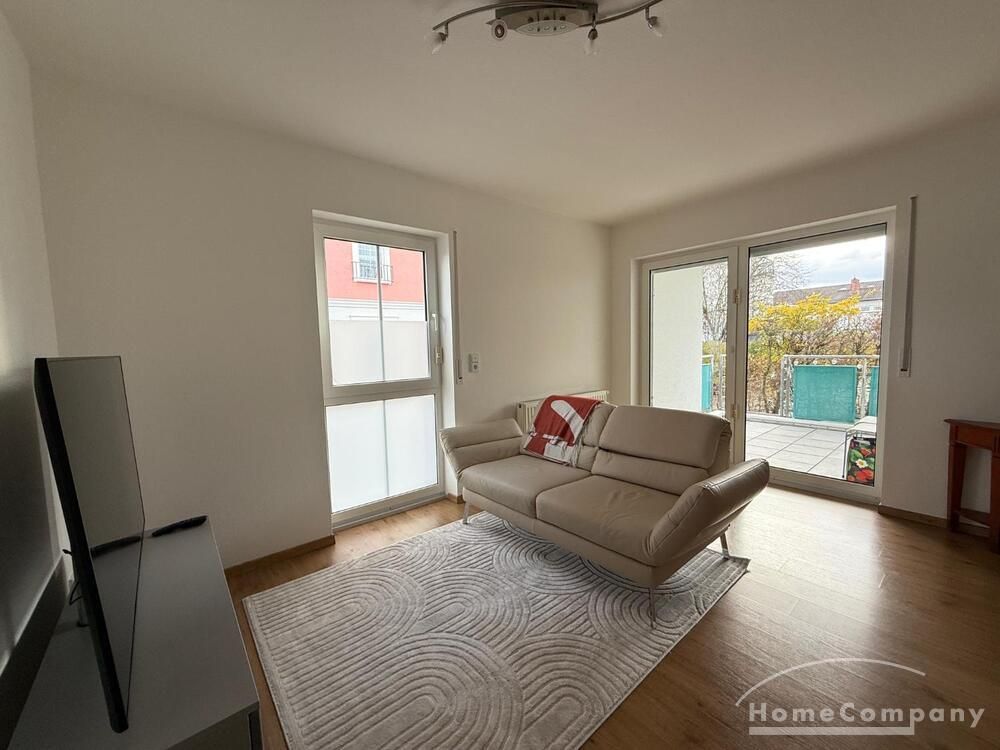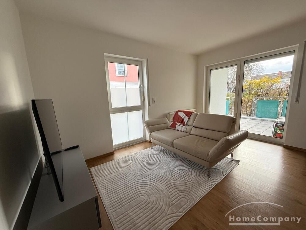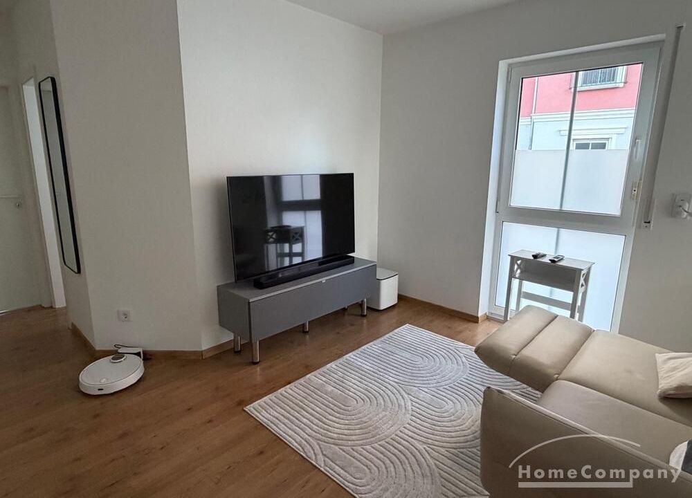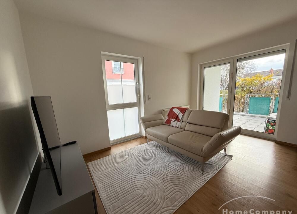 Wohnen: helles Wohnzimmer mit Sofa, TV und Zugang zur Terrasse