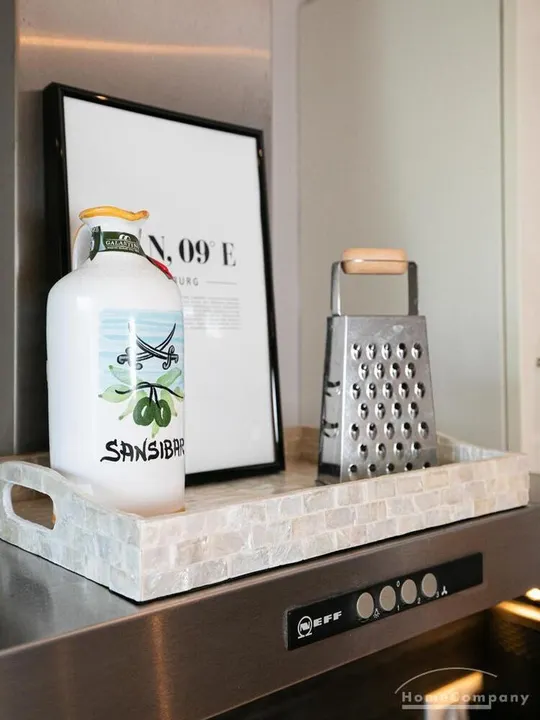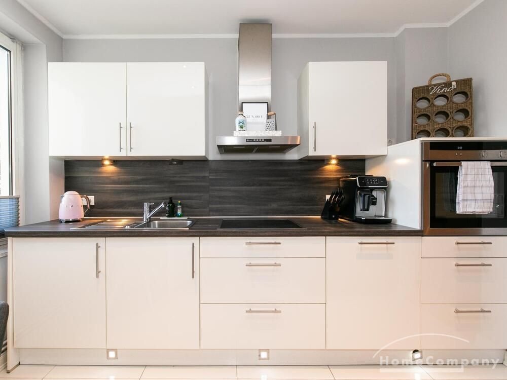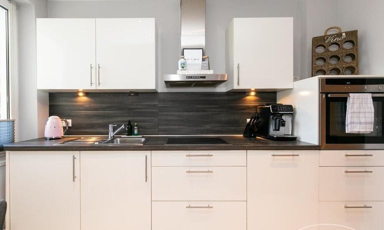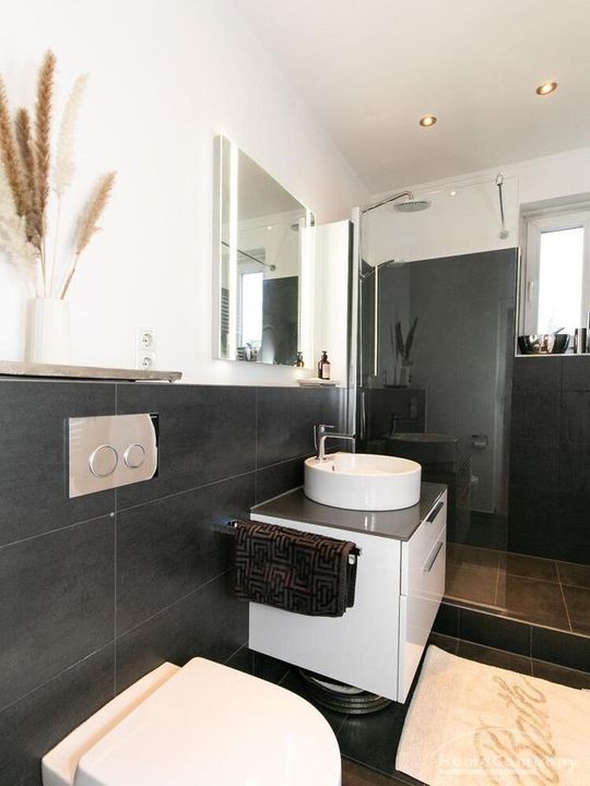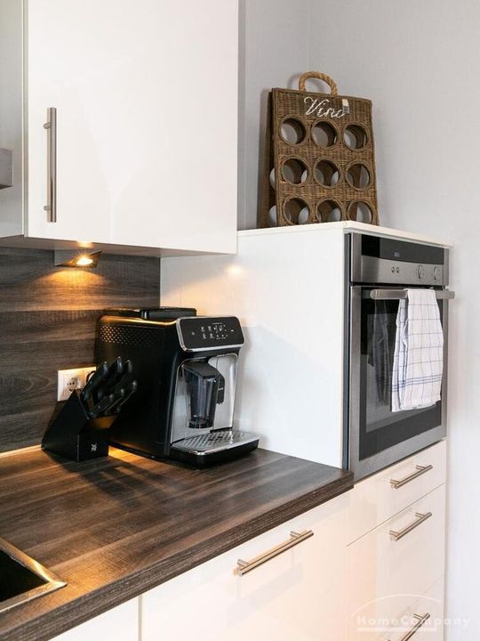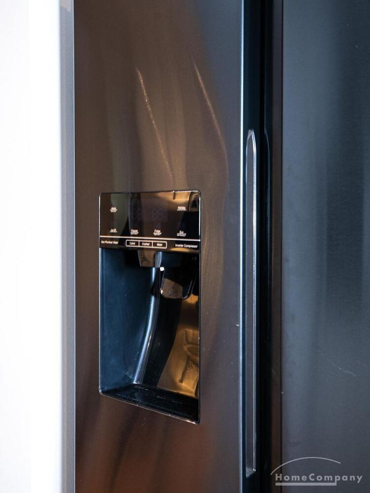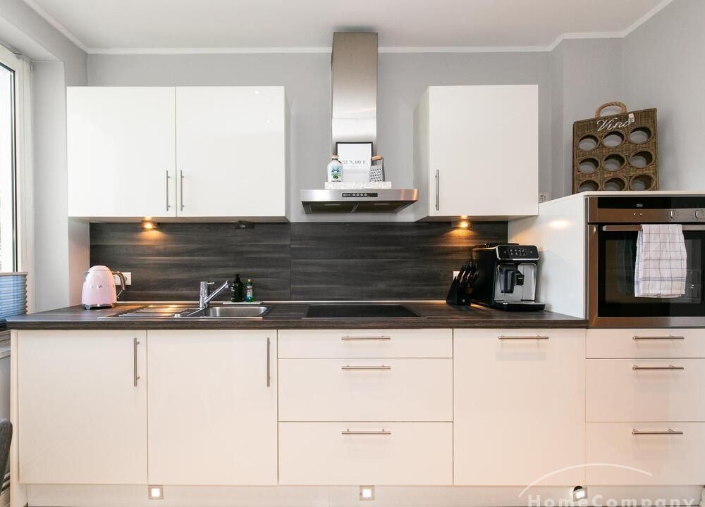 Die moderne, gut ausgestattete Einbauküche bietet alles, was das Kochen angenehm macht und ist mit einem besonders großen Kühl- und Gefrierschrank mit zusätzlichem Eiswürfelbereiter ausgestattet. Ein besonderes Highlight ist der weiße hochglänzende Fußboden, besonders im Zusammenspiel mit der individuell schalt- und dimmbaren Beleuchtung der Arbeitsfläche und im Sockelbereich. Ein kleiner Frühstücksplatz steht ebenso zur Verfügung wie eine, durch eine weiße Schiebetür abgeteilte, Vorrats- und Abstellkammer. Das Bad ist mit großformatigen anthrazitfarbenen Fliesen ausgestattet. Die bodengleiche Dusche ist mit einer Glastrennwand versehen.