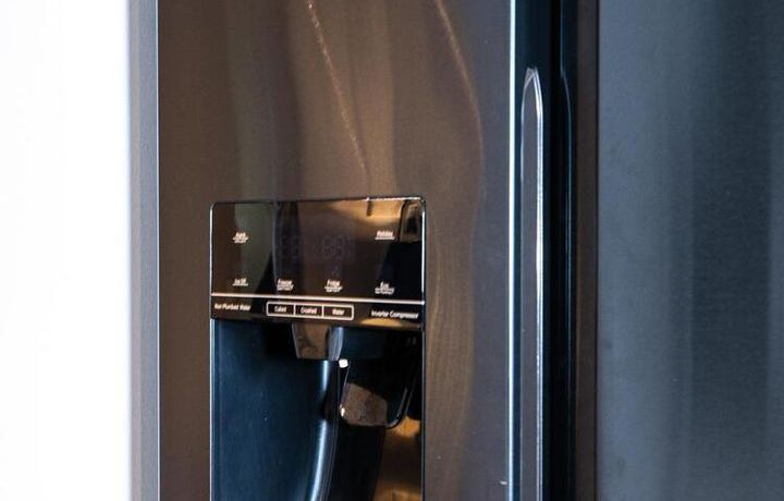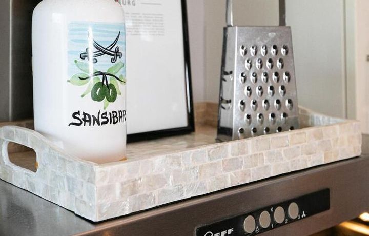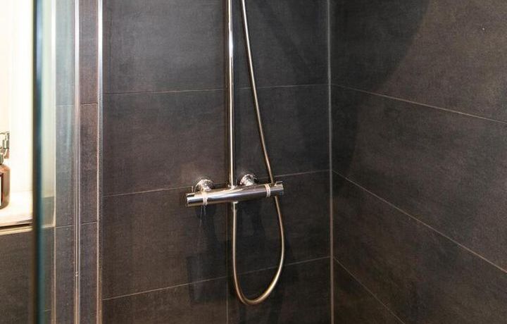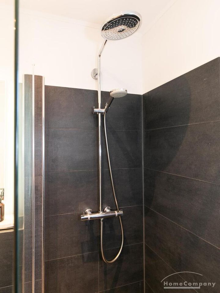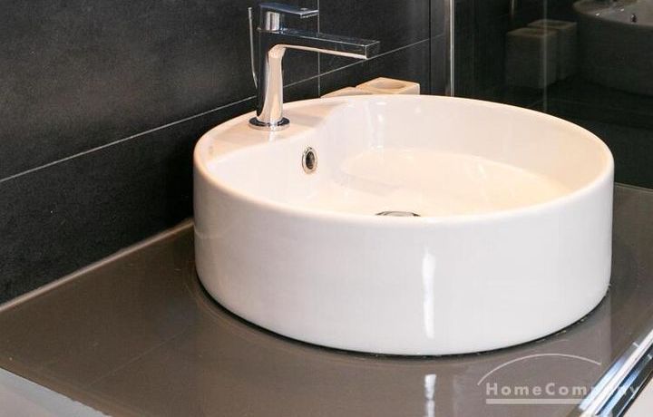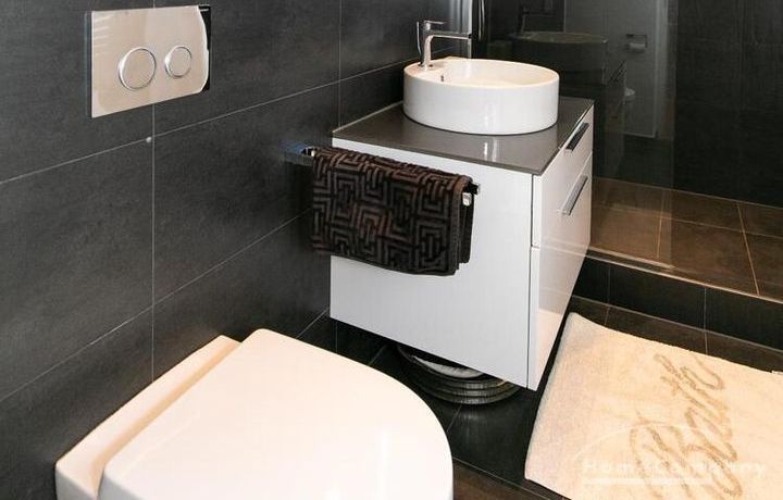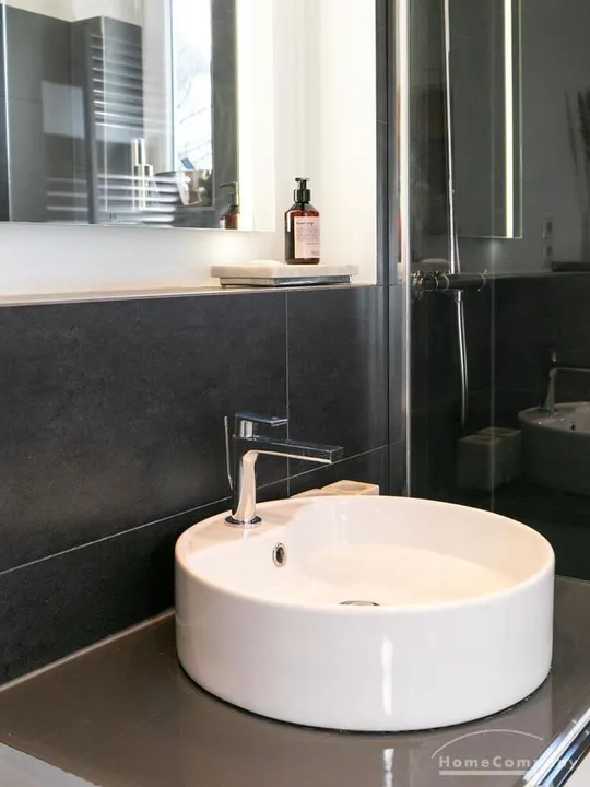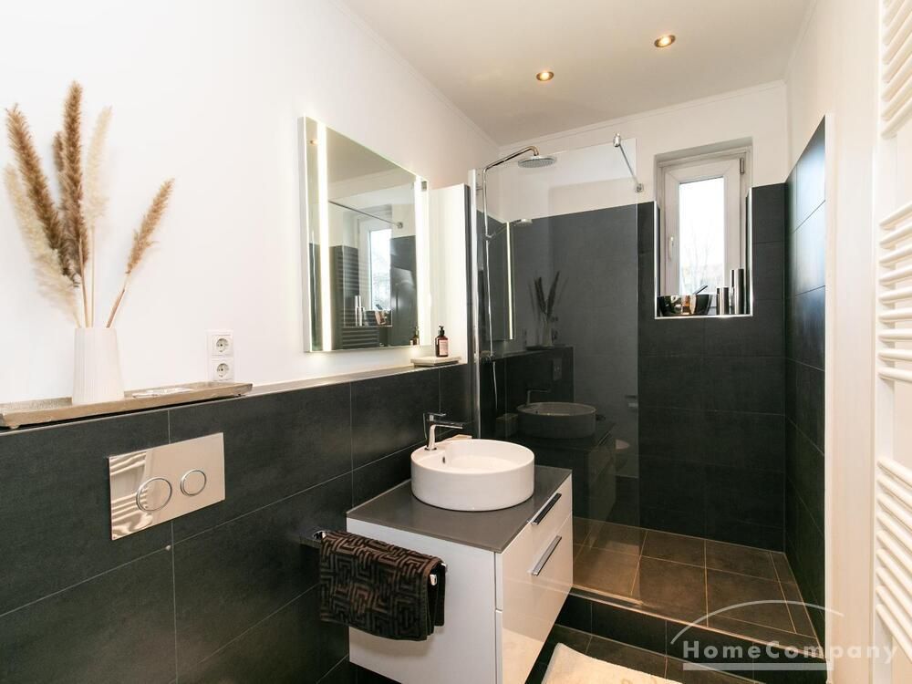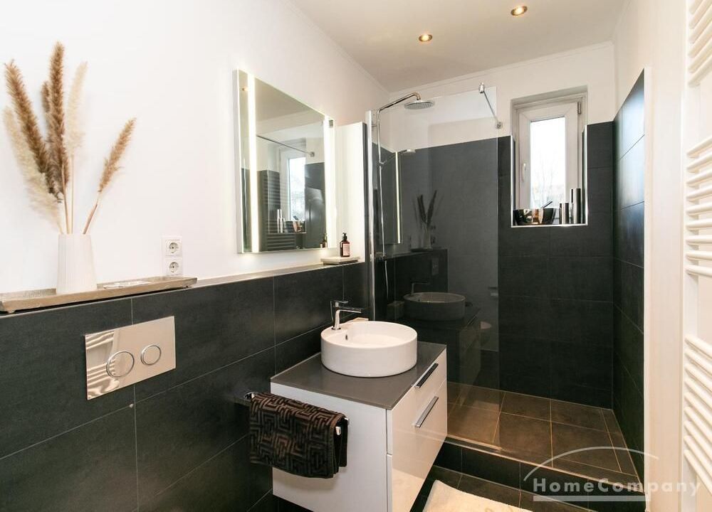 Die moderne, gut ausgestattete Einbauküche bietet alles, was das Kochen angenehm macht und ist mit einem besonders großen Kühl- und Gefrierschrank mit zusätzlichem Eiswürfelbereiter ausgestattet. Ein besonderes Highlight ist der weiße hochglänzende Fußboden, besonders im Zusammenspiel mit der individuell schalt- und dimmbaren Beleuchtung der Arbeitsfläche und im Sockelbereich. Ein kleiner Frühstücksplatz steht ebenso zur Verfügung wie eine, durch eine weiße Schiebetür abgeteilte, Vorrats- und Abstellkammer. Das Bad ist mit großformatigen anthrazitfarbenen Fliesen ausgestattet. Die bodengleiche Dusche ist mit einer Glastrennwand versehen.