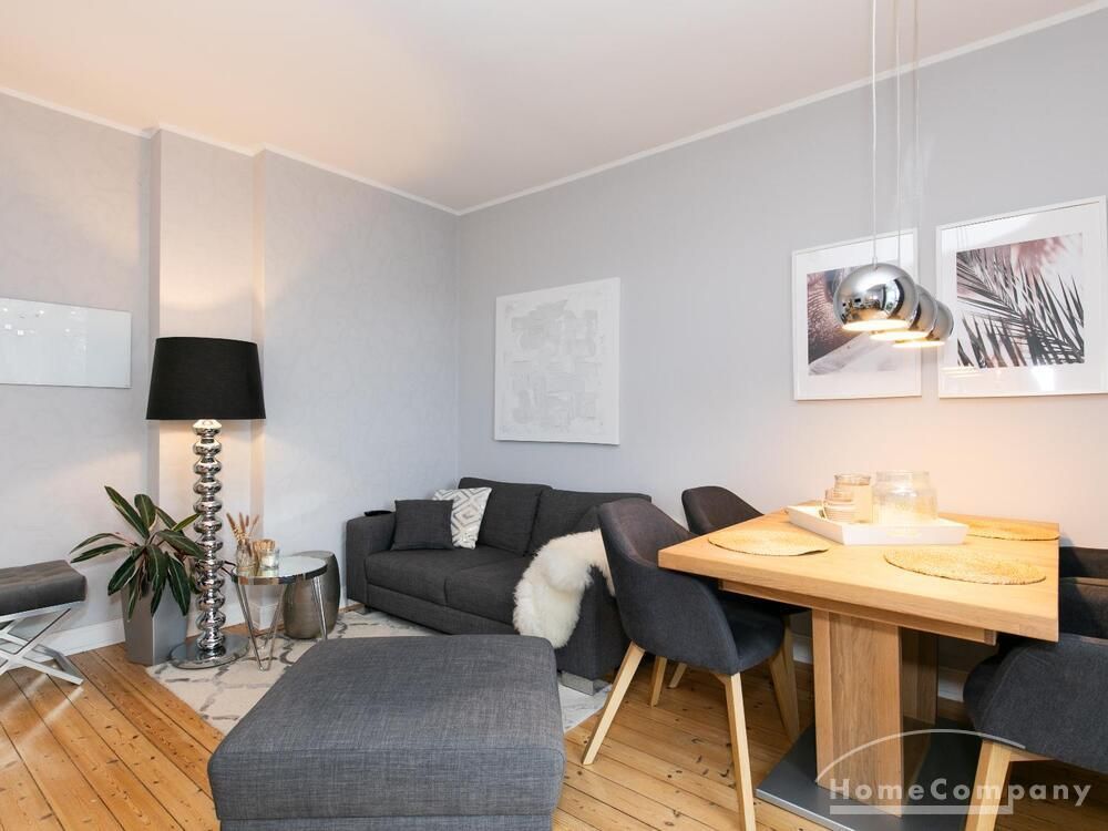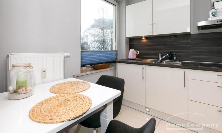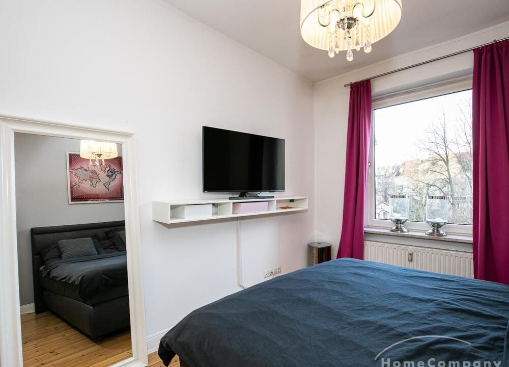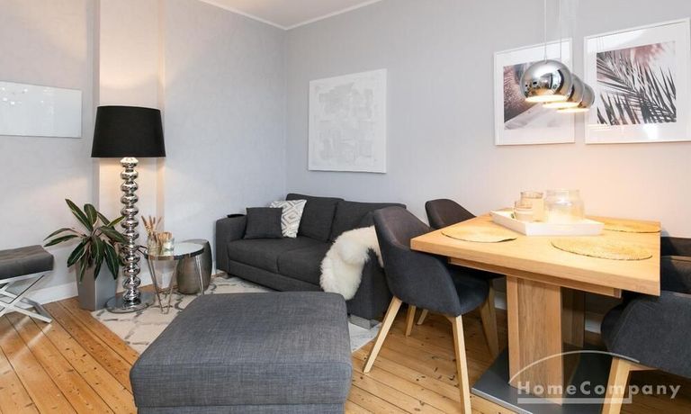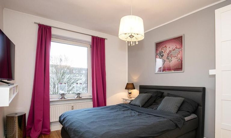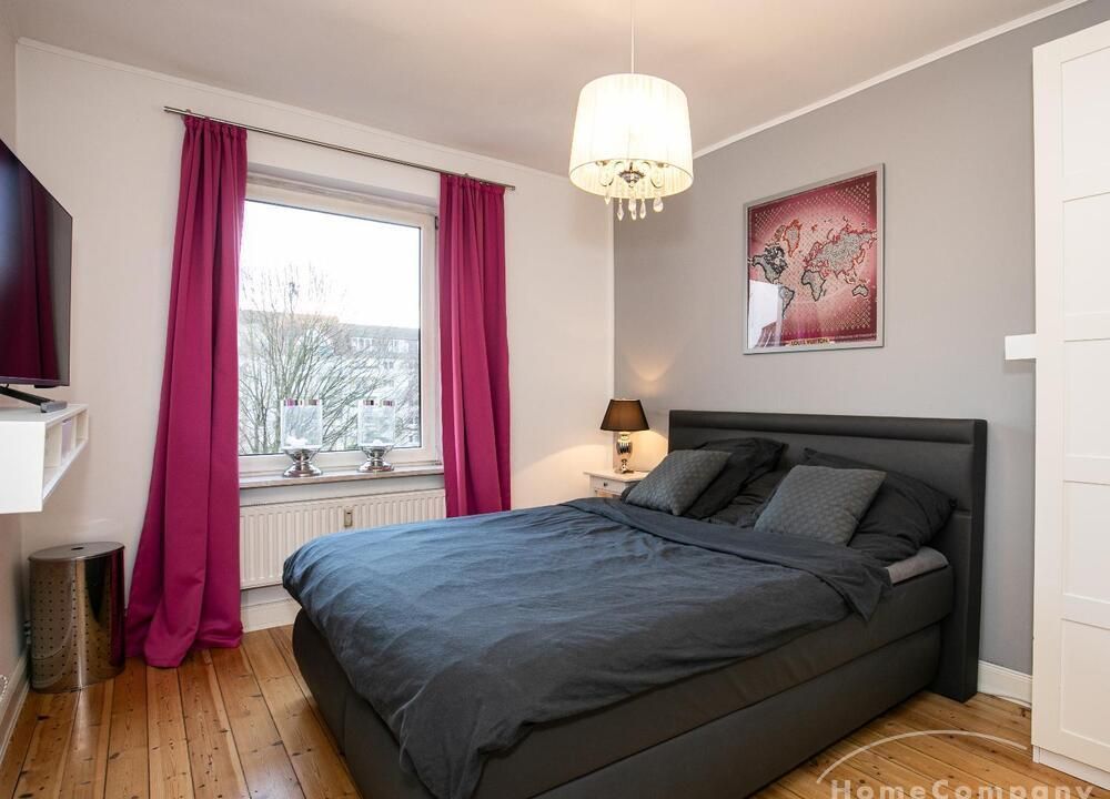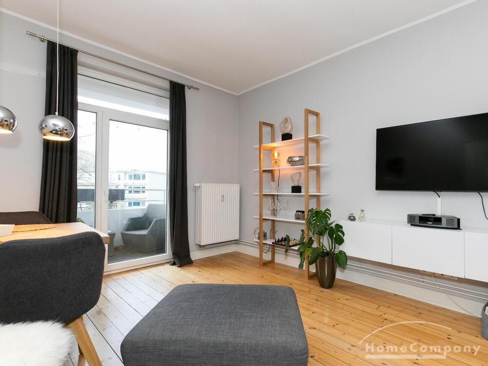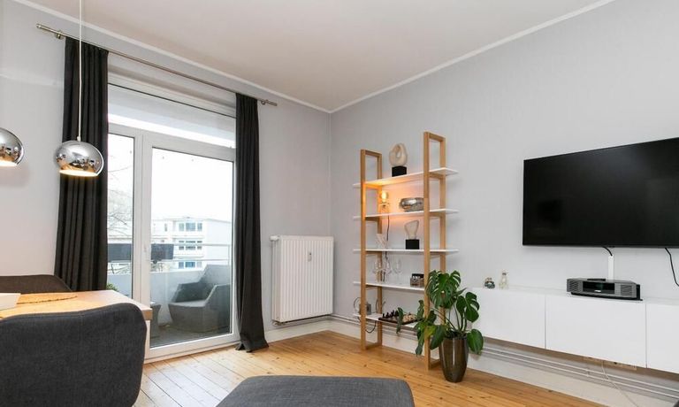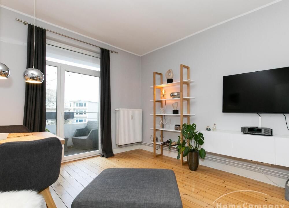 Perfekt ausgestattete Wohnung in einer guten Wohnlage in Winterhude. Die Wohnung ist modern in dezenten Farbtönen eingerichtet und geschmackvoll und schön dekoriert. Im Wohnzimmer steht ein Esstisch mit einer 4 cm dicken Eichenplatte für bis zu 4 Personen bereit. Vom Sofa aus blickt an auf den XXL-TV (Diagonal 1,67 m, Breite= 1,45m Höhe= 0,83 m,smart-TV fähig). Weiterhin steht ein einladender Balkon mit 2 kleinen Loungesesseln und einem Beistelltisch zur Verfügung. Das Schlafzimmer ist mit einem 1,60m breiten Doppelbett und reichlich Schrankfläche sowie einem TV ausgestattet.