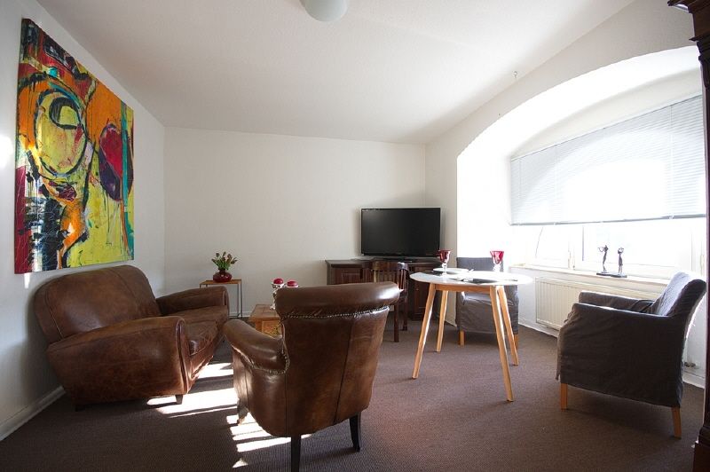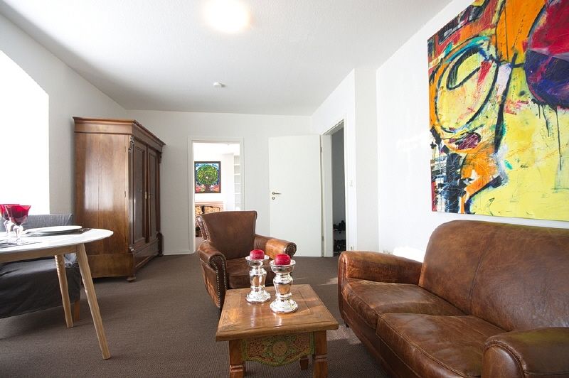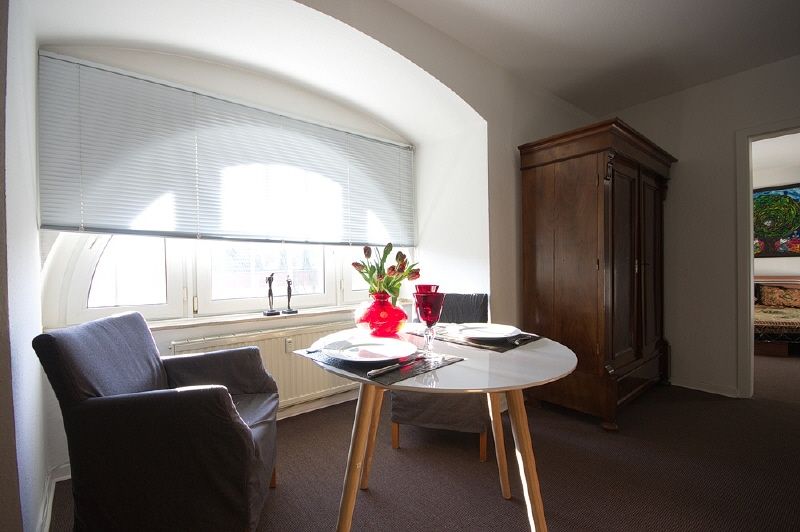 Stilvolle Einrichtung, vollständige Ausstattung inklusive Wäsche und Geschirr. Der Wohnraum verfügt über eine Leder-Sitzgarnitur und einen großen Flachbild-Fernseher, der Essbereich am Fenster ist für zwei Personen ausgestattet. Das Schlafzimmer bietet ein 1,40m großes Bett, einen Kleiderschrank und ein Regal, weiterhin gibt es eine optisch abgeteilte Nische mit kleiner Kochgelegenheit, Kühlschrank und Stauraum. Ein modernes und schön gestaltetes Duschbad gehört zur Wohnung. Eine Waschmaschine steht für zwei Apartments im Haus zur Nutzung bereit.
