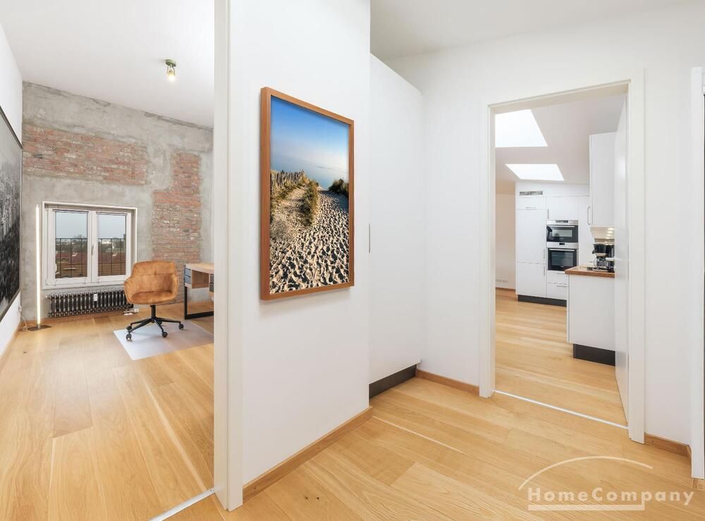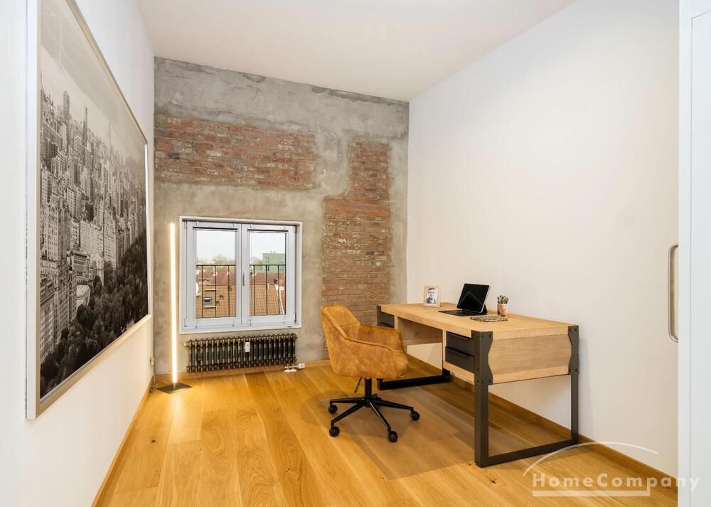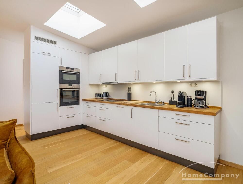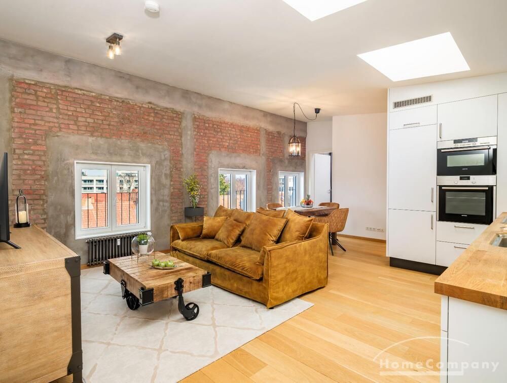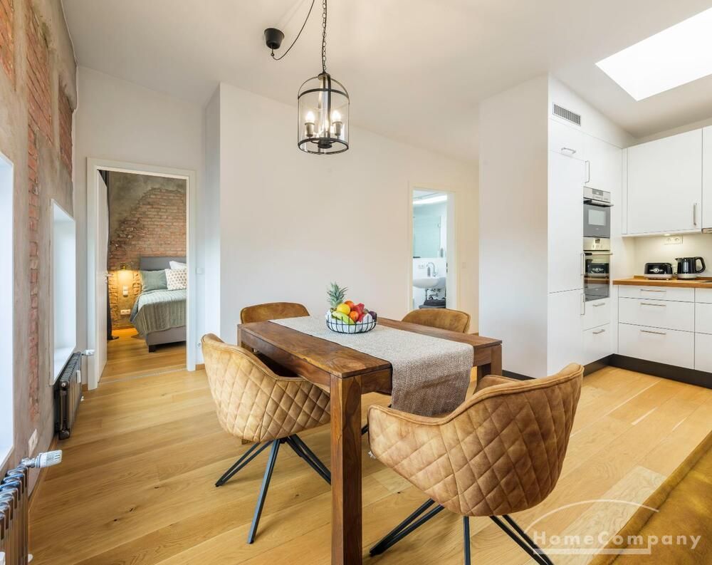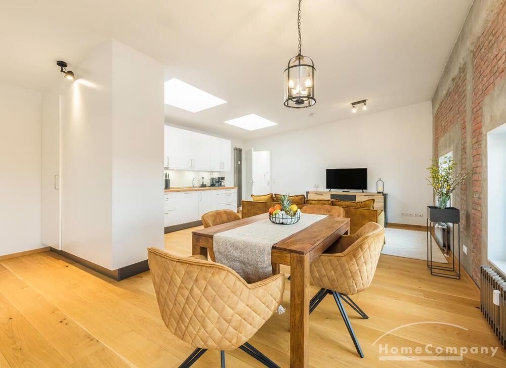 Urbanes Loft-Flair im sanierten Altbau, kombiniert mit zeitgemäßem Wohnkomfort und stilvoller Einrichtung. Sichtbare Backsteinwände, helle Räume, hochwertige Materialien und Parkettböden verleihen der Wohnung einen besonderen Charakter. Der offene Wohn- und Essbereich mit Einbauküche bildet das Herzstück, ergänzt durch ein Schlafzimmer mit Boxspringbett sowie ein separates Arbeits- oder Gästezimmer.