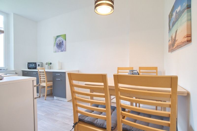 Komplett eingerichtet und ausgestattet im Frühjahr 2023, feste Bodenbeläge (PVC). Evtl. Nutzung eines Internetzugangs möglich. Offene Küche mit Spülmaschine, Cerankochfeld, Microwellen-Grill-Kombination, Kühlschrank mit Eisfach, Senseo-Kaffeemaschine sowie Geschirr und Kochutensilien. Ein Esstisch für bis zu vier Personen steht bereit. Ansprechend gestaltetes Duschbad mit Handtuchheizung und Spiegelschrank.Das Schlafzimmer ist mit einem teilbaren Doppelbett, Kleiderschrank, Kommode und TV-Gerät (internetfähig) eingerichtet. Waschmaschine und Trockner stehen als Gemeinschaftsgeräte zur Nutzung im Keller des Hauses zur Verfügung, bei Nutzung sind € 15 pro Monat zzgl. zu zahlen.