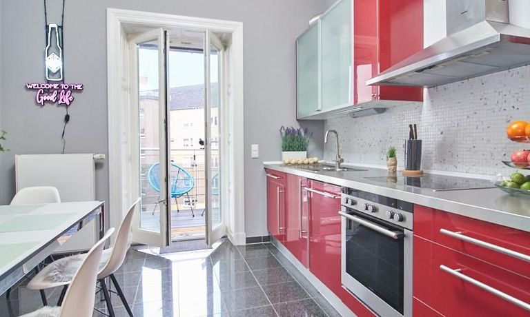 Die Wohnung verfügt über drei vollständig eingerichtete Schlafzimmer, die beide ein ruhiges und harmonisches Wohnambiente bieten. Das sehr große Badezimmer bietet sowohl Wanne als auch Dusche. Die moderne Wohnküche bietet viel Platz für gemeinsames Kochen. Der Balkon ist großzügig geschnitten und ergänzt den Wohnbereich. Zur Ausstattung gehören eine Video-Gegensprechanlage sowie hochwertige Miele Geräte, darunter Waschmaschine und Trockner. Ein Abstellraum, ein trockenes Kellerabteil und ein separater Fahrradraum stehen ebenfalls zur Verfügung.