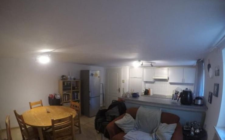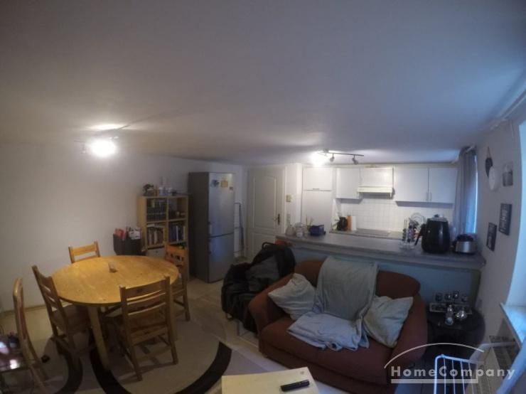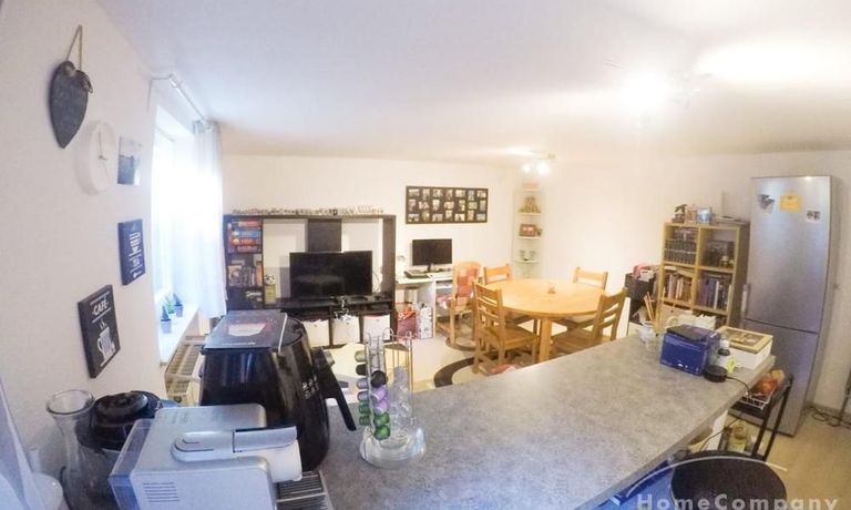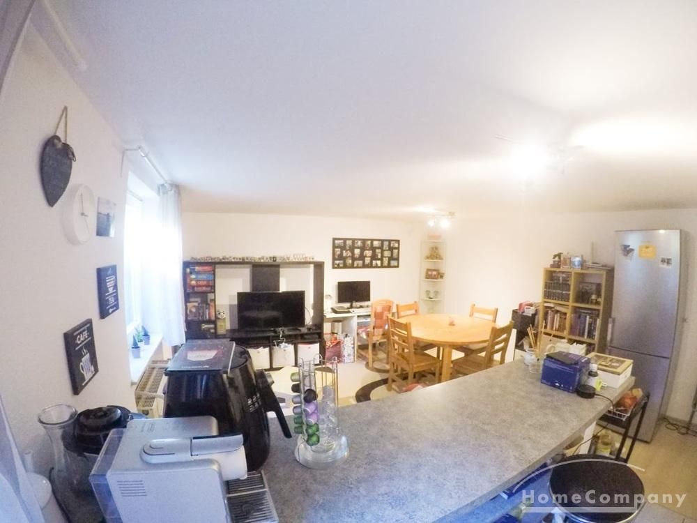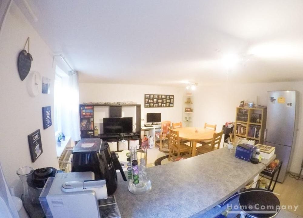 Das Herzstück der Wohnung ist die offene, voll ausgestattete Wohnküche, der Küchenbereich ist clever durch einen Tresen vom Rest des Wohnbereichs abgetrennt. Im Wohnbereich befinden sich zum Beispiel ein gemütlicher Sessel, ein Schreibtisch und sogar noch ein Esstisch.