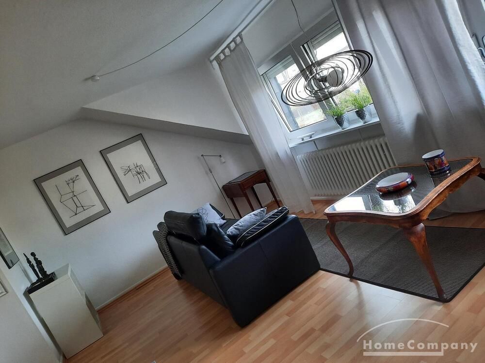 Geschmackvoll eingerichtet. Laminatboden, Doppelbett, großer Kleiderschrank, Sofa, Schreib-Essplatz mit Stühlen.
