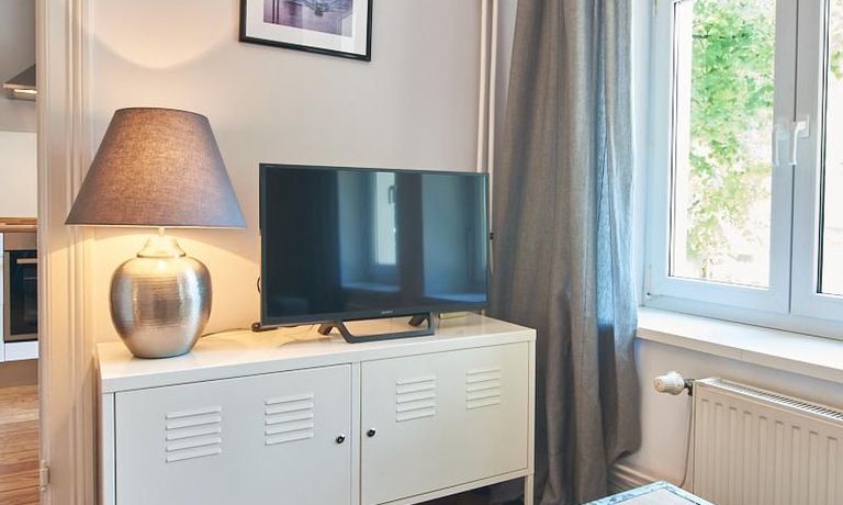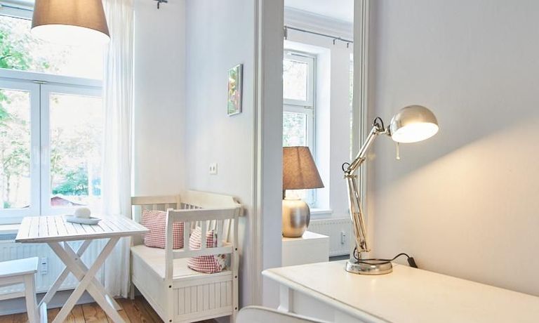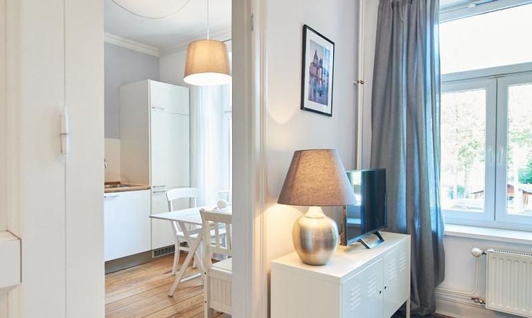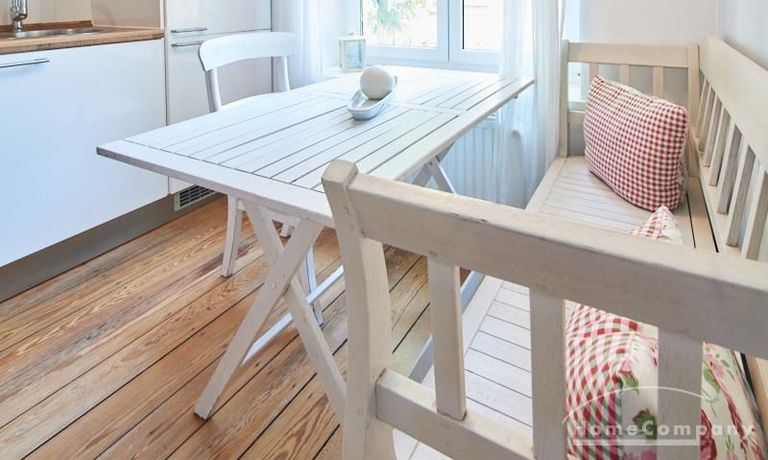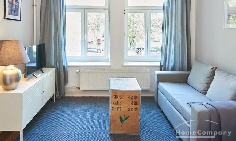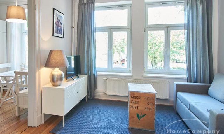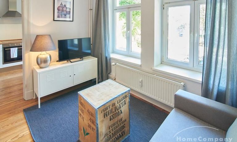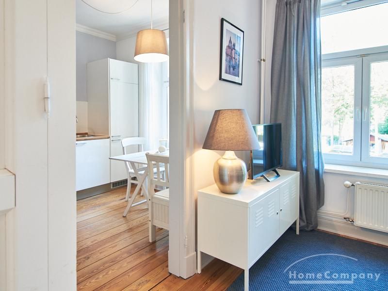 Einfach ausgestattetes 1-Zimmer-Apartment in mit Holzdielenboden. Die große Wohnküche ist mit einer Einbauküche ausgestattet. Zusätzlich stehen ein Essbereich und ein Tisch für ein Notebook zur Verfügung. Der Wohn- / Schlafbereich ist mit einem 1,40 m Bett, einem Kleiderschrank eingerichtet, Sofa , Sideboard und Fernseher eingerichte. Alle Fenster der Wohnung blicken auf den ruhigen, schön gestalteten Straßenraum, die gegenüberliegende Straßenseite ist nahezu unbebaut und bietet einen weiten Blick.