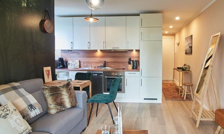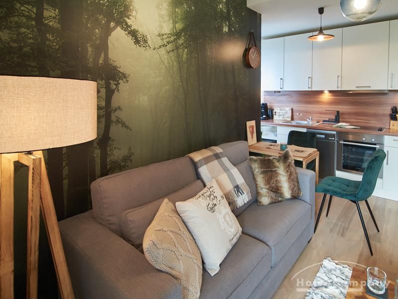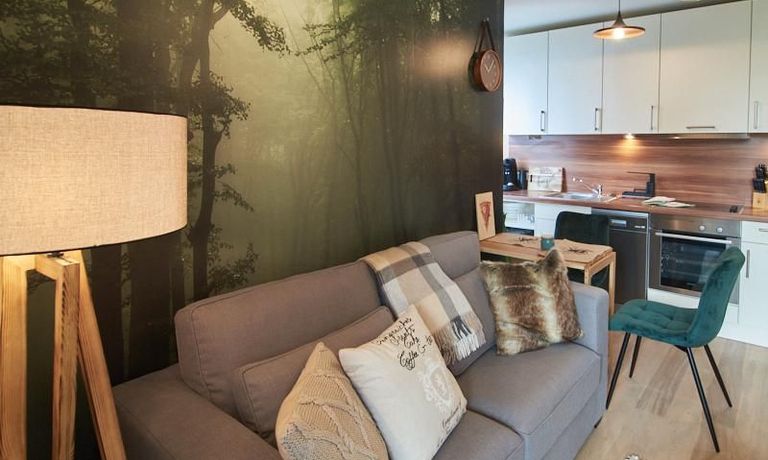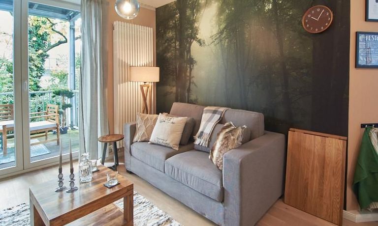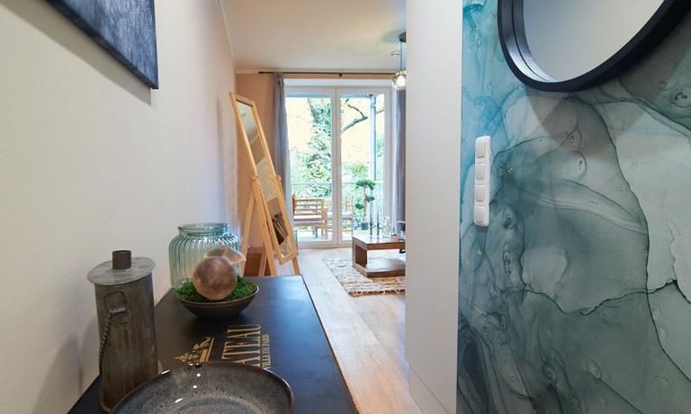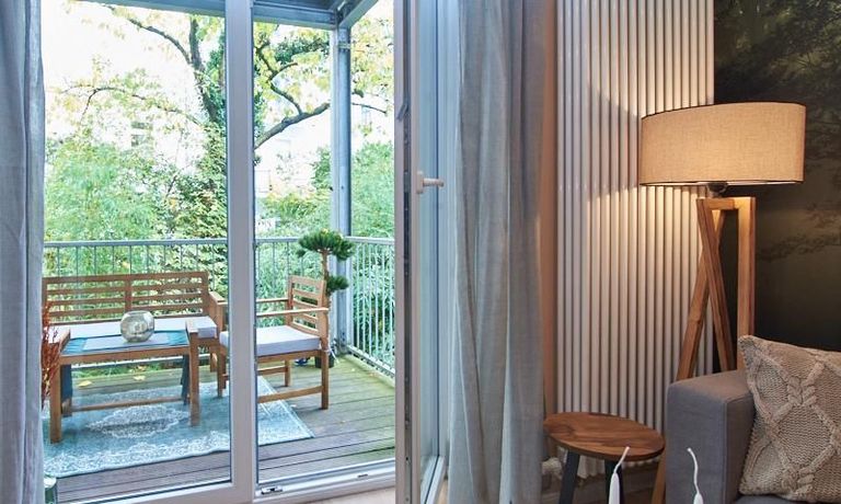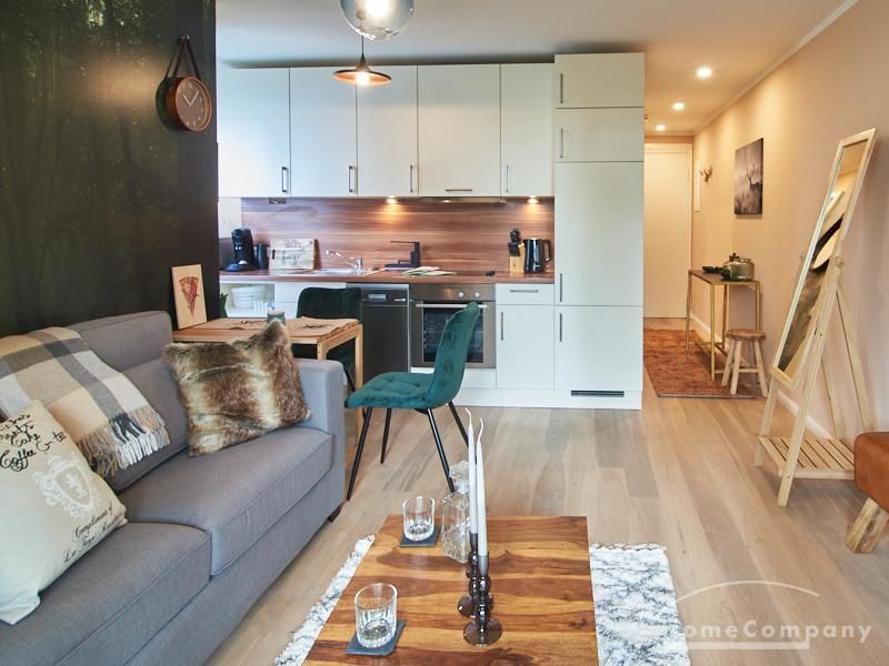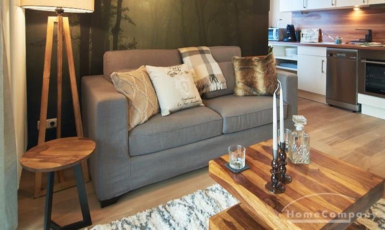 Klare Linien in Kombination mit edlen Naturhölzern geben ein Gefühl von Aufgeräumtheit und Behaglichkeit. Das Wohnzimmer mit der offenen Küche grenzt an den großen, zum Innenhof orientierten, mit einer Loungegarnitur aus Akazienholz ausgestattete Balkon. Hier bietet sich ein wunderschöner Blick in die Baumkronen.